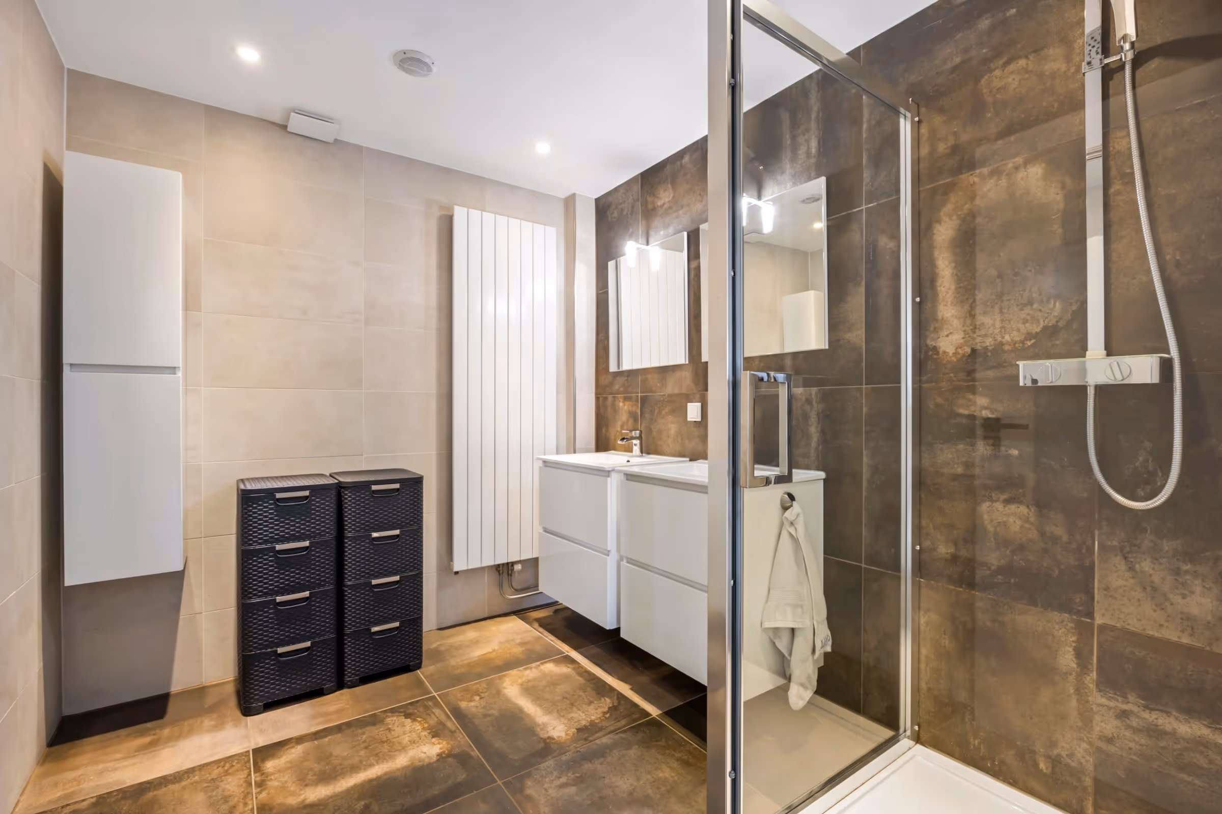 Via de overloop op de 1e verdieping zijn de slaapkamers, 2 moderne badkamers een een apart, extra toilet te bereiken. Alle slaapkamers hebben een uitstekend vloeroppervlak, een keurig niveau van afwerking en de hoofdslaapkamer beschikt over een extra kleedkamer, met inbouwkasten. Het is zelfs mogelijk hier een 6e slaapkamer te realiseren, mocht je 5 nog niet genoeg vinden. De badkamer welke grenst aan de hoofdslaapkamer is het grootst. Deze badkamer heeft een inloopdouche en een wastafelmeubel met dubbele wastafel. De 2e badkamer, gelegen nabij de kinderkamers, heeft een douchecabine en 2 wastafelmeubels. Tenslotte ligt op deze verdieping een apart toilet. Ook op deze verdieping bevindt zich een airconditioning, welke kan koelen en verwarmen.