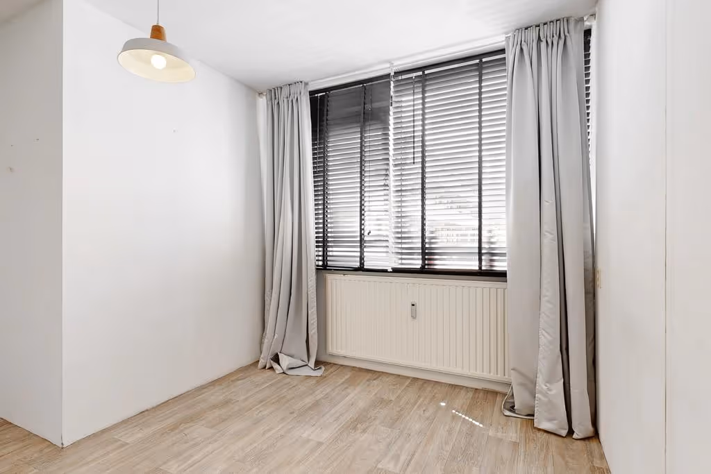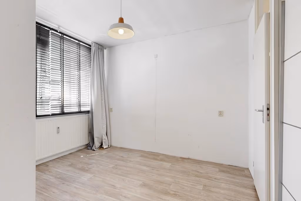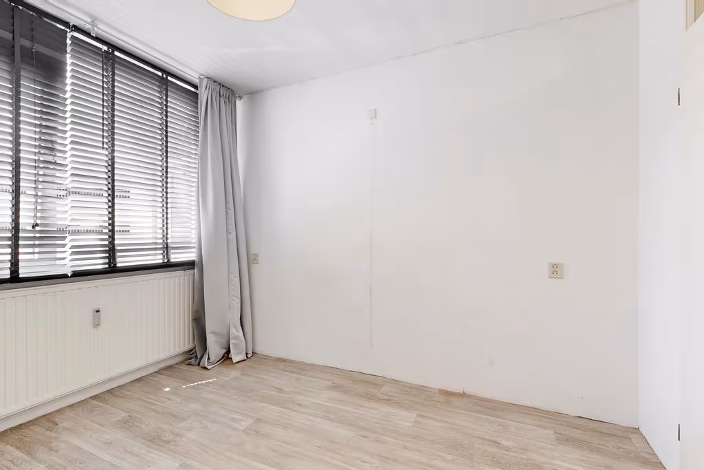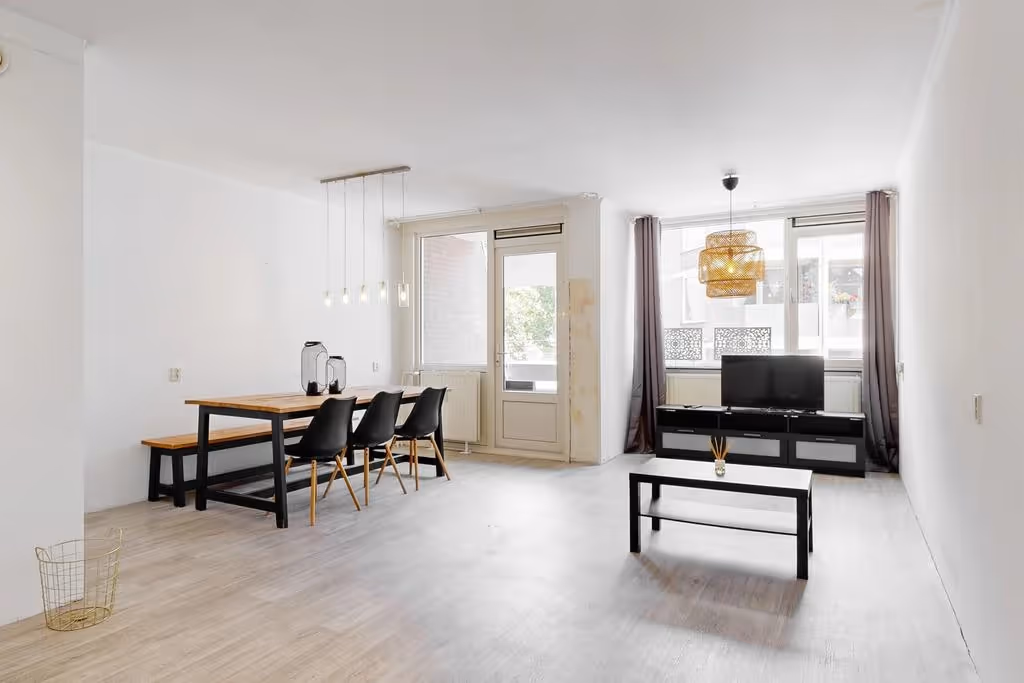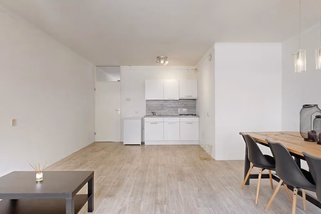 De woonkamer is verdeeld in een zit- en eethoek en door het feit dat het appartement grote kozijnen heeft, heeft het lekker veel lichtinval.