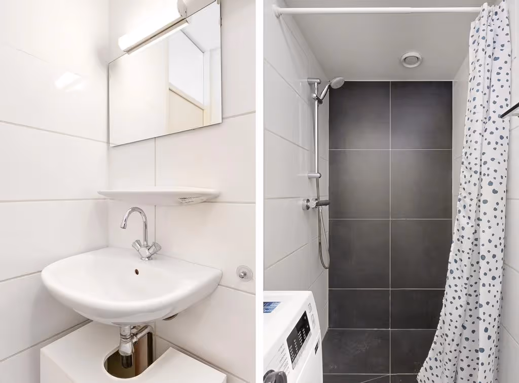 De slaapkamer van dit appartement grenst aan de zijde van de entree en is lekker ruim. Vanuit de slaapkamer is de badkamer te bereiken. Deze moderne badkamer heeft een wastafel en een (inloop)douche. Ook zijn in de badkamer de aansluitpunten voor de wasmachine aanwezig. Tenslotte ligt in het appartement nog een apart en eveneens modern toilet, bereikbaar via de hal.