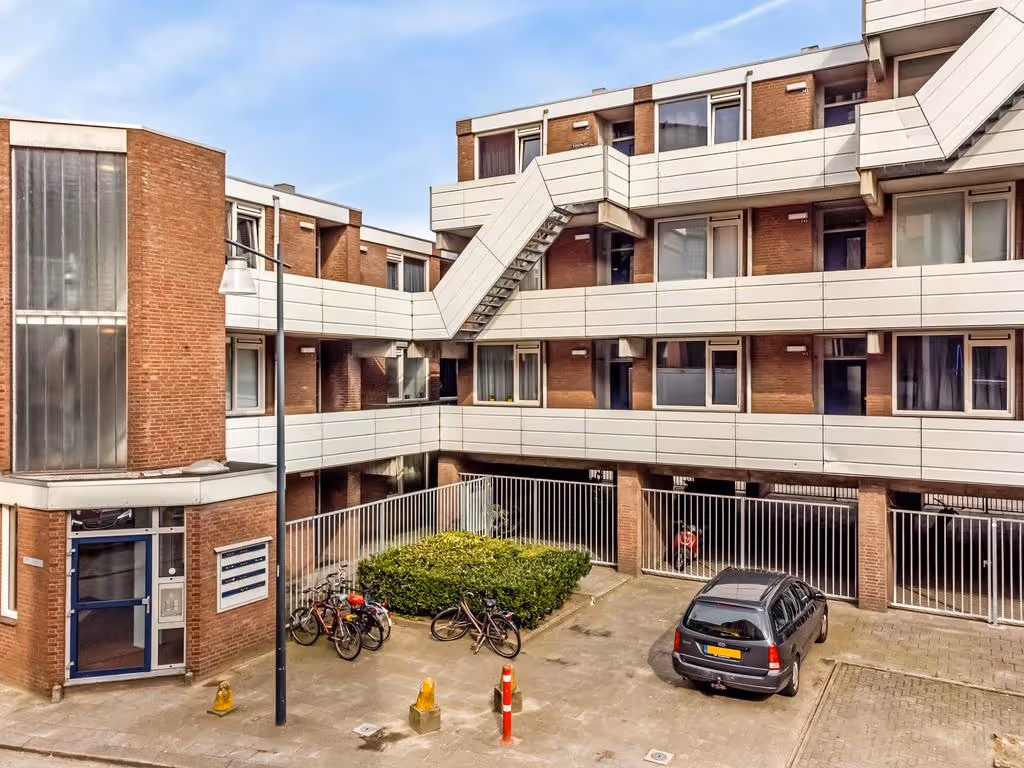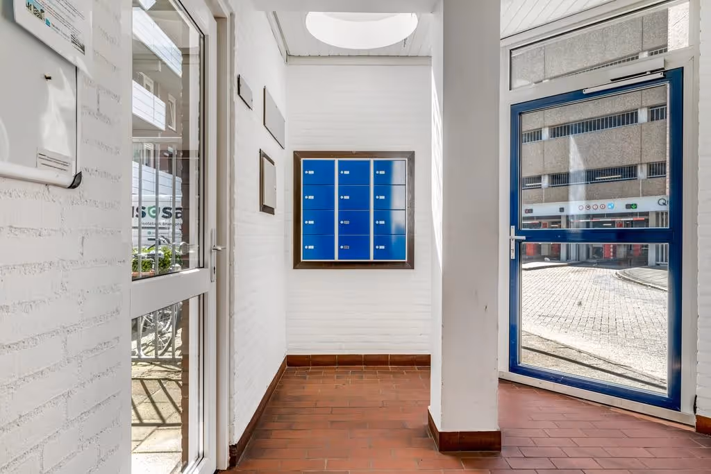 Centrale entreehal met brievenbussen en intercominstallatie. Trapopgang naar de verdiepingen en via het overdekte gedeelte van het complex zijn de privé bergingen gelegen, waar ook dit appartement een eigen berging heeft.