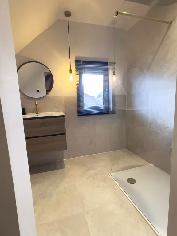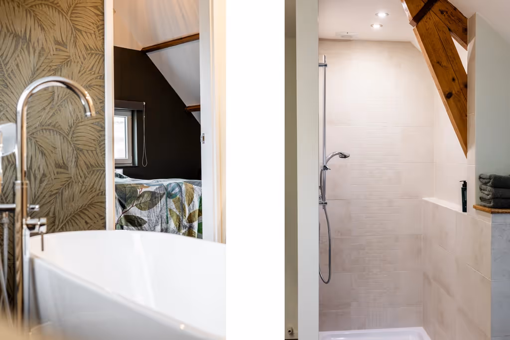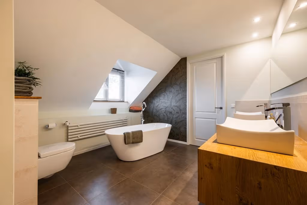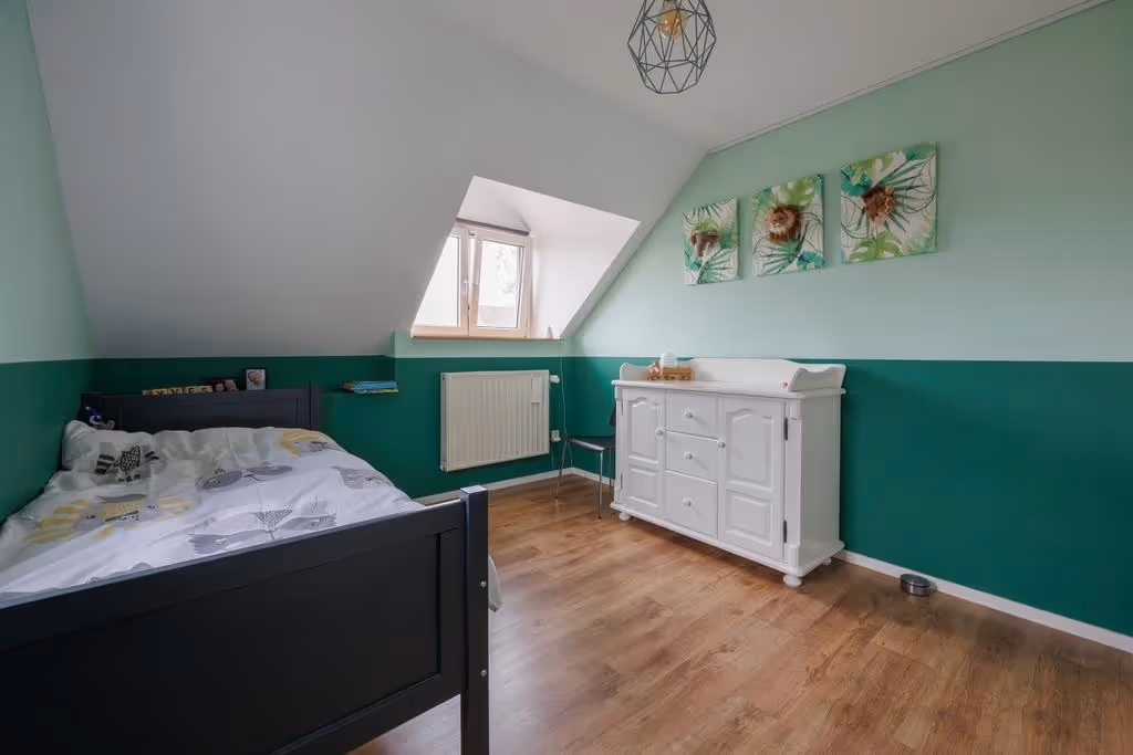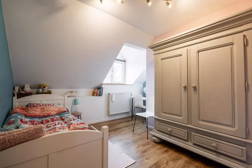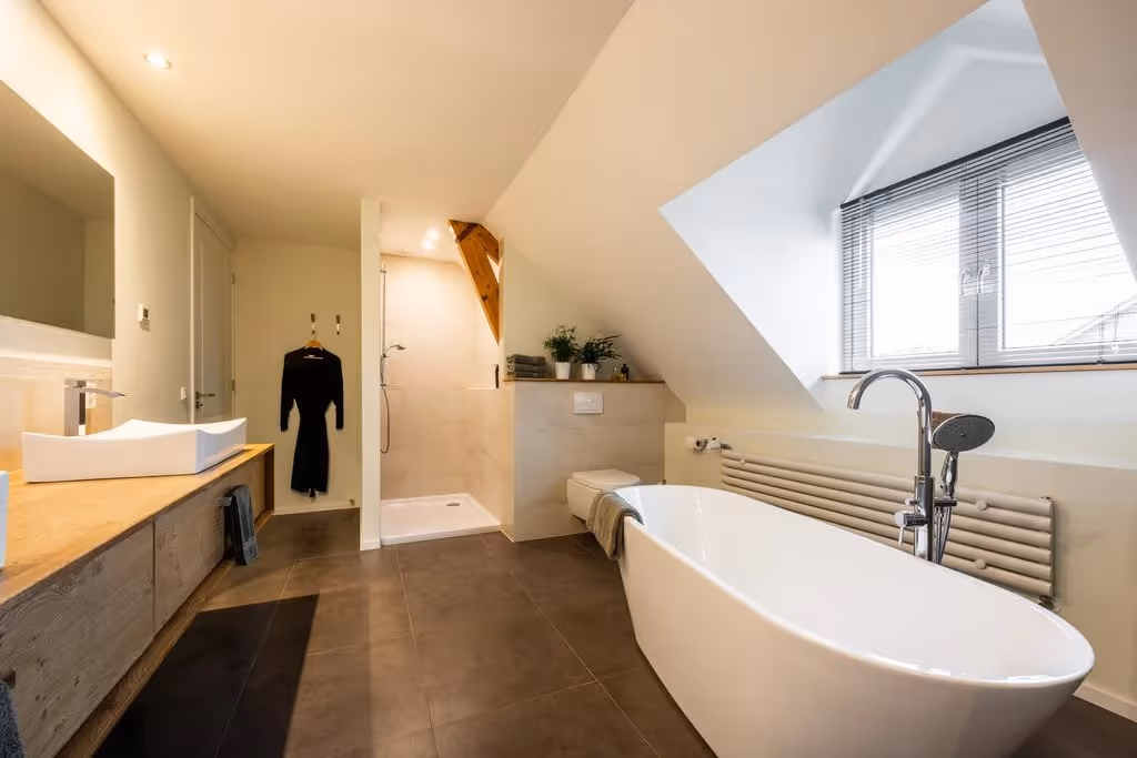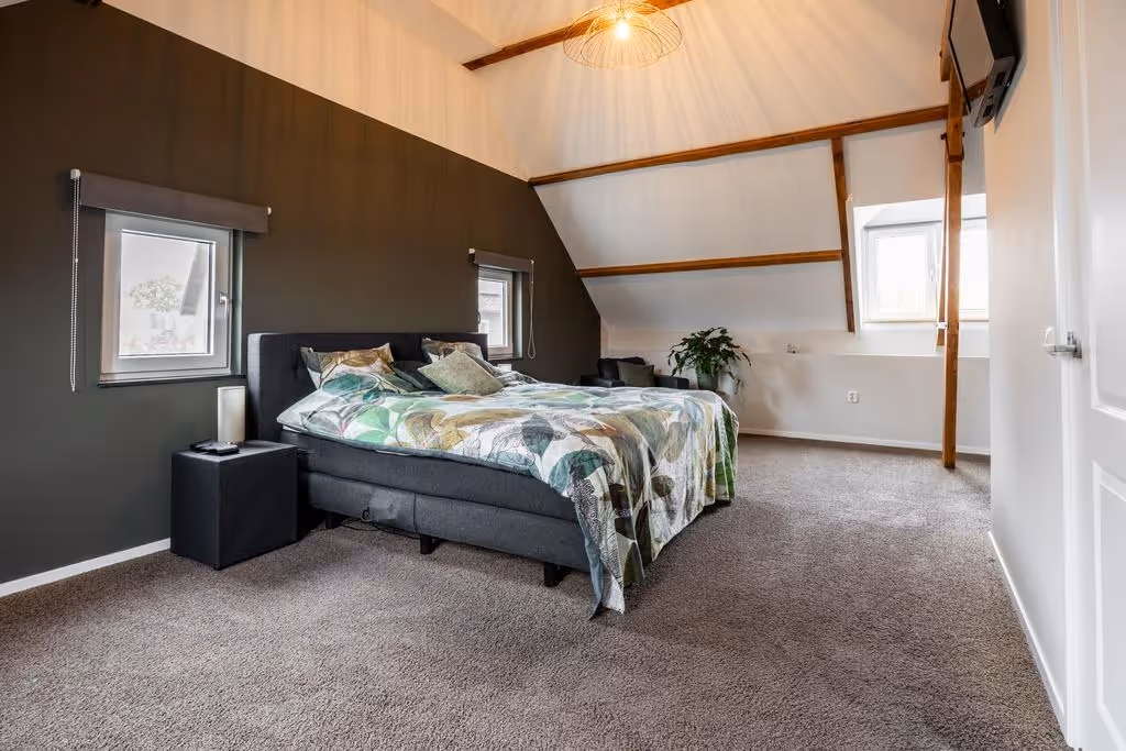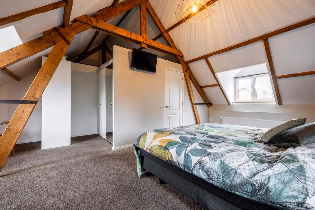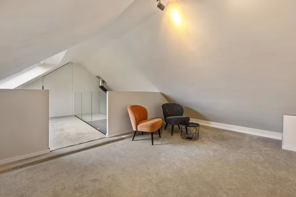 Via de overloop op de 1e verdieping zijn maar liefst 4 slaapkamers en 2 badkamers toegankelijk. De hoofslaapkamer is zeer ruim en bevat authentieke, houten balken die mooi contrasteren met het strakke stucwerk. Deze hoofdslaapkamer bevat kastruimte en is bereikbaar via de (hoofd)badkamer. Deze badkamer bestaat uit een vrijstaand ligbad, een groot wastafelmeubel met dubbele wastafel, een 3e toilet, een inloopdouche en vloerverwarming. De overige (slaap)kamers hebben ook een keurig niveau van afwerking en op deze verdieping is nog een 2e badkamer aanwezig welke voorzien is van een inloopdouche, wastafel, 4e toilet en vloerverwarming. Ideaal voor de kinderen of logees. Voorts is via een loopbrug met prachtige, glazen panelen, een extra ruimte bereikbaar. Deze ruimte is “verbonden” met de woonkamer en kan prima gebruikt worden als kantoor, speelplek, game-room, chill ruimte of gewoon als extra bergruimte. Door de grote dakramen (met zonwering en verduistering) en het glas van de loopbrug, heb je veel extra daglicht in de toch al lichte woonkamer.