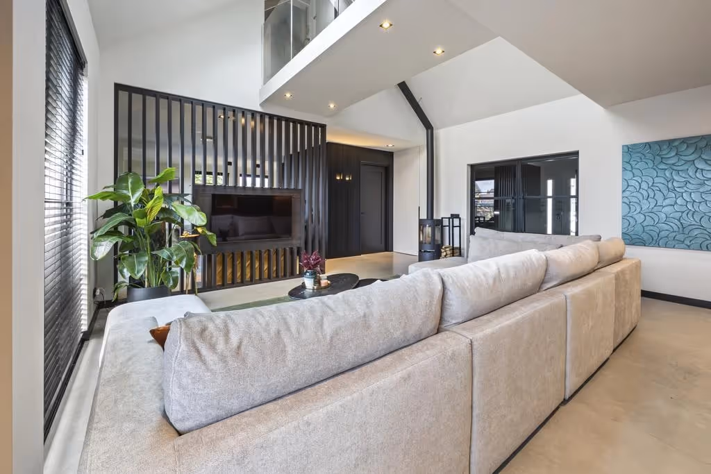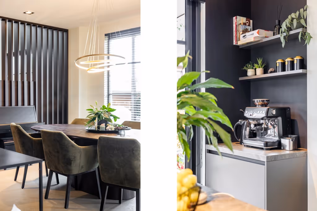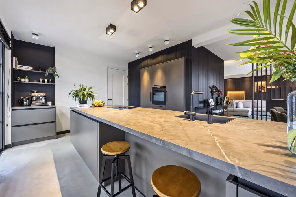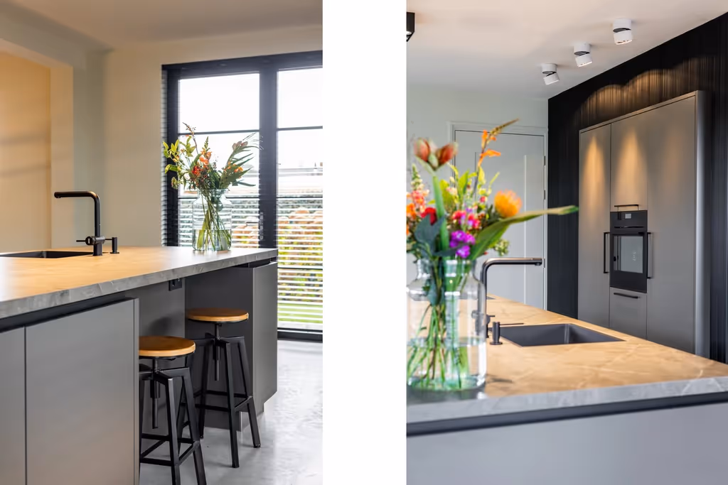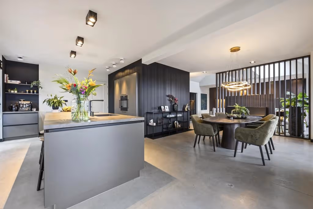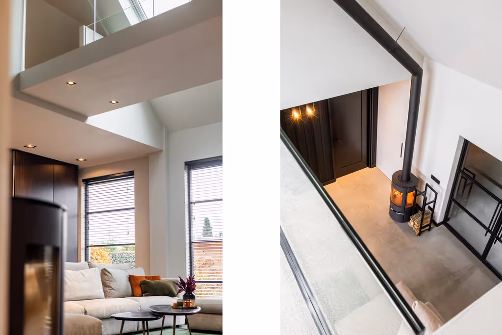 Bij de entree van dit sfeervolle woonhuis komt de charme je al tegemoet, mede door de stijlvolle, matzwarte stalen deuren, die de entreehal met de woonkamer verbinden. Verder ligt in de hal het moderne toilet. De woonkamer ademt allure en charme uit; het strakke stucwerk, de hoogte in de ruimte door de vide en de op maat gemaakte kastenwand en roomdivider, dragen hier allen aan bij. De vloer bestaat uit fraai, gevlinderd beton, met vloerverwarming. De kozijnen zijn van aluminium en uiteraard voorzien van HR++ beglazing. Tenslotte heeft de woonkamer een houtkachel, waardoor de ruimte nóg meer sfeer krijgt. De moderne leefkeuken vormt een open verbinding met het woongedeelte en bestaat uit een riant kookeiland, met lekker veel kastruimte. Ook hier weer zeeën van daglicht, door de kozijnen tot vloerniveau. De keuken beschikt over de volgende inbouwapparatuur: een Bora inductiekookplaat met afzuiging, oven, koelkast en vaatwasser. Via de keuken is er toegang tot de schoonheidssalon met een 2e toilet. Tenslotte heeft de begane grond nog een berging / bijkeuken. Hier bevinden zich de aansluitingen van het witgoed en de vloerverwarming, alsmede de CV combiketel (Remeha, eigendom, 2021) en de meterkast.