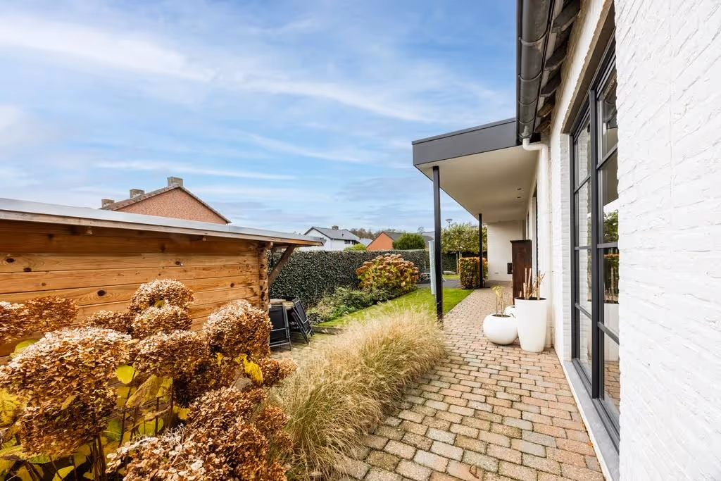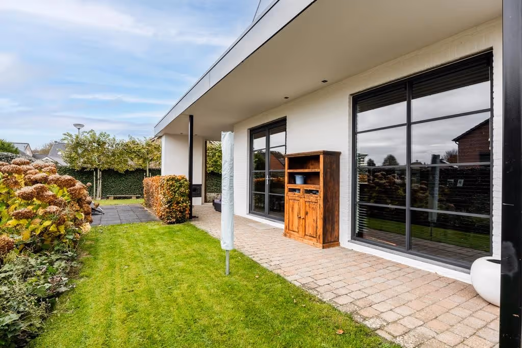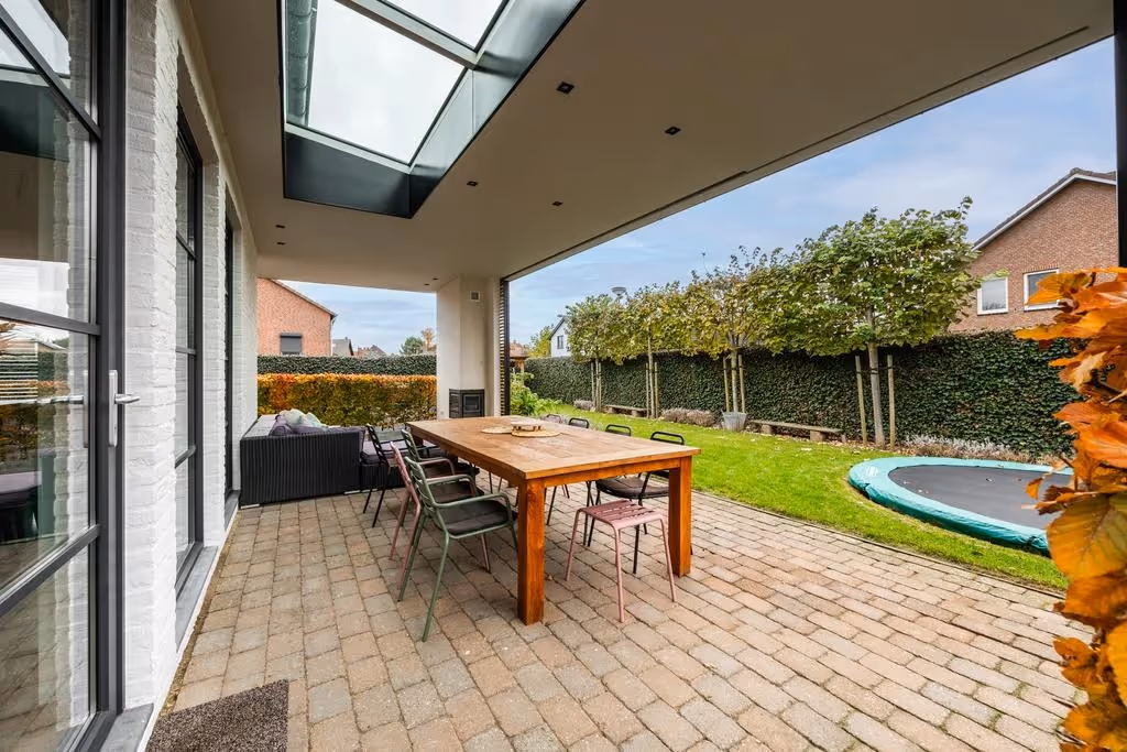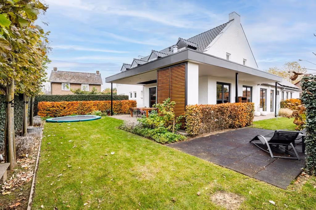 Dit stijlvolle woonhuis heeft ook nog een heerlijke tuin, waar je kunt genieten van lange avonden, onder andere onder de luxe terrasoverkapping, welke aan 2 zijden om het huis loopt. Door deze overkapping beschikt de woning over een riant, overdekt terras met sfeervolle haard, met plek voor een loungehoek en een grote eettafel. De rest van de tuin is ook mooi aangelegd, met een gazon, diverse beplanting en een extra zonneterras. De tuin bevat genoeg privacy en door de gunstige ligging ook de hele dag zon. Tenslotte heeft de woning nog een grote, vrijstaande garage met sectionaal poort.
