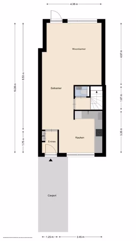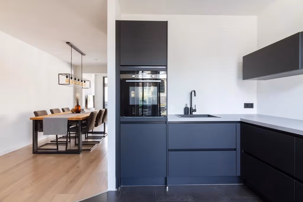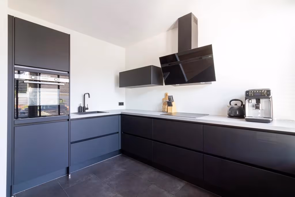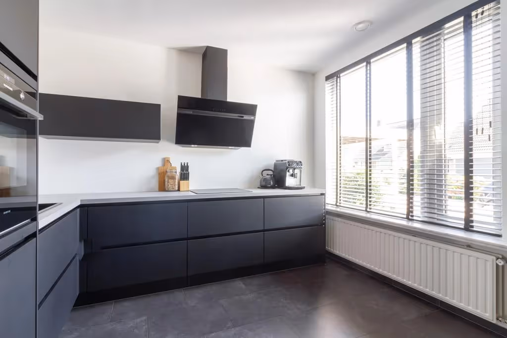 Entree in de ontvangsthal, met toegang naar woonkamer en meterkast. Deze woonkamer heeft een keurig niveau van afwerking en een mooie laminaatvloer. Aan de achterzijde is deze woonkamer uitgebreid met een aanbouw, waardoor je extra veel leefruimte hebt. De stijlvolle, halfopen keuken zit nu aan de voorzijde en heeft een hoekopstelling, met de volgende inbouwapparatuur: een kookplaat, matzwarte afzuigkap, oven en vaatwasser. Voor heeft de begane grond een airco (2024) die kan koelen en verwarmen. Tenslotte zijn via een 2e hal de trapopgang naar de 1e verdieping en het toilet gelegen.