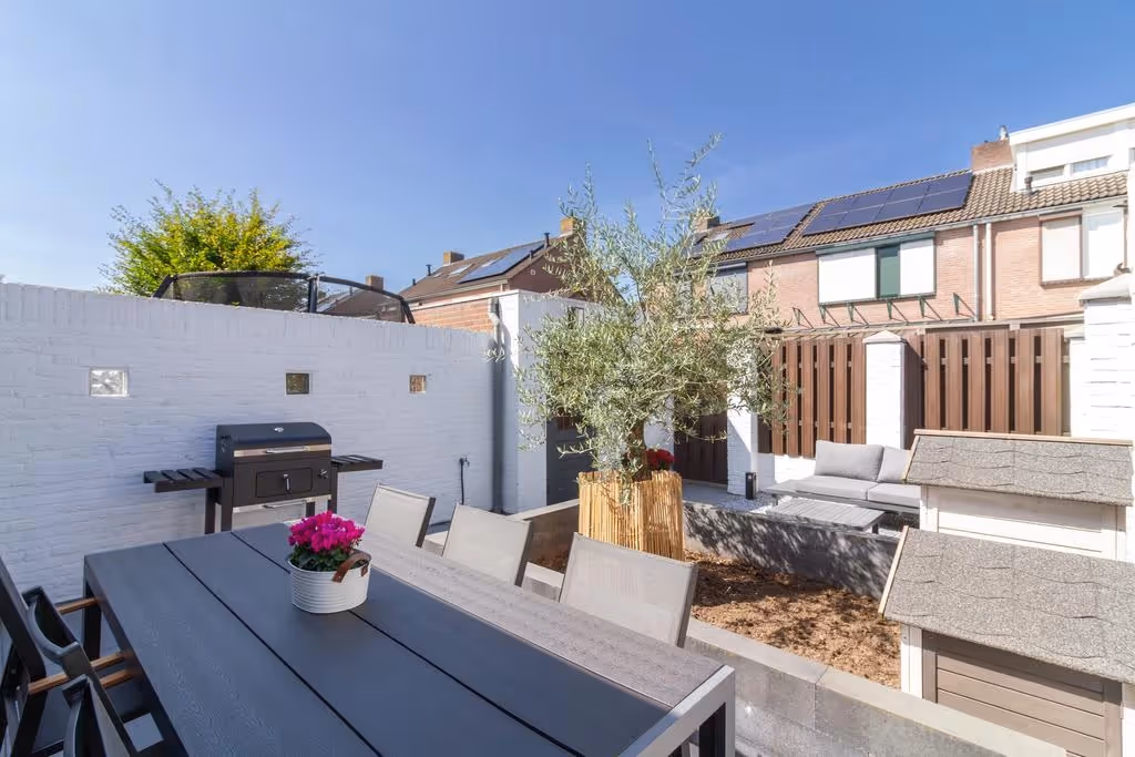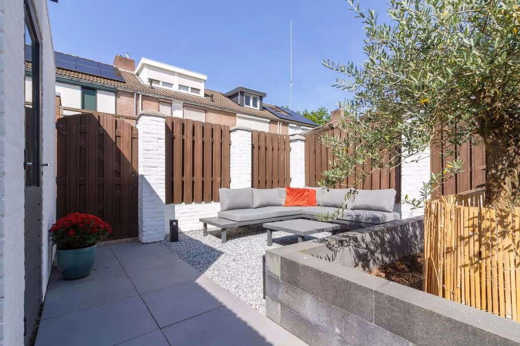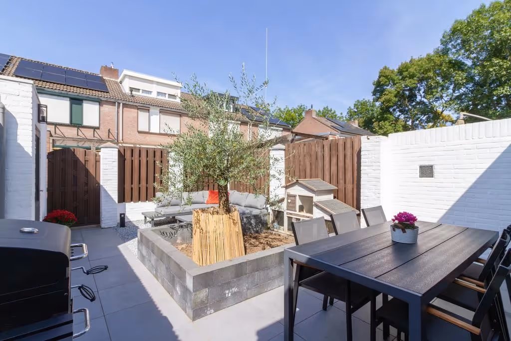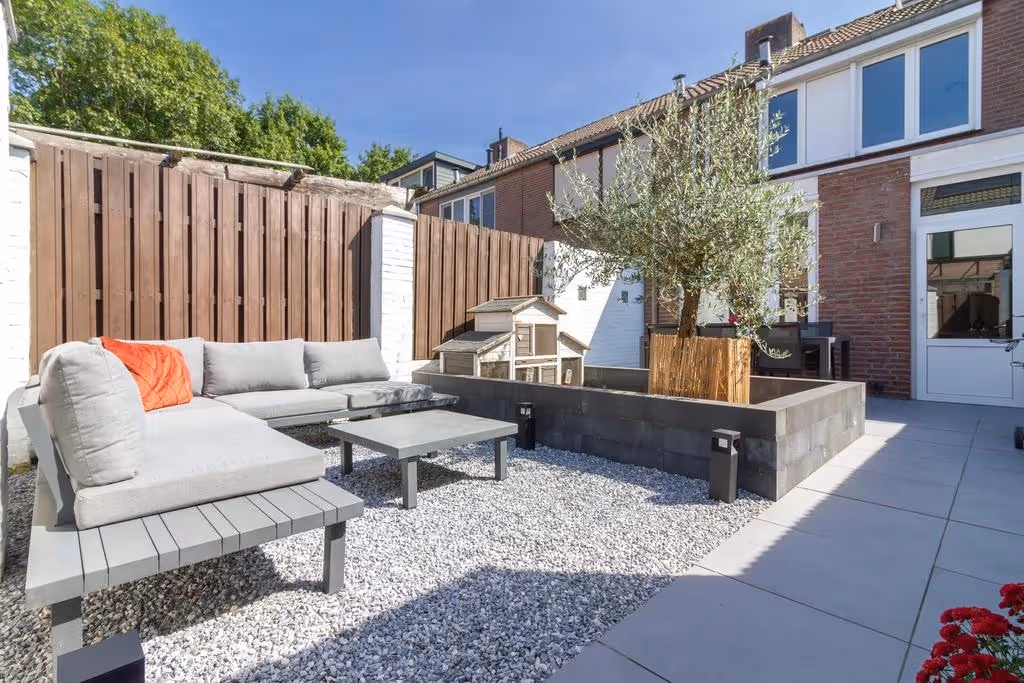 Deze fijne woning heeft ook een heerlijke tuin, welke onderhoudsvriendelijk is aangelegd. Deze tuin ligt op het Westen en is geheel voorzien van sierbestrating, mooie, wit geschilderde muren en fraaie olijfboom in het midden van de tuin. Verder heeft deze tuin een eigen achterom middels een poortje en is er een gemetselde berging.