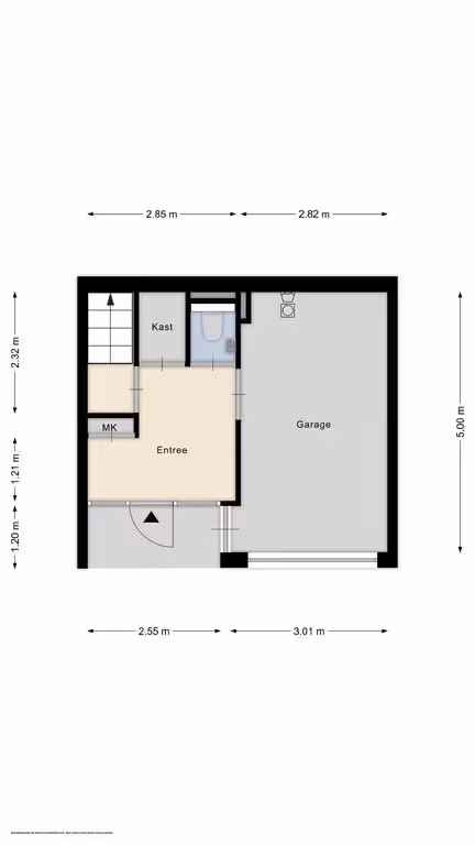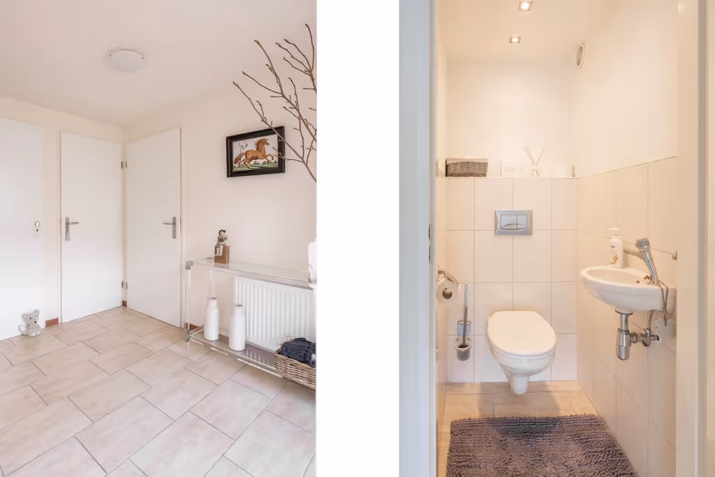 Entree in de ontvangsthal met meterkast en toegang naar het toilet en de inpandige garage / berging. Deze inpandige garage is momenteel als bergruimte in gebruik en hier bevinden zich ook de aansluitpunten van het witgoed en de zonnecollector.