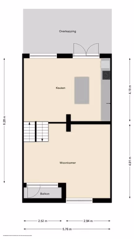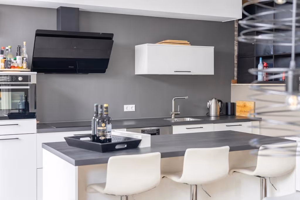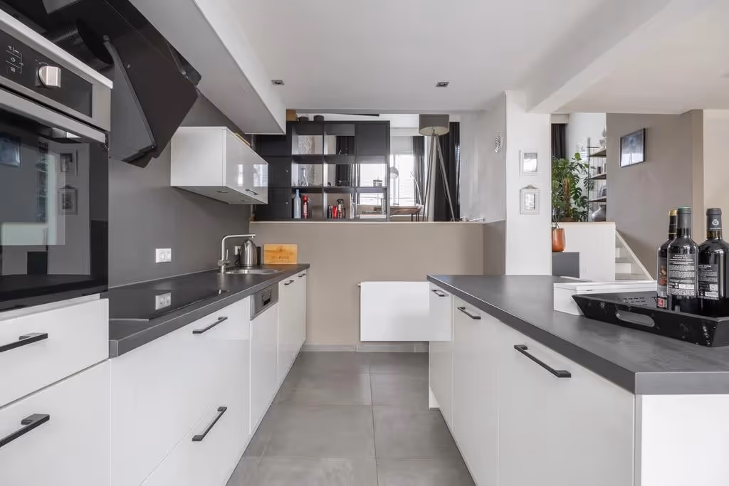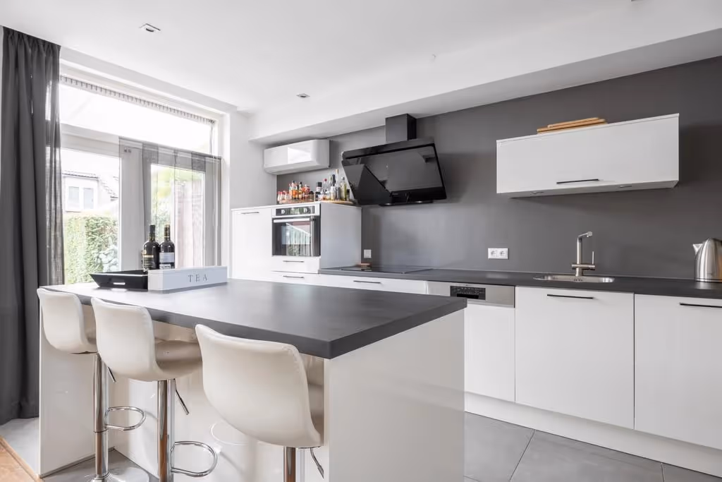 Via de trapopgang zijn de keuken en woonkamer te bereiken. Aan de achterzijde, grenzend aan de achtertuin, ligt de moderne leefkeuken. De stijlvolle keuken met eiland is van alle gemakken voorzien en beschikt over een 4-pits inductie kookplaat met afzuigkap, koelkast, vriezer, combi-oven en vaatwasser. Via een trapje kom je vervolgens in de woonkamer van deze fijne woning. De zithoek is royaal en licht en de woonkamer heeft een sfeervolle parketvloer. Zowel in de woonkamer als keuken hebben de kozijnen dubbele beglazing en aan de voorkant is vanuit de woonkamer nog een klein balkon toegankelijk. Ook is hier één van de drie airco’s geplaatst.