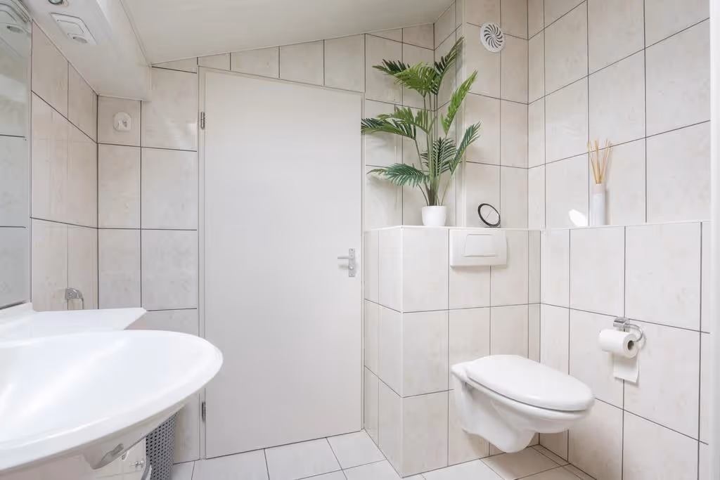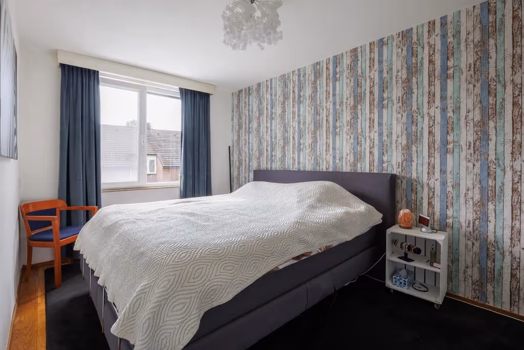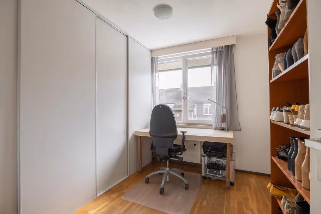 Als je je weg vervolgt kom je op de volgende verdieping uit, waar zich 2 ruime slaapkamers bevinden en wederom, via de trap verder omhoog, de badkamer. De slaapkamers hebben beide kunststof kozijnen met HR++ beglazing en een keurig niveau van afwerking. De badkamer is voorzien van een douchecabine, zwevend toilet en wastafelmeubel. Op de overloop van deze verdieping, richting de slaapkamers, hangt tenslotte een airco en naast de badkamer zijn nog enkele royale inbouwkasten gelegen. In één van deze kasten is de CV combiketel geplaatst (Nefit, 2018, eigendom).