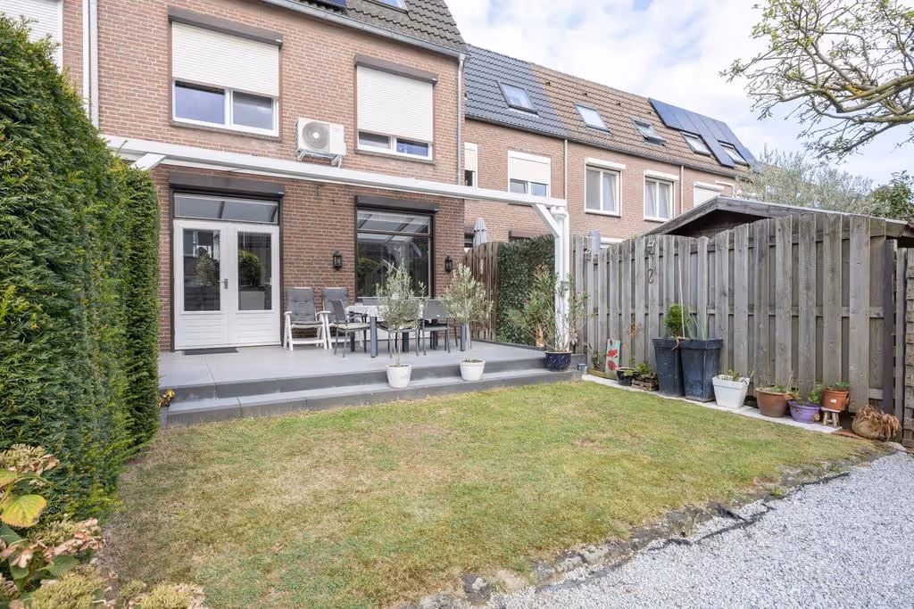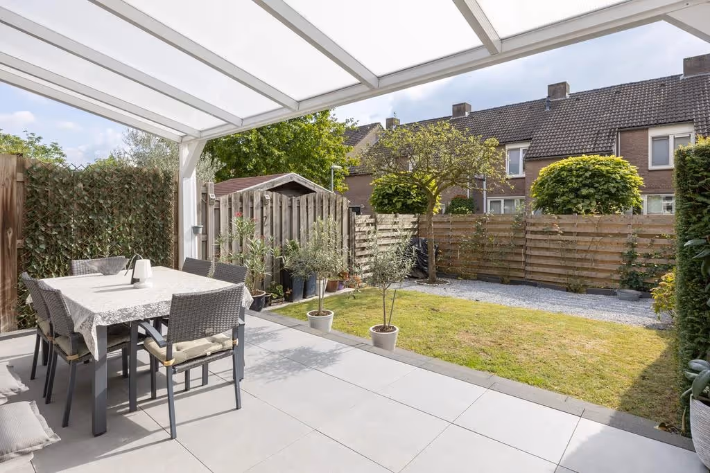 Deze fijne woning heeft ook een heerlijke tuin, welke gelijk vanuit de keuken is te bereiken. De tuin beschikt over een terras met luxe terrasoverkapping, een gazon en wat beplanting. Verder is de tuin via een achterom bereikbaar en gelegen op het Zuiden, dus heerlijk zonnig. Ideaal toch?