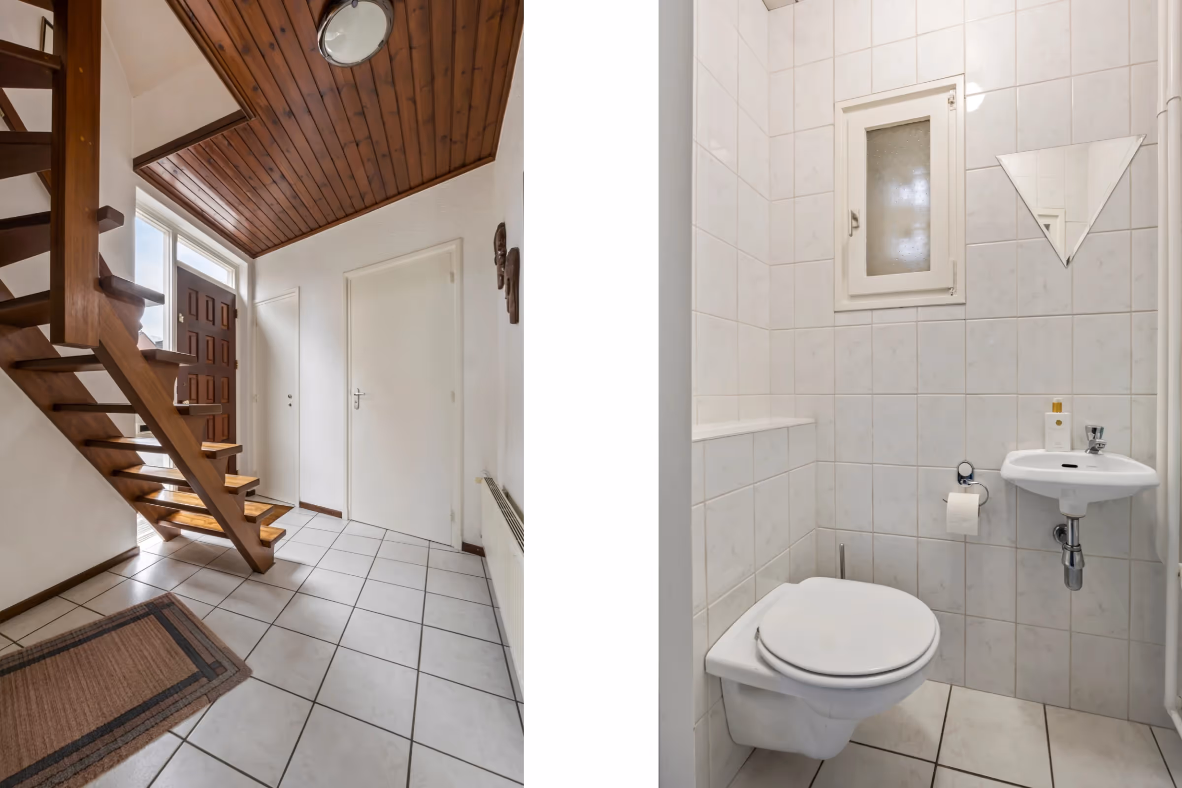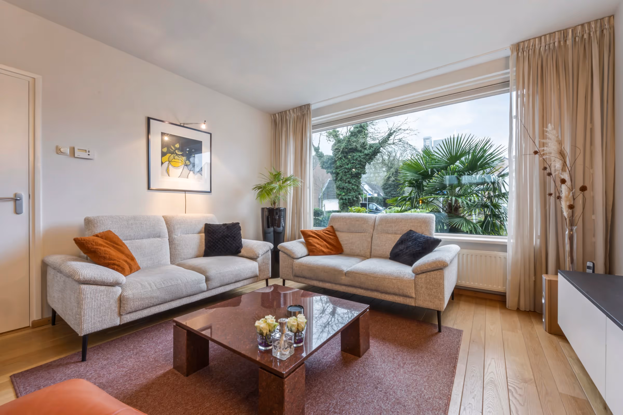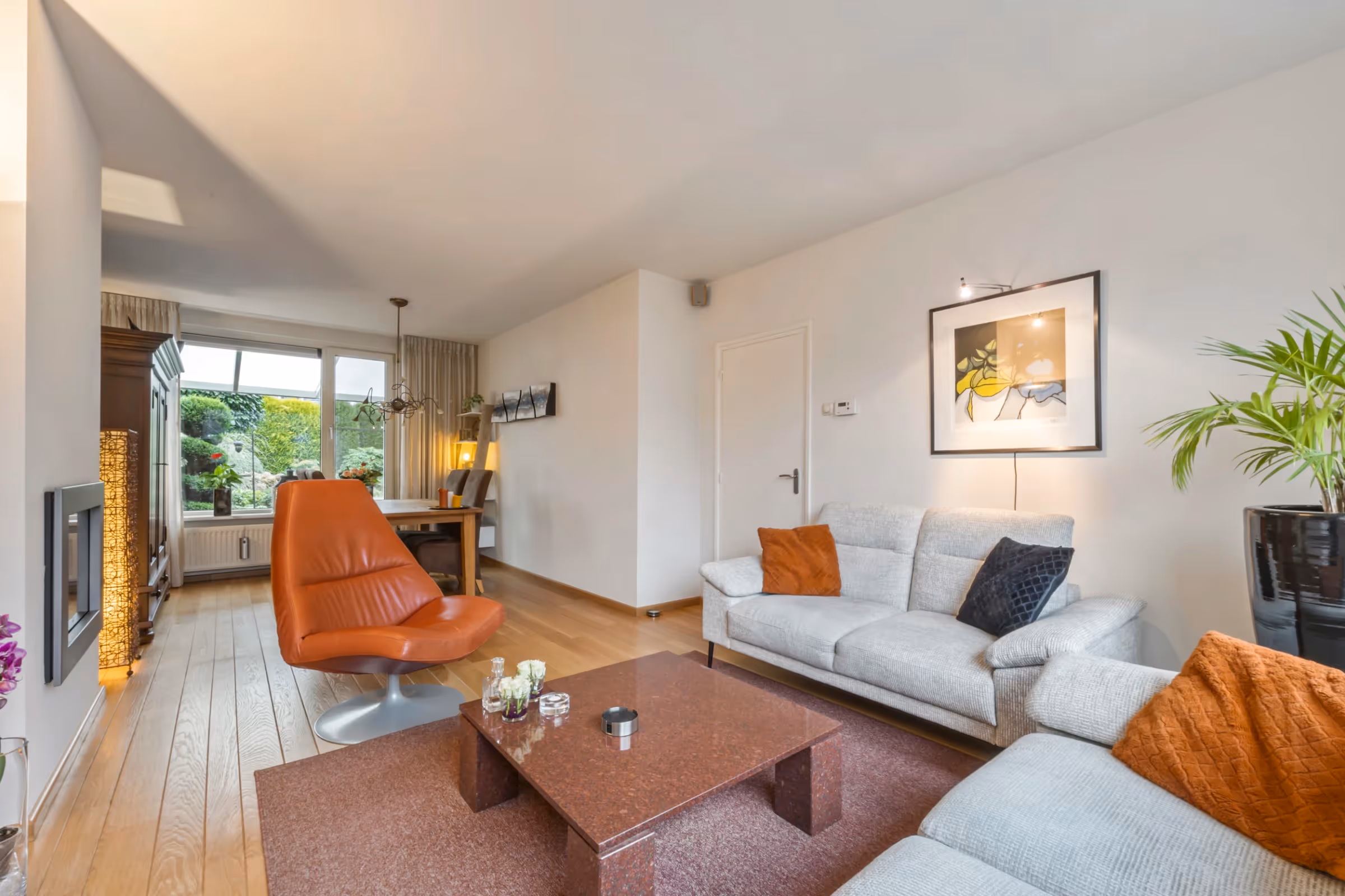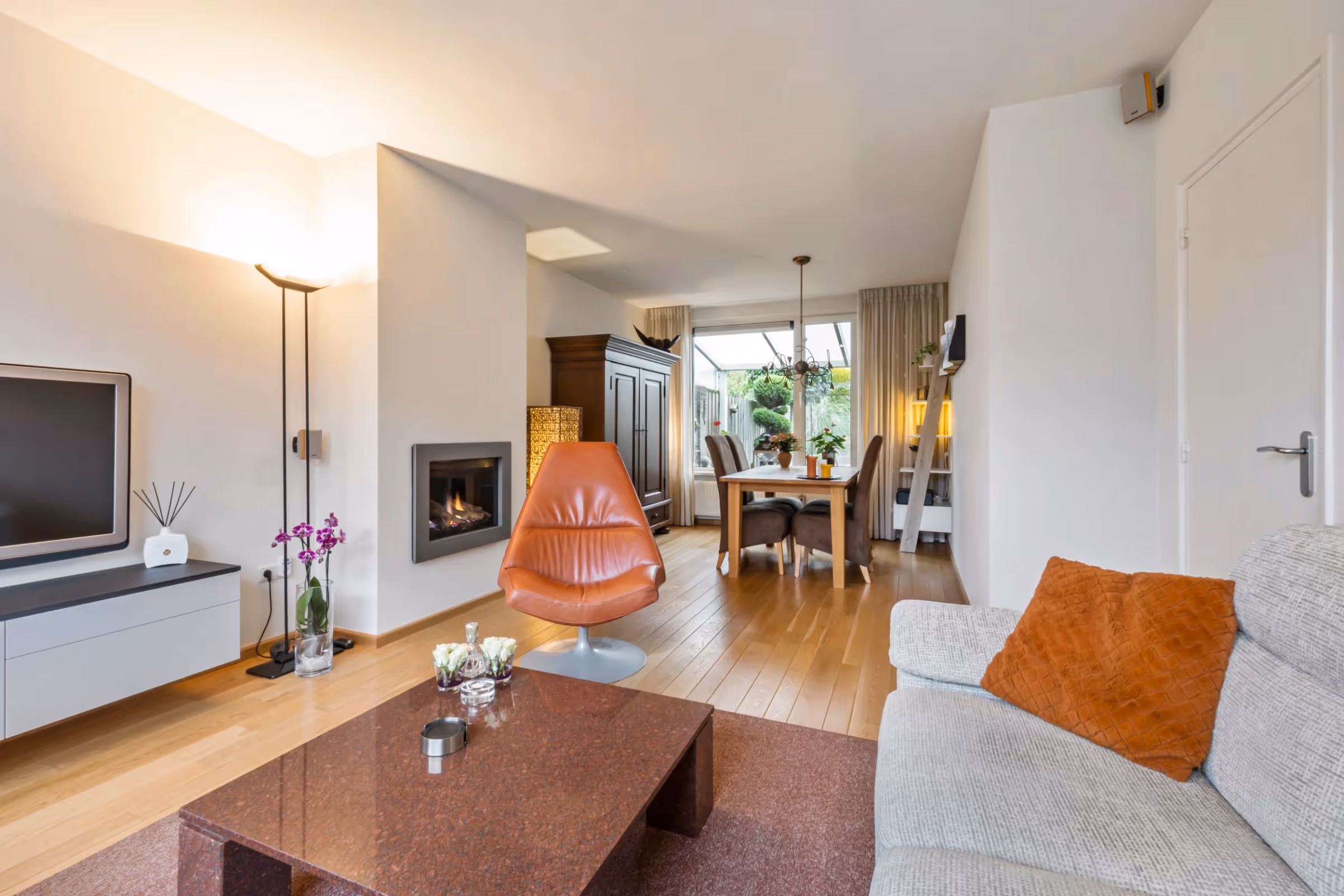 Entree in de hal met zwevend toilet met fonteintje, meterkast en toegang tot de woonkamer en de keuken. In de woonkamer is er sprake van een mooie lichtinval door de riante kozijnen aan voor- en achterzijde. De woonkamer heeft voorts een uitstekend niveau van afwerking, met o.a. een fraaie, houten parketvloer en een sfeervolle gashaard. De keuken is apart gelegen en heeft een modern keukenblok met de volgende inbouwapparatuur: een 4-pits gasfornuis met RVS afzuigkap, koelkast, vriezer, combi magnetron en vaatwasser. Ook heeft de keuken een handige apothekerskast en vanuit de keuken is de tuin te bereiken.