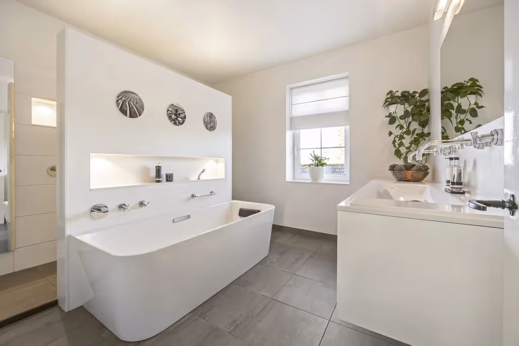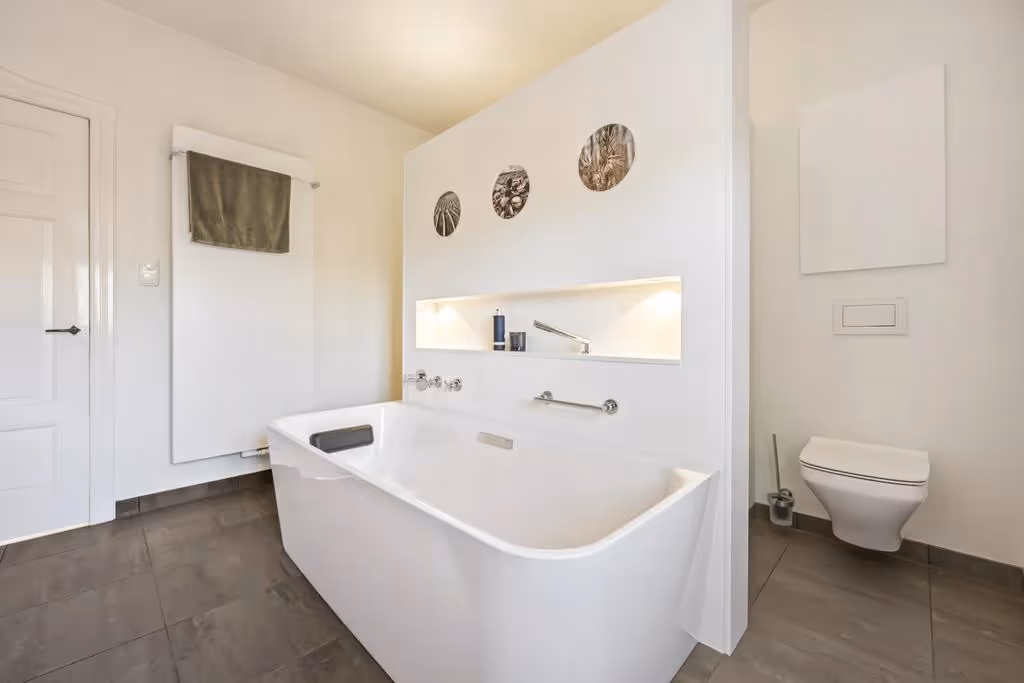Via de overloop op de 1e verdieping zijn 3 riante slaapkamers, de moderne badkamer en een walk in closet / extra kamer gelegen. Tevens is op de overloop een vaste kast met nog meer bergruimte aanwezig. Alle 3 de slaapkamers hebben een keurig niveau van afwerking, met wit geschilderde houten vloeren en kunststof kozijnen met dubbele beglazing. Alle 3 de slaapkamers zijn ruim en zelfs de kamer welke nu als inloopkast in gebruik is, kan als extra slaapkamer fungeren indien gewenst. Tenslotte ligt op deze verdieping nog een luxe badkamer. Deze badkamer heeft een royaal ligbad, een wastafelmeubel met dubbele wastafel, extra toilet en ruime luxe inloopdouche.
