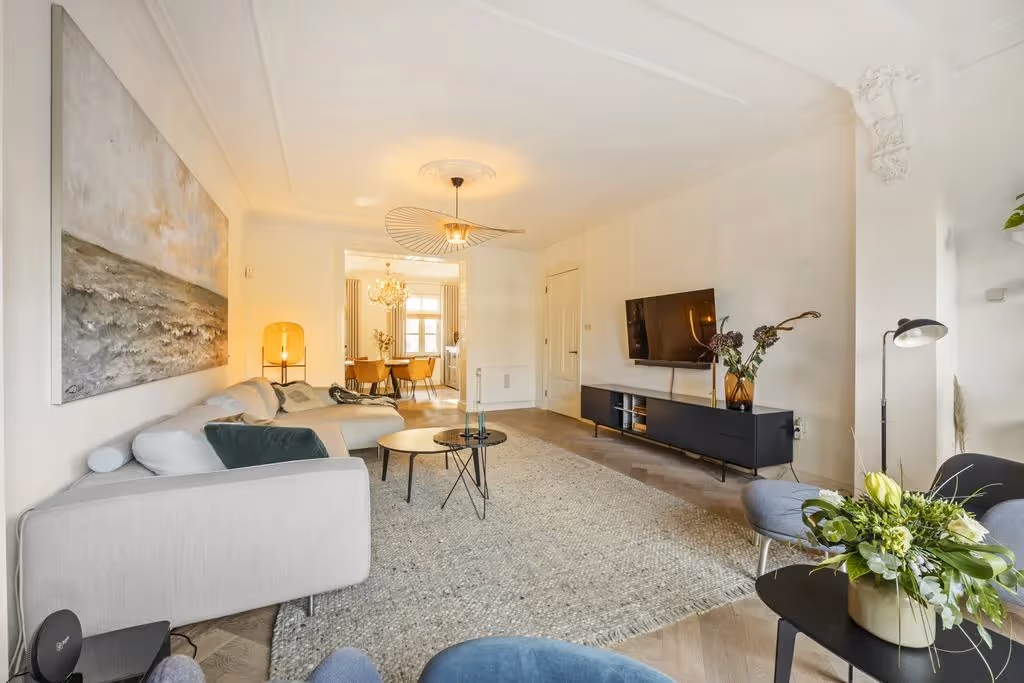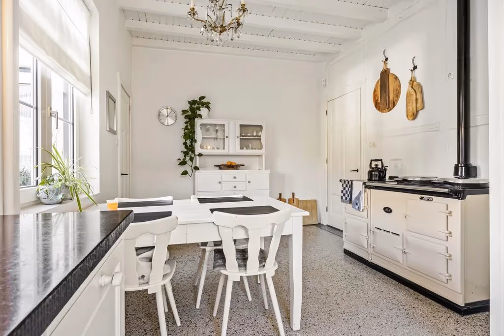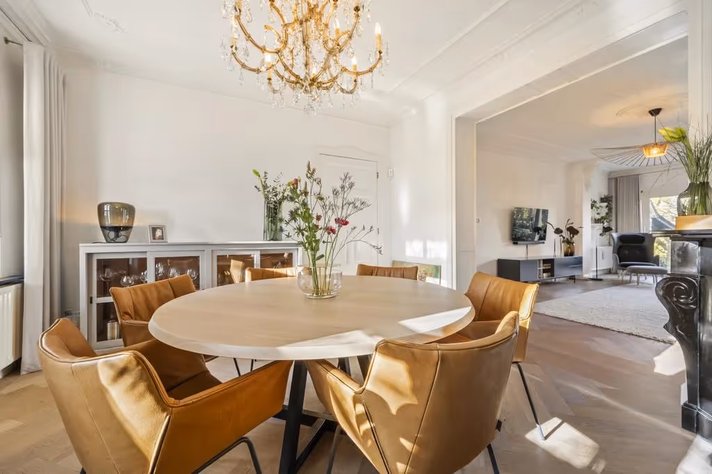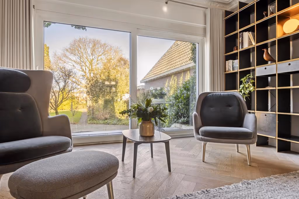 Via het entreeportaal kom je in de centrale hal. De grandeur komt je hier al tegemoet, door de houten trappartij en de mooie terrazzovloer. Vanuit deze centrale hal zijn de diverse kamers te bereiken. De riante woonkamer heeft een stijlvolle, massieve parketvloer in visgraatmotief en prachtige ornamenten in het plafond. Ook is in de eethoek een authentieke schouw met haardpartij aanwezig. Aan de voorzijde van de woning, ligt een extra kamer, welke momenteel als kantoor / thuiswerkplek dienst doet. Deze kamer heeft een mooie, houten lambrisering, een vaste boekenkast en voorzien van dezelfde fraaie vloer als in de woonkamer. Aan de achterzijde ligt de leefkeuken. In deze keuken ligt wederom de prachtige terrazzovloer. Het keukenblok is in een hoekopstand geplaatst, met een losstaand, luxe fornuis met maar liefst 4 ovens. Qua inbouwapparatuur zijn een koelkast en vaatwasser in de keuken aanwezig. Tenslotte ligt op de begane grond nog het gastentoilet.