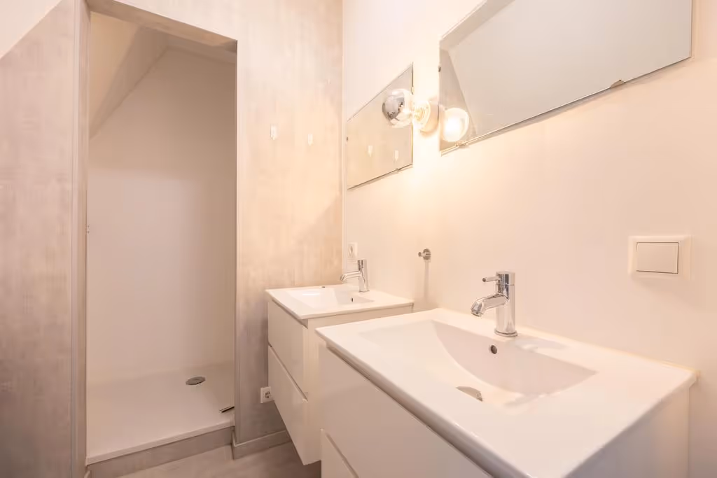 De stijlvolle badkamer beschikt over een wastafelmeubel met dubbele wastafel en een inloopdouche. Ook zijn hier de aansluitpunten voor je wasmachine.