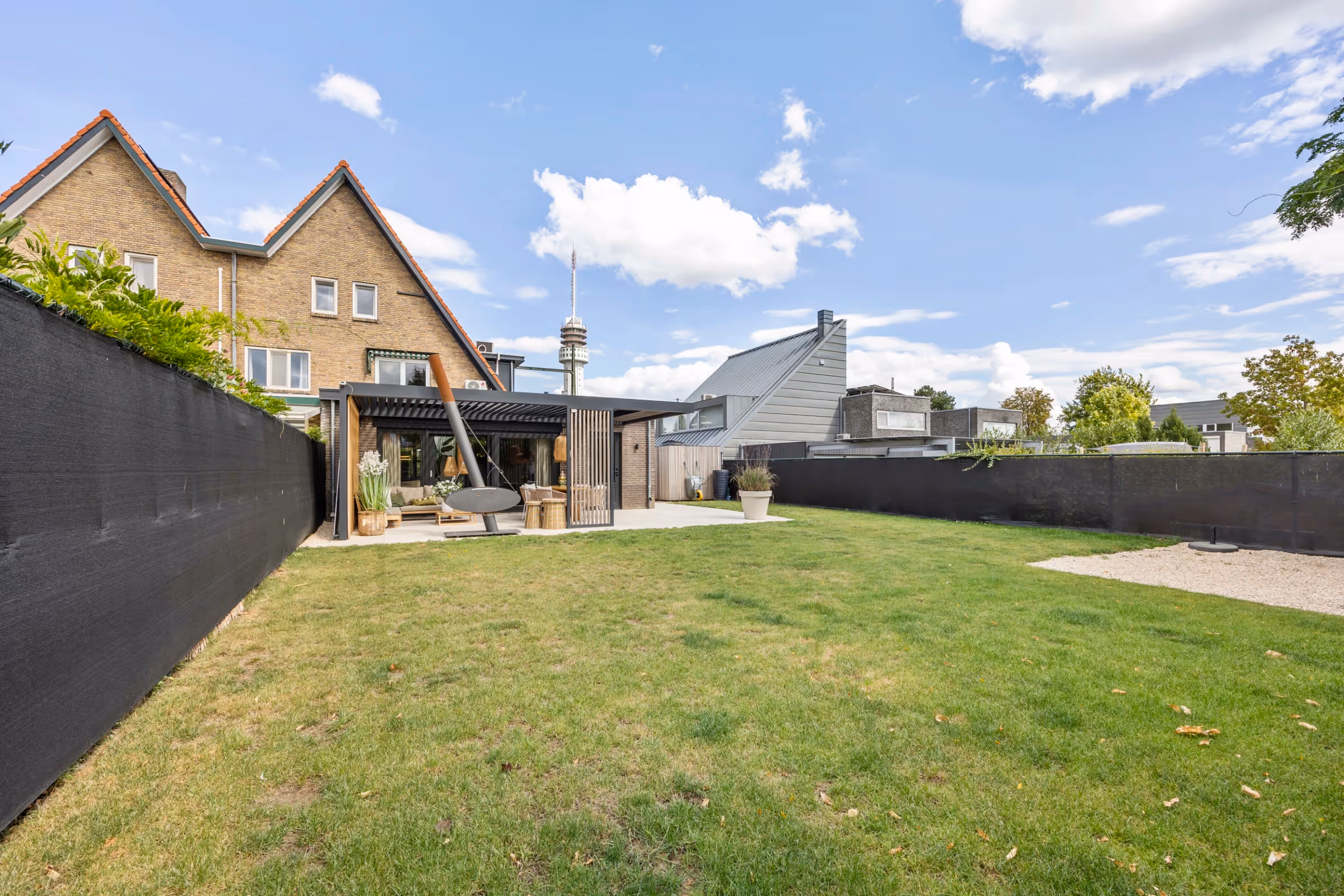Tenslotte heeft dit sfeervolle woonhuis nog een heerlijke, ruime tuin, waar je kunt genieten van de gunstige ligging op het Zuiden. Achter de woning ligt een royaal terras, met hoogwaardige terrasoverkapping. Van deze luxe terrasoverkapping kunnen de lamellen / het dak, open en dicht. Hierdoor kun je ook bij een regenbuitje nog heerlijk van het buitenleven genieten. Behalve het terras beschikt de tuin over een groot gazon en een overdekte fietsenberging naast het huis. Aan de voorzijde ligt een riante oprit, waar je makkelijk 2 auto’s kunt parkeren.
