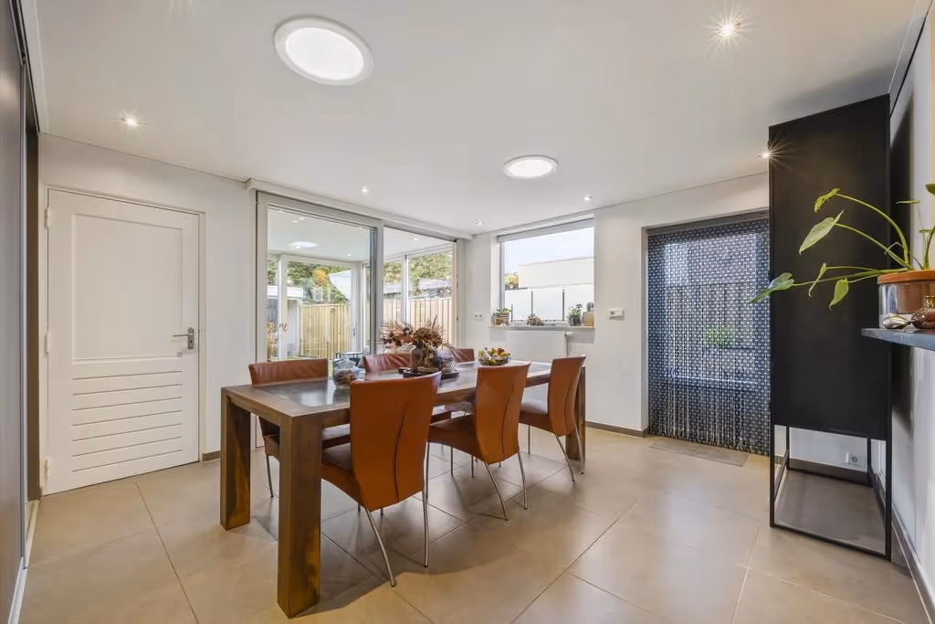 Entree in de hal met betegeld toilet met fonteintje, moderne meterkast en toegang tot de woonkamer. De woonkamer heeft een stijlvol niveau van afwerking, met onder andere een mooie tegelvloer. Ook is in de woonkamer een trapkast gelegen, waar de unit van de vloerverwarming is geplaatst. Vanuit de woonkamer kom je in de keuken. Deze keuken heeft een nette hoekopstand en beschikt als inbouwapparatuur over een koelkast en een vaatwasser. Voorst heeft de keuken een los RVS gasfornuis met oven. Vanuit de keuken is de eetkamer bereikbaar. Ook hier een keurig niveau van afwerking en aansluitend aan deze eetkamer heeft de woning nog een inpandige berging en tuinkamer. De tuinkamer is geheel voorzien van kunststof kozijnen, een schuifpui en heeft rolluiken. De inpandige berging bevat de aansluitpunten voor het witgoed en de begane grond beschikt grotendeels over vloerverwarming en rolluiken.