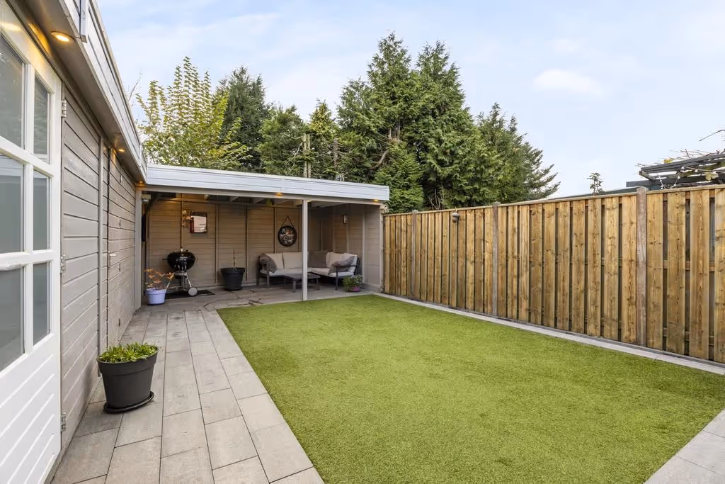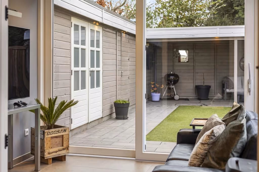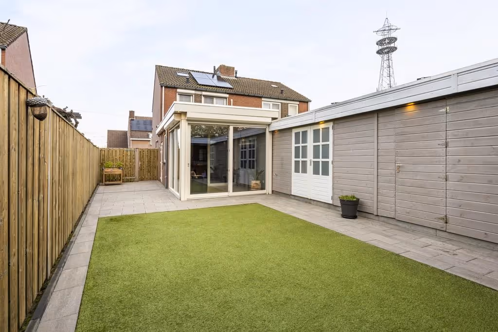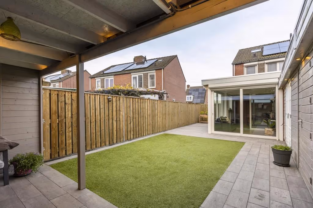 Deze fraaie 2-onder-1-kap-woning heeft ook nog eens een onderhoudsvriendelijke achtertuin, met 2 houten bergingen en een luxe terrasoverkapping. De tuin is gelegen op het Zuid Westen en heeft een gazon van kunstgras. De tuin is bereikbaar via een eigen achterom en heeft aan de voorkant nog een riante oprit, waar je makkelijk 2 auto’s kunt parkeren.