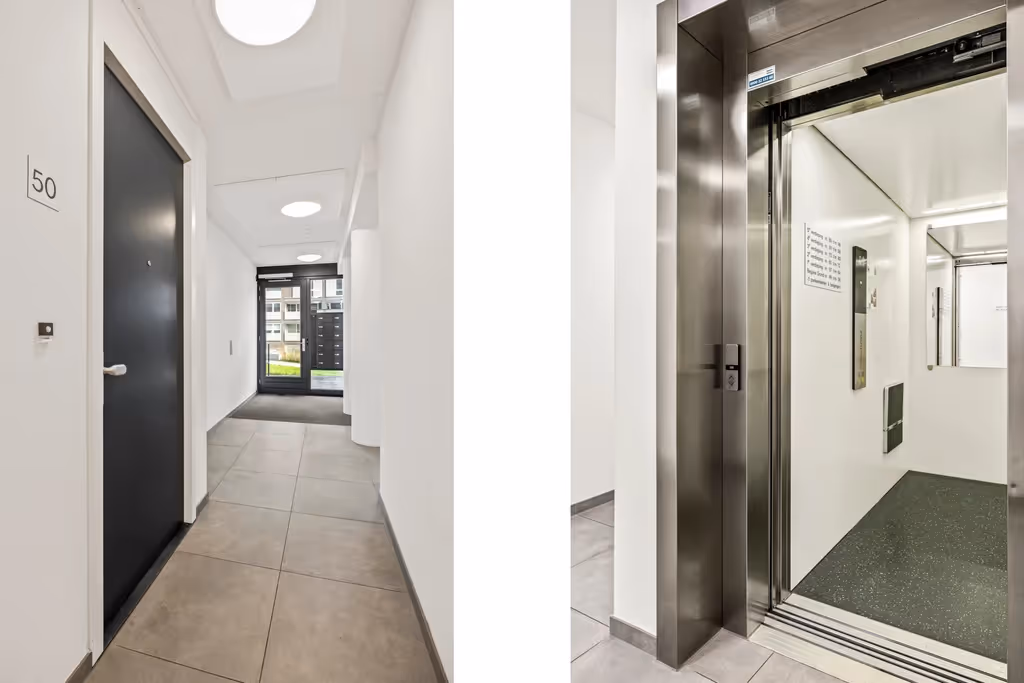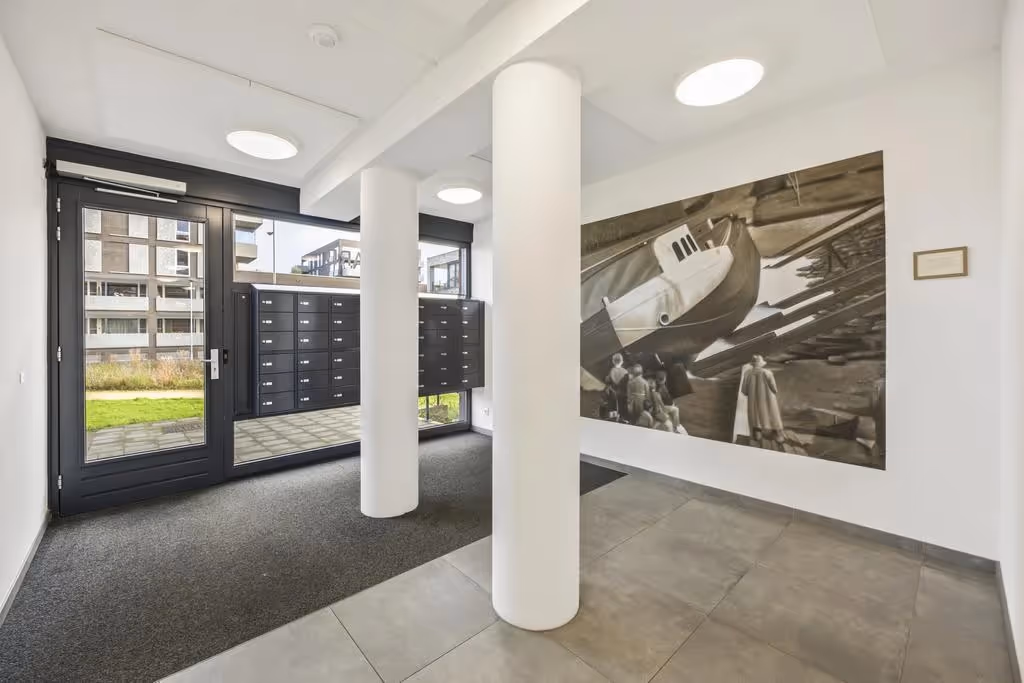 Centrale entree met brievenbussen, intercom en liftinstallatie en toegang naar het appartement. Het appartement is gelegen op de begane grond van het complex. In het souterrain van het gebouw liggen de bergingen, waar ook dit appartement een eigen berging heeft en van waaruit tevens het afgesloten parkeerterrein te bereiken is.
