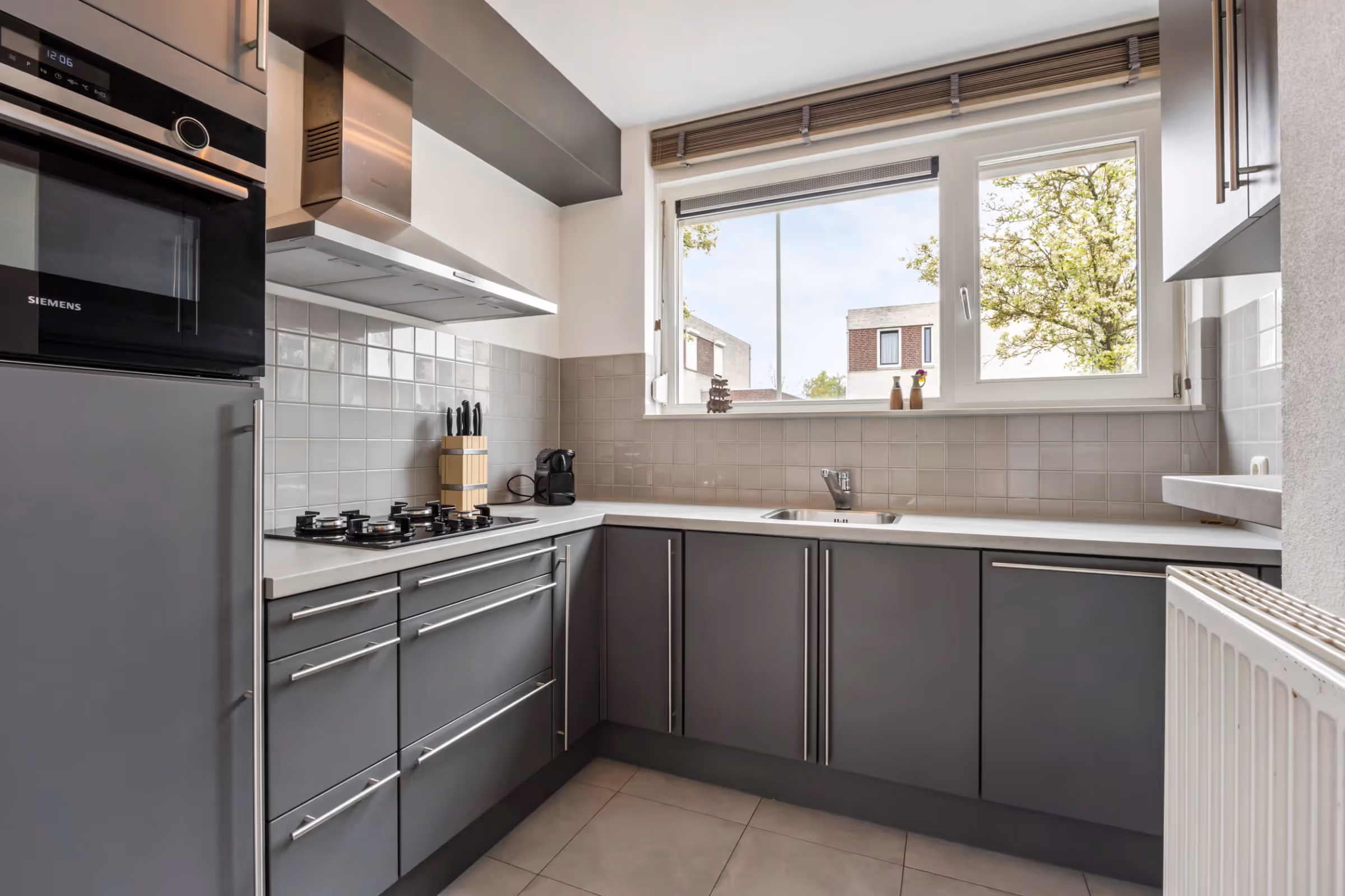 Via de entreehal, waar tevens het gastentoilet met fonteintje en de meterkast zijn gelegen, kom je in de woonkamer. Deze woonkamer ligt aan de achterzijde van de woning en heeft zicht op de tuin. De woonkamer beschikt over een sfeervolle parketvloer en aan de voorkant van het huis ligt de keuken. Deze jonge keuken, in hoekopstelling en met een antraciet kleur, beschikt over de volgende inbouwapparatuur: 4-pits gasfornuis met afzuigkap, combi-magnetron, koelkast en vaatwasser.