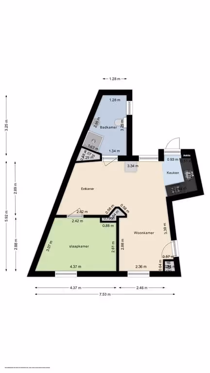 Het appartement zelf ligt op de begane grond. Je komt binnen in de woonkamer met open keuken. Het gehele appartement is recent gerenoveerd, dus op de vloer ligt een mooie, nieuwe laminaatvloer en alles is keurig geschilderd. De keuken heeft een hagelnieuw keukenblok met als inbouwapparatuur: een 4-pits gasfornuis met stijlvolle, zwarte afzuigkap, koelkast, combi-oven en vaatwasser.
