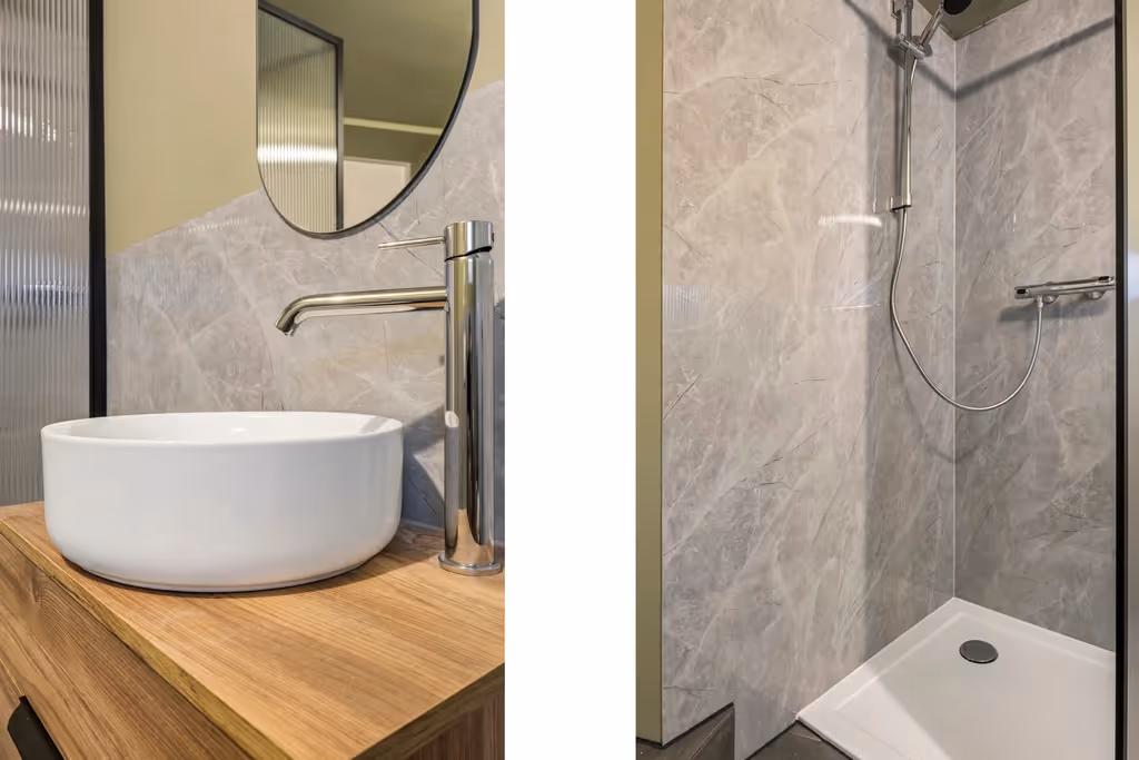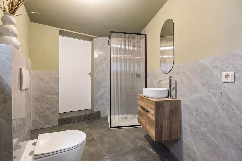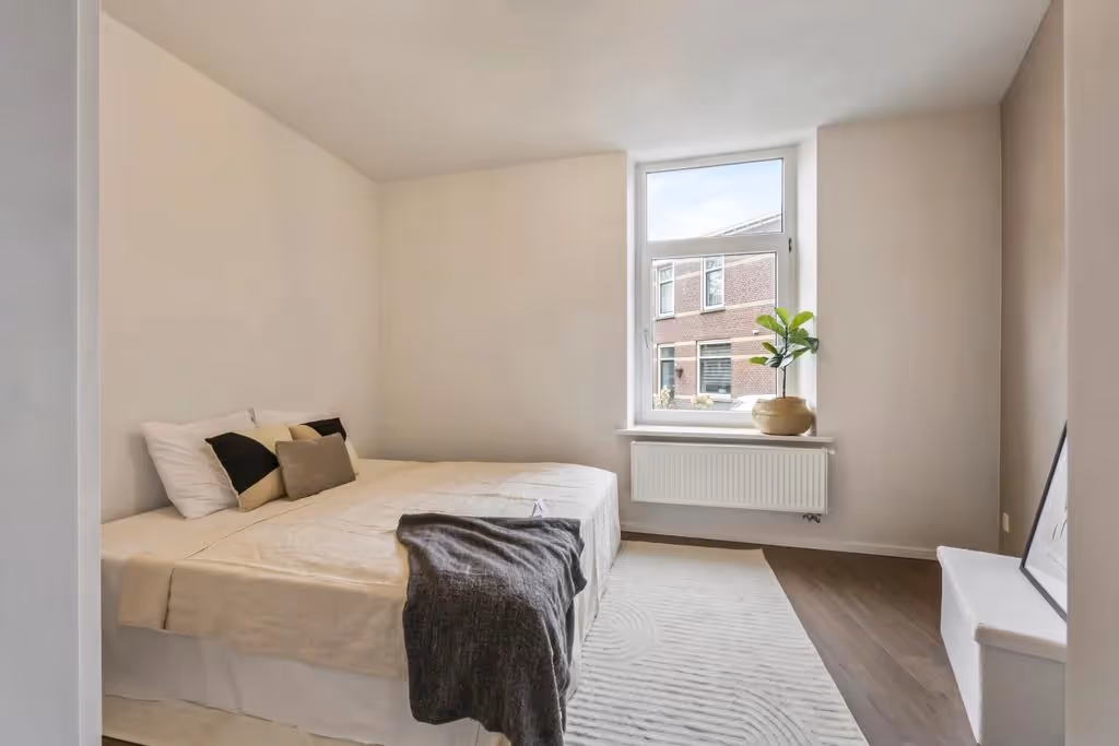Vanuit de woonkamer zijn de slaapkamer en de badkamer te bereiken. Ook de badkamer is gemoderniseerd in 2024 en bestaat uit een inloopdouche, zwevend toilet en luxe wastafelmeubel. Verder bevindt zich in de badkamer de aansluiting voor de wasmachine. De slaapkamer van het appartement ligt aan de voorzijde en heeft hetzelfde fraaie niveau van afwerking, als de rest van het appartement.