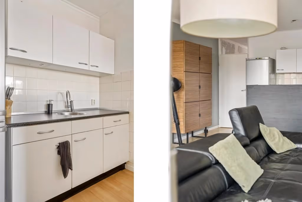 De woonkamer is verdeeld in een zit- en eethoek en door het feit dat het appartement grote kozijnen heeft, heeft het lekker veel lichtinval.