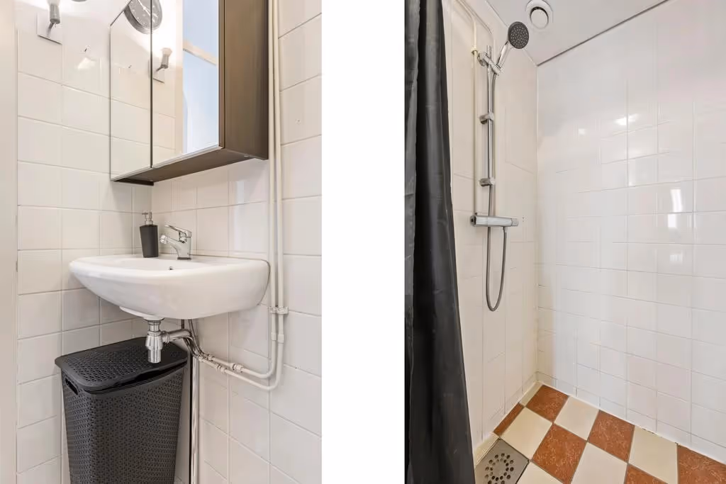 De slaapkamer van dit appartement grenst aan de zijde van de galerij en is ook mooi licht. Vanuit de slaapkamer is de badkamer te bereiken. Deze badkamer heeft een wastafel, douche en wasmachineaansluiting. Tenslotte ligt in het appartement nog een apart toilet, bereikbaar via de hal.