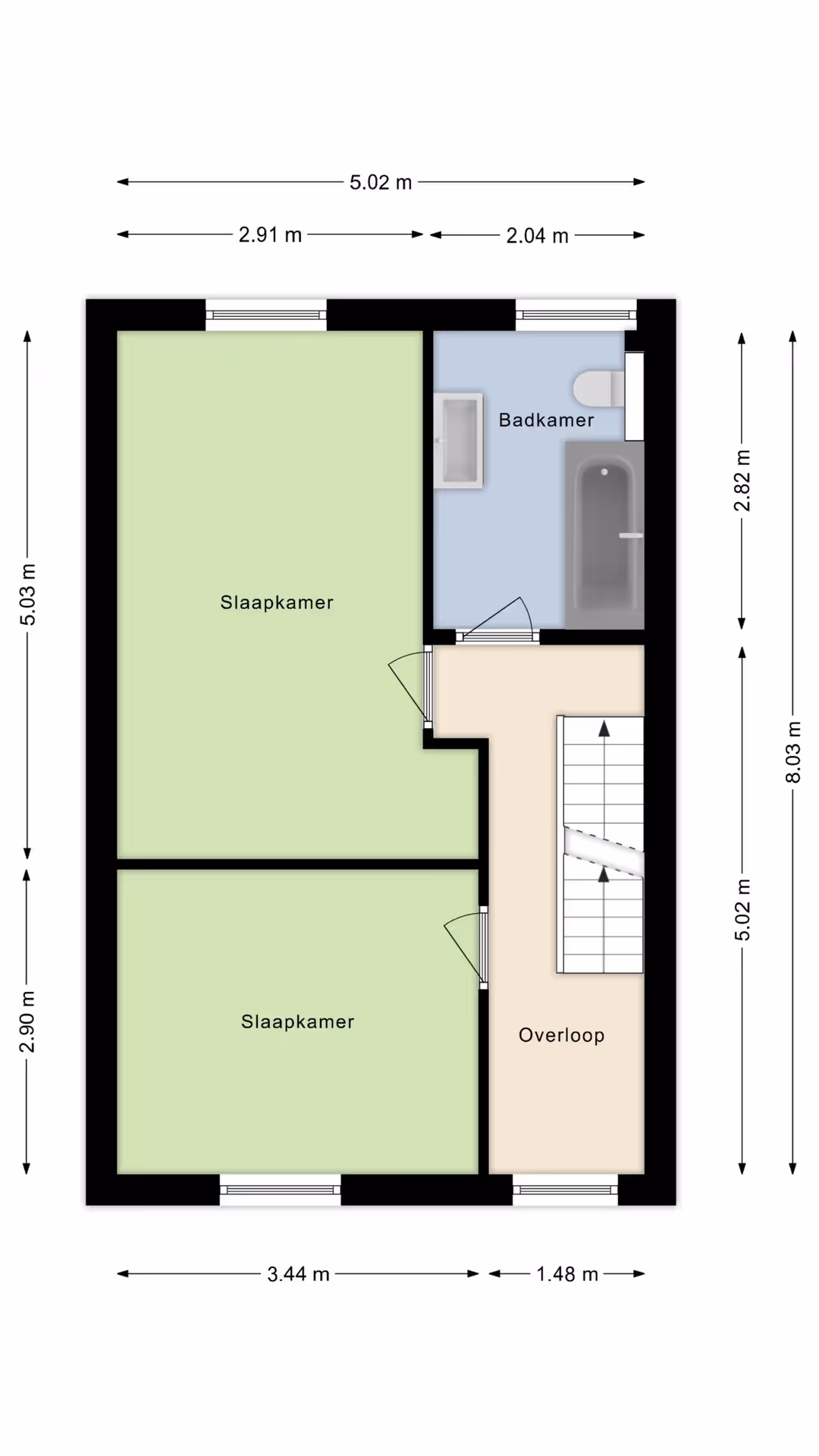 Via de overloop op de 1e verdieping zijn 2 ruime slaapkamers en de badkamer toegankelijk. Deze badkamer bevat een ligbad met douchecombinatie, een wastafelmeubel met dubbele wastafel en een 3e toilet. De beide slaapkamers op deze verdieping hebben een keurig niveau van afwerking en kunststof kozijnen met dubbele beglazing, net als de badkamer.