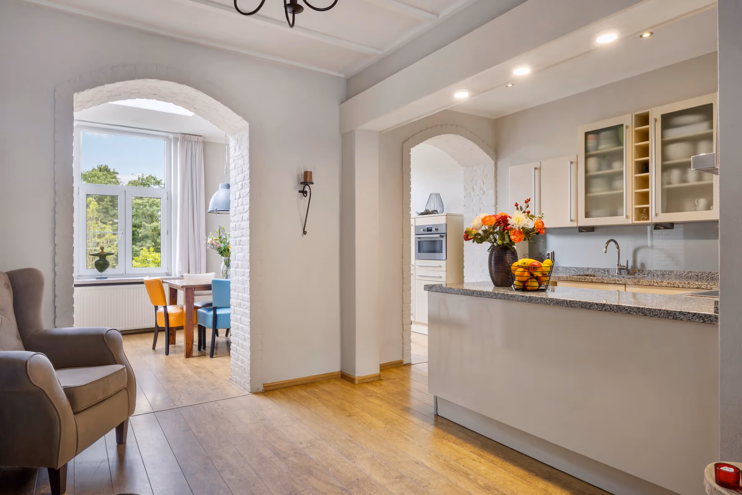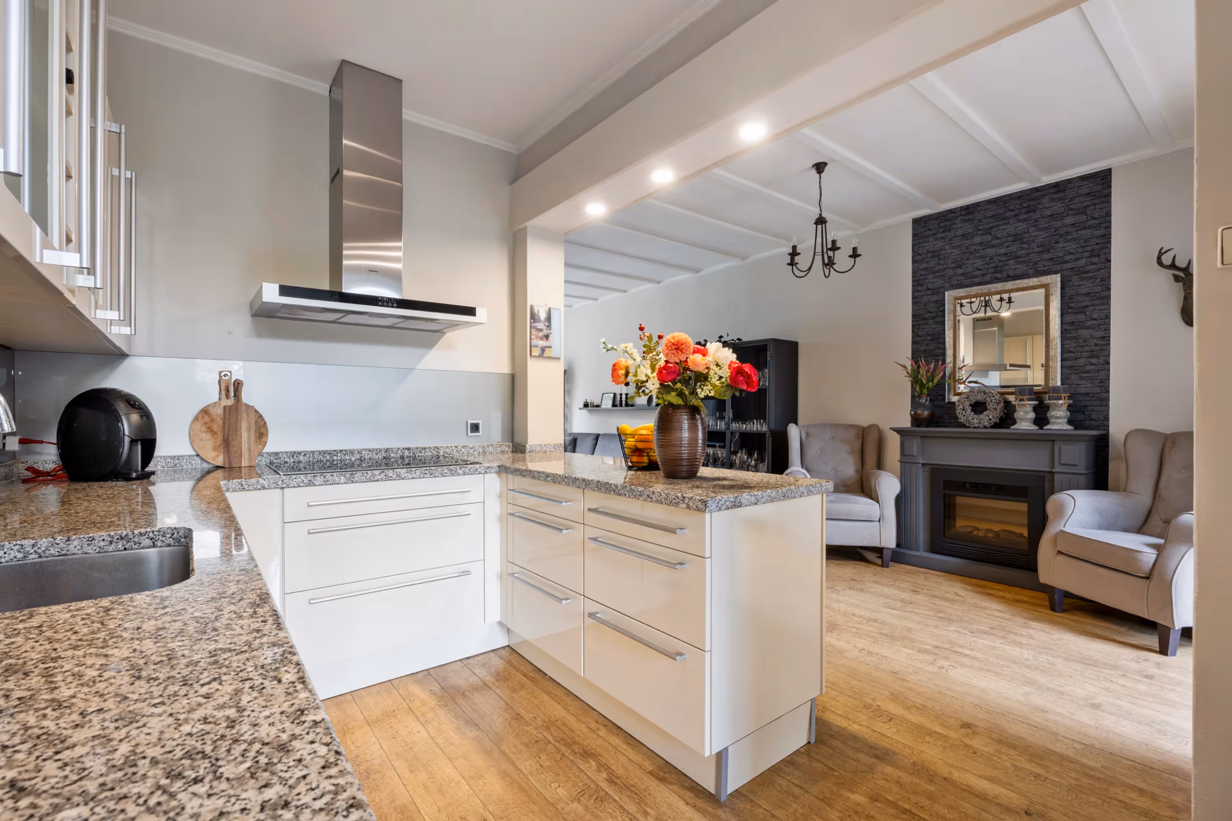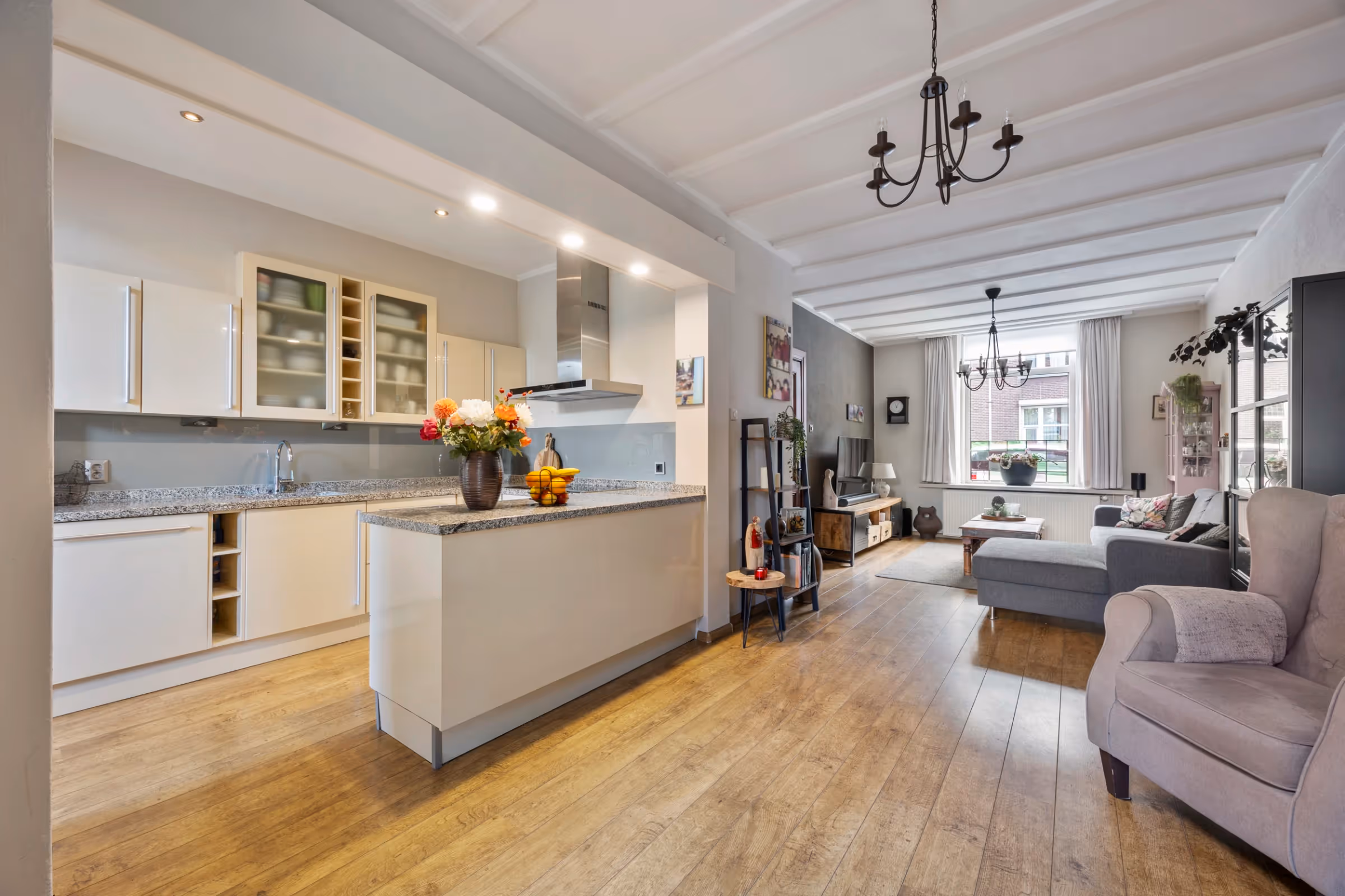 Bij de entree van dit sfeervolle woonhuis valt de mooie, houten trappartij gelijk op. Verder liggen in de hal het gastentoilet en de meterkast. De woonkamer is meer dan 11 meter lang, aangezien deze aan de achterzijde is uitgebreid met een aanbouw. Hier bevindt zich momenteel de eethoek, met prachtig zicht op de achtertuin. De keuken ligt in het midden van de ruimte en heeft een U-opstelling met veel kastruimte, een barretje en de volgende inbouwapparatuur: een 5-pits inductiekookplaat met RVS afzuigkap, koelkast, combi-oven en vaatwasser. Tenslotte heeft de keuken een fraai, natuurstenen blad met veel werkruimte.