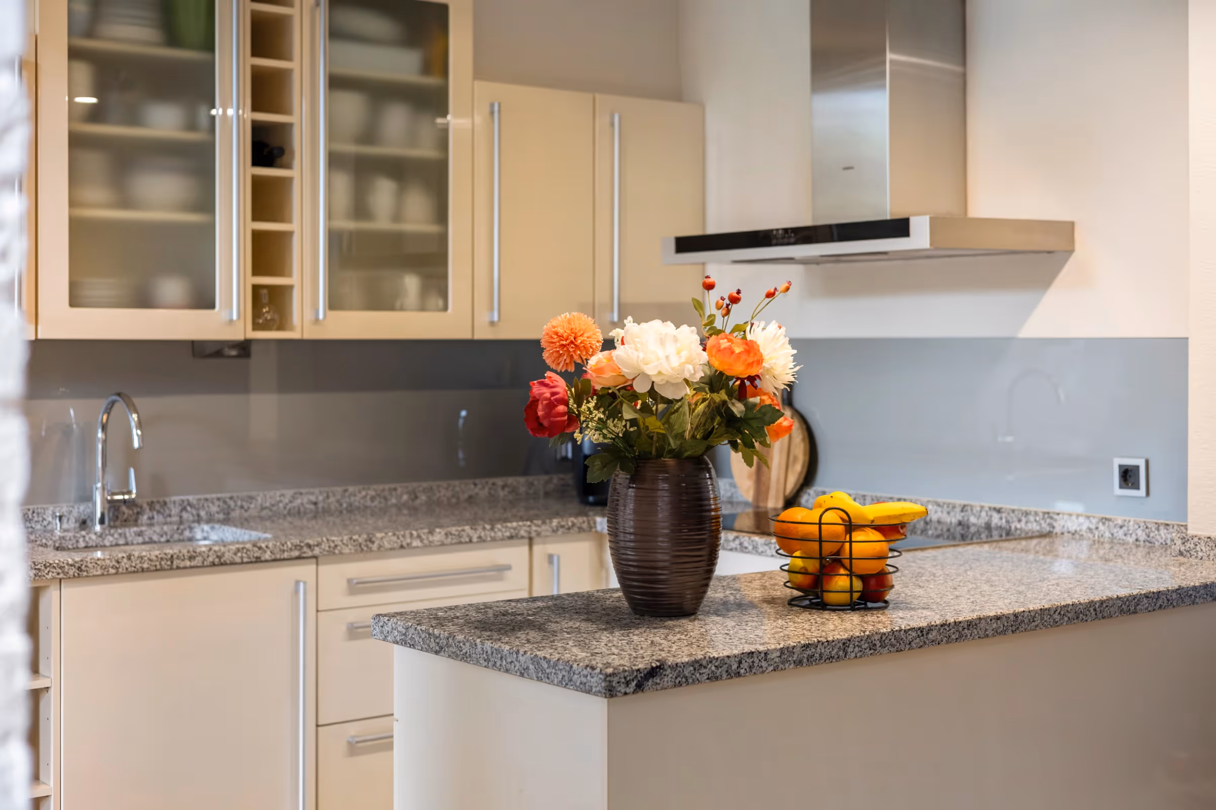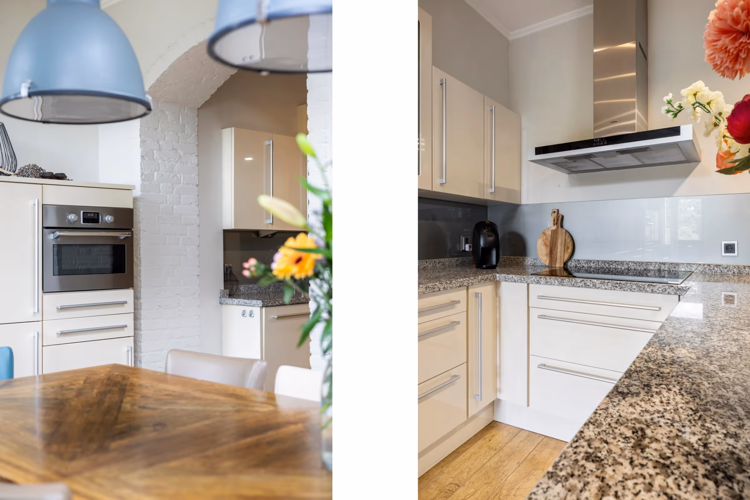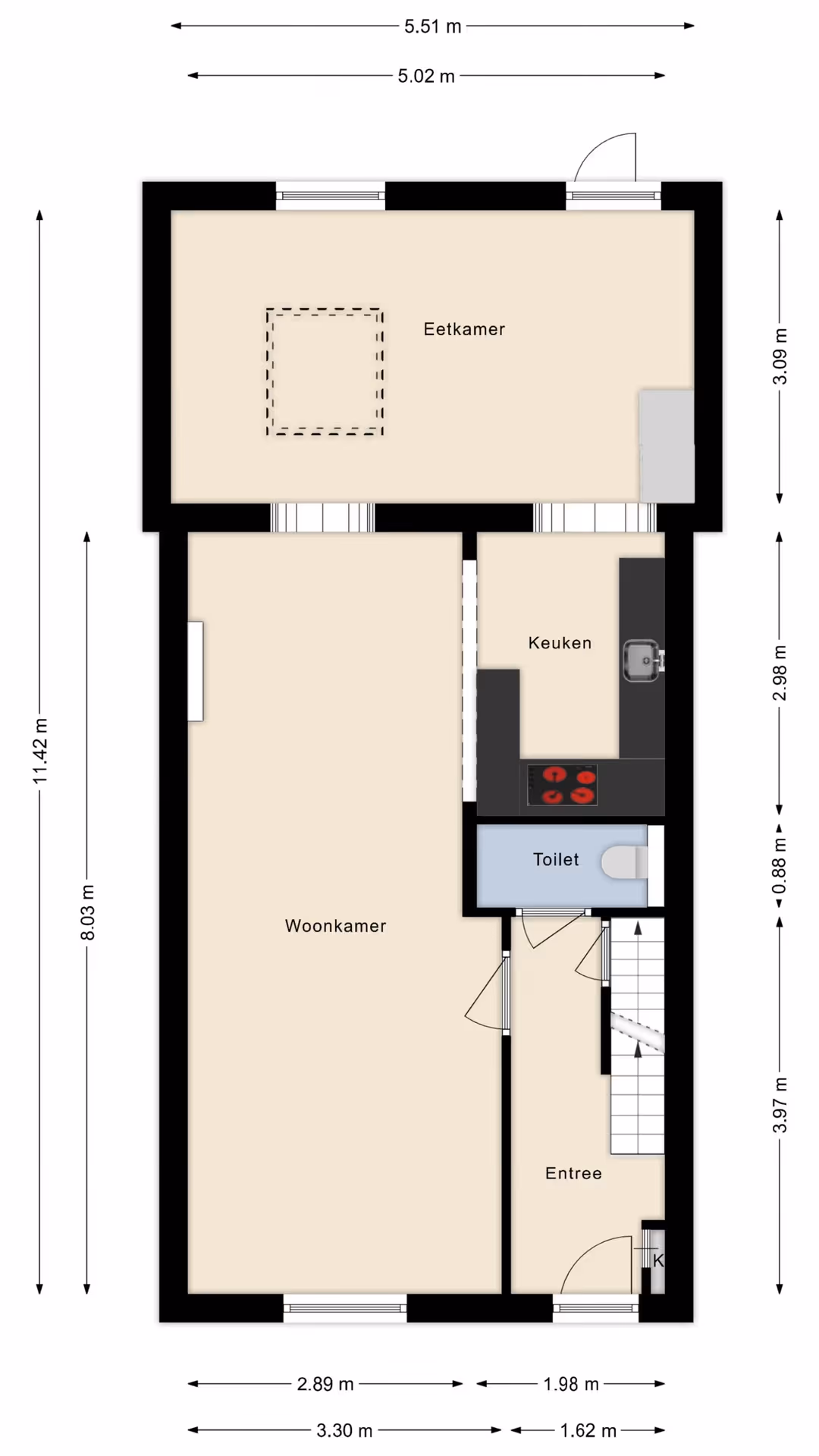 Bij de entree van dit sfeervolle woonhuis valt de mooie, houten trappartij gelijk op. Verder liggen in de hal het gastentoilet en de meterkast. De woonkamer is meer dan 11 meter lang, aangezien deze aan de achterzijde is uitgebreid met een aanbouw. Hier bevindt zich momenteel de eethoek, met prachtig zicht op de achtertuin. De keuken ligt in het midden van de ruimte en heeft een U-opstelling met veel kastruimte, een barretje en de volgende inbouwapparatuur: een 5-pits inductiekookplaat met RVS afzuigkap, koelkast, combi-oven en vaatwasser. Tenslotte heeft de keuken een fraai, natuurstenen blad met veel werkruimte.