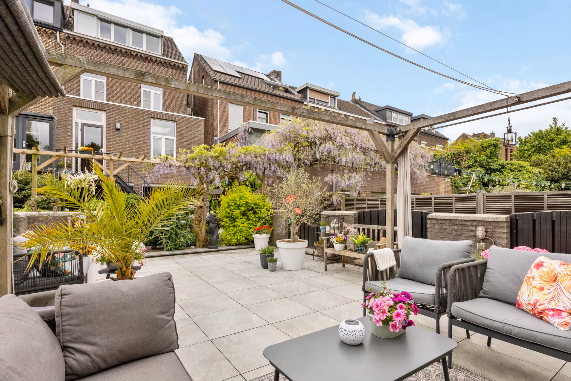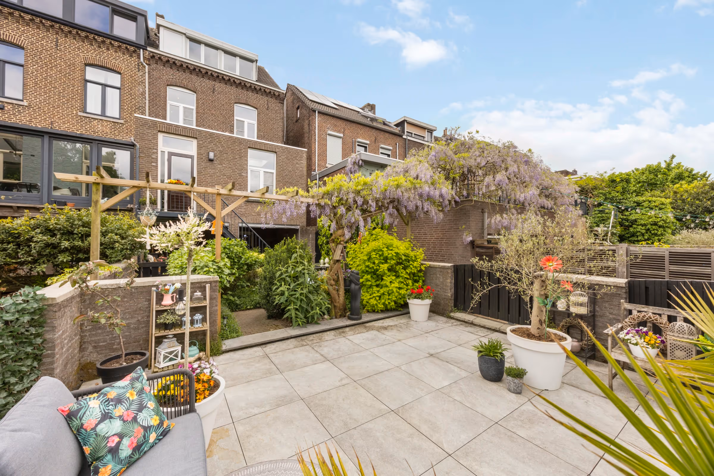 De tuin van dit herenhuis is royaal en prachtig aangelegd met veel groen en beplanting. Verder heeft deze tuin geen buren aan de achterzijde en beschikt deze over 3 terrassen. Eén van deze terrassen ligt op het dak van de garage. Deze vrijstaande garage is zeer ruim; de afmetingen zijn 5,27 x 7,92 meter en hij is via een ventweg aan de achterzijde te bereiken met een auto of werkbus. Onder de aanbouw van deze sfeervolle woning ligt het overdekte terras. Hier kun je zelfs bij regenachtig weer heerlijk vertoeven, zodat je altijd kunt genieten van deze prachtige tuin. Tenslotte ligt naast de woning nog een paadje, waardoor de tuin ook over een eigen achterom beschikt, die via dit paadje is te bereiken.