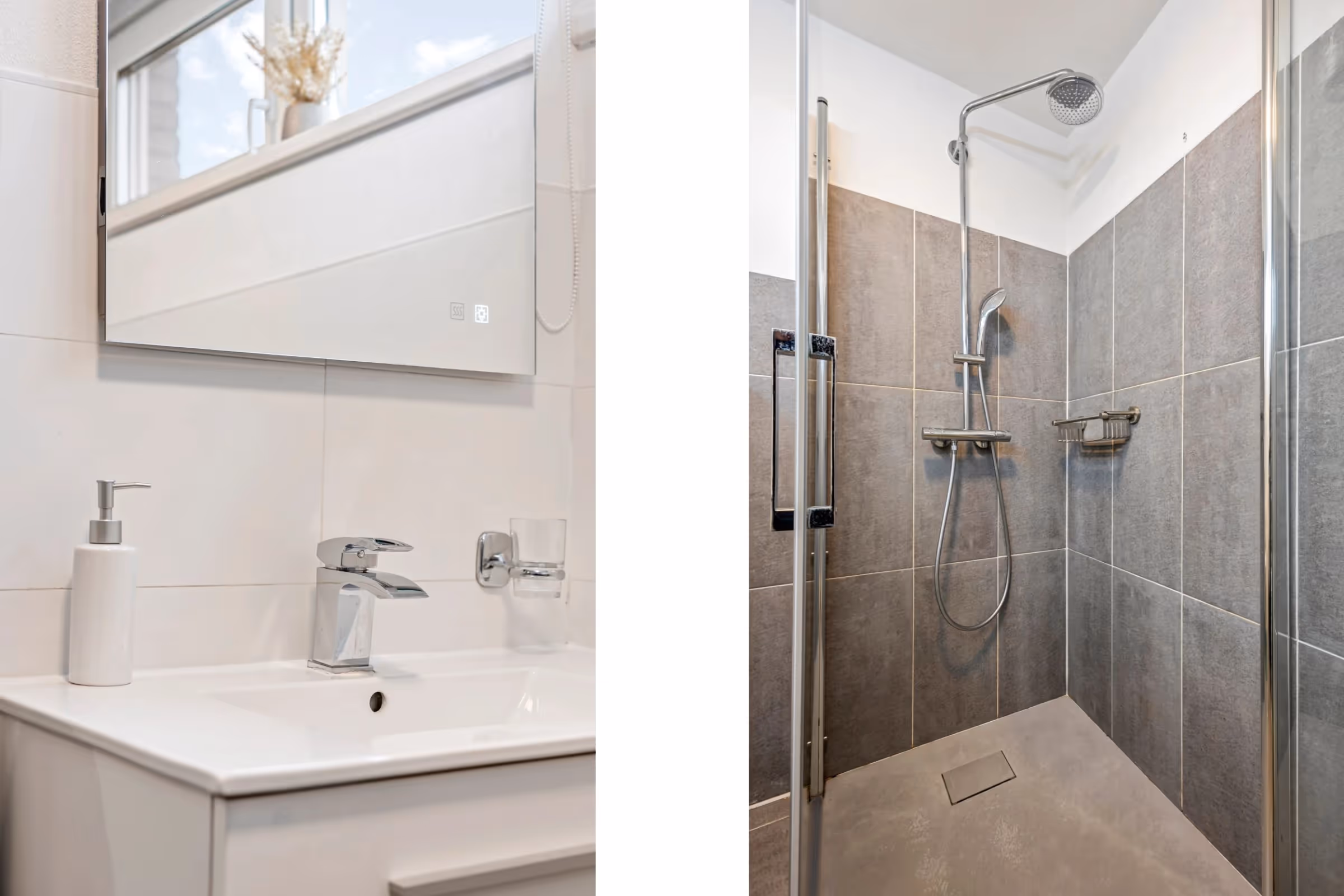 Via de overloop op de 1e verdieping zijn de 3 nette slaapkamers en de moderne badkamer (2017) te bereiken. De badkamer bevat een 2e toilet, een wastafelmeubel en een inloopdouche. Ook heeft de badkamer vloerverwarming. De 3 slaapkamers hebben een keurig niveau van afwerking, met laminaatvloeren en kunststof kozijnen met triple beglazing en rolluiken. Op de overloop is tevens een bergkast met aansluiting voor de wasmachine. Ideaal toch?