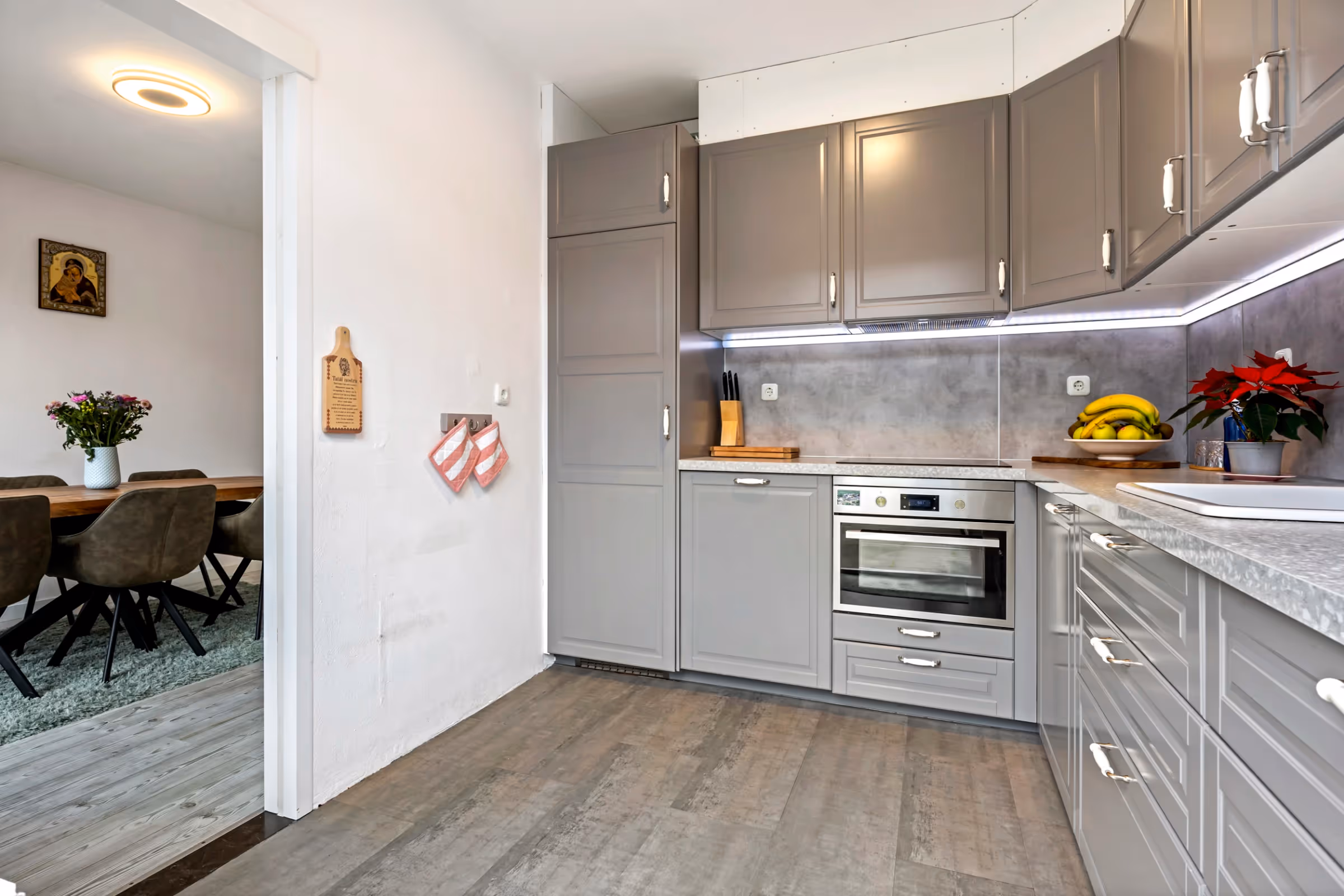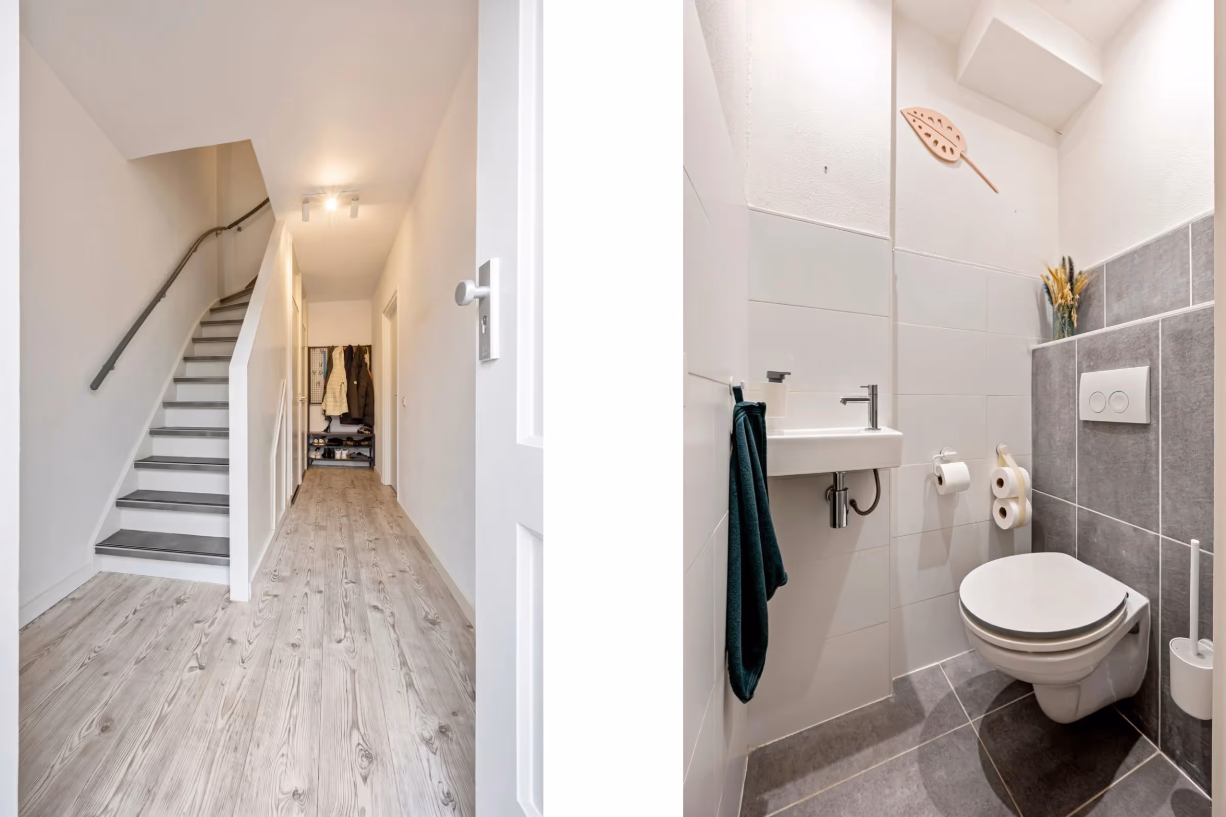 Entree in de hal met zwevend toilet met fonteintje, meterkast, trapkast en toegang tot de woonkamer. In de woonkamer is er sprake van een mooie lichtinval door de riante kozijnen aan voor- en achterzijde. De woonkamer heeft voorts een uitstekend niveau van afwerking, met o.a. een nette laminaatvloer. Ook staat deze in verbinding met de keuken aan de achterzijde. Deze keuken heeft een grijs keukenblok met de volgende inbouwapparatuur: een 4-pits kookplaat, afzuigkap, koelkast, combi magnetron en vaatwasser. Tenslotte is vanuit de keuken de tuin te bereiken.