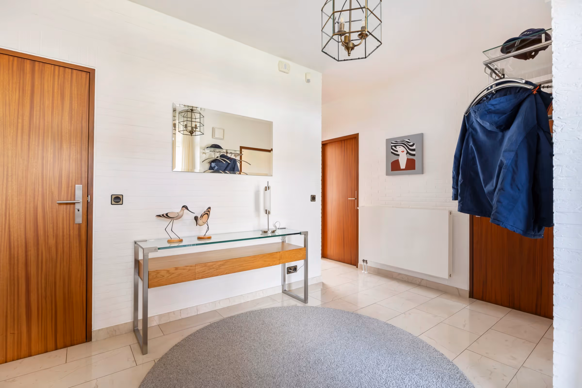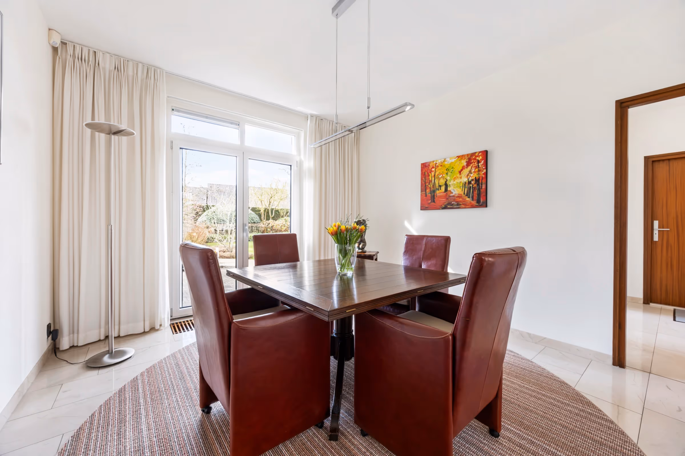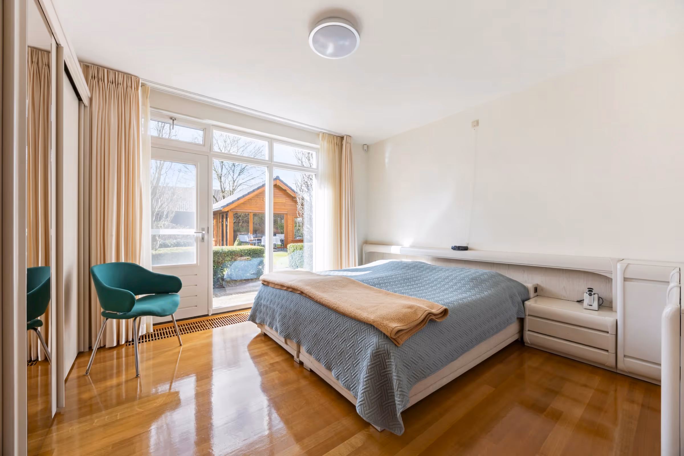 Vanuit de centrale hal zijn ook het gastentoilet, de beide slaapkamers en de badkamer bereikbaar en de trapopgang tot de eerste verdieping. De logeerkamer ligt aan de voorzijde. De badkamer beschikt over een ligbad met douchecombinatie, een 2e toilet, een designradiator en wastafel. De hoofdslaapkamer ligt aan de achterzijde van deze semi-bungalow en heeft eveneens een mooi zicht op de tuin. Ook hier raampartijen tot vloerniveau en deze slaapkamer is voldoende ruim om plaats te bieden aan een grote kledingkast. Tenslotte heeft de woning nog een ruime