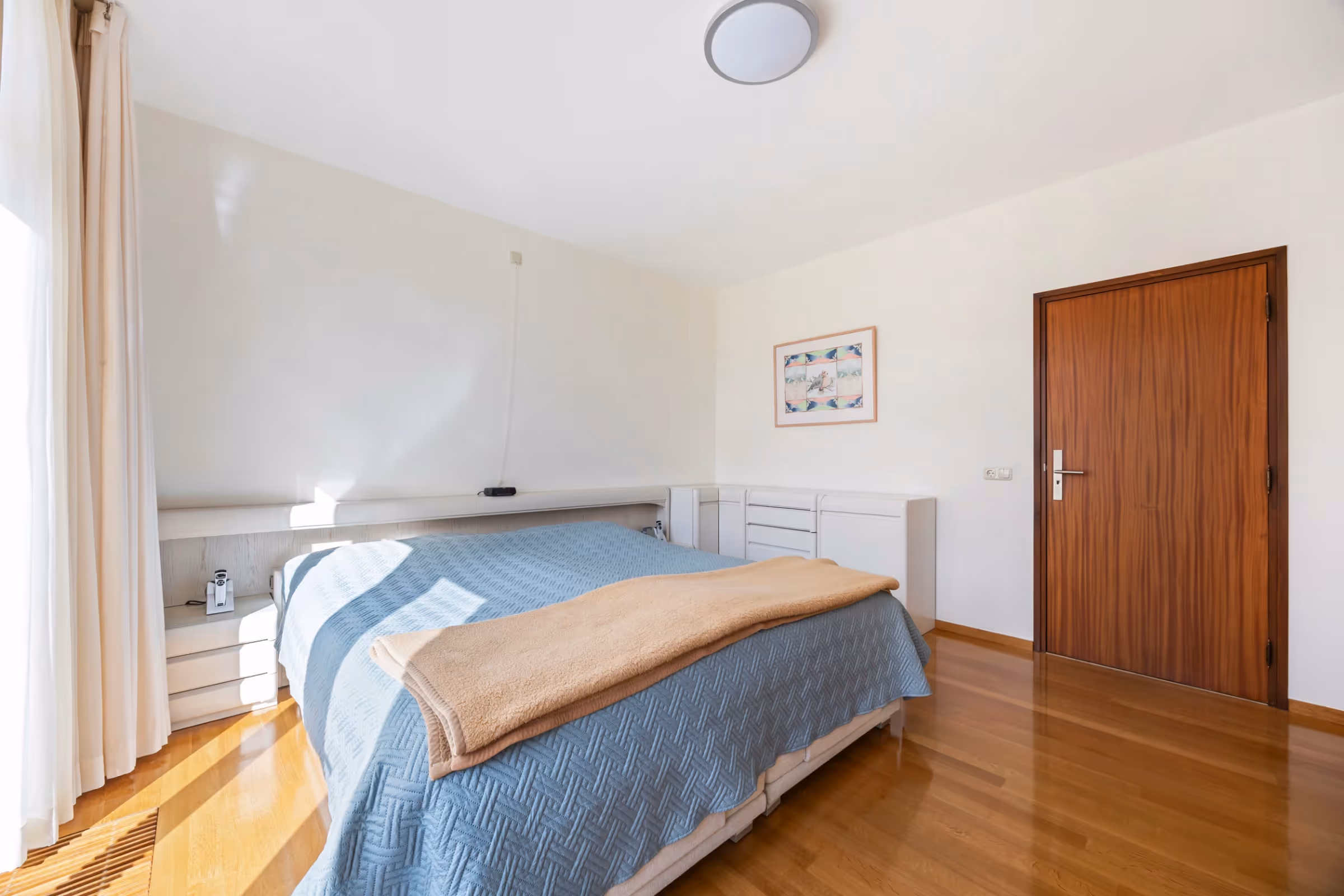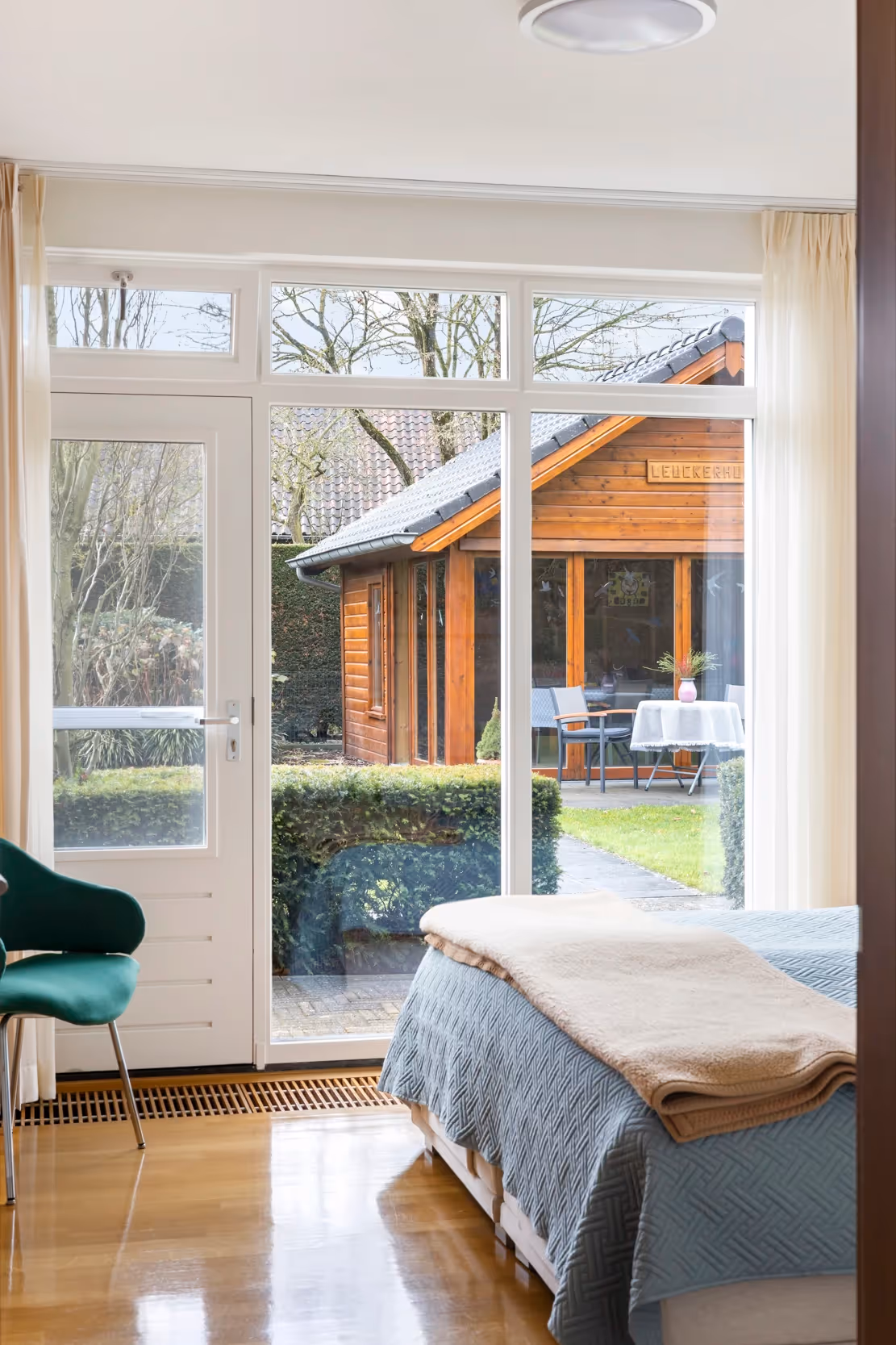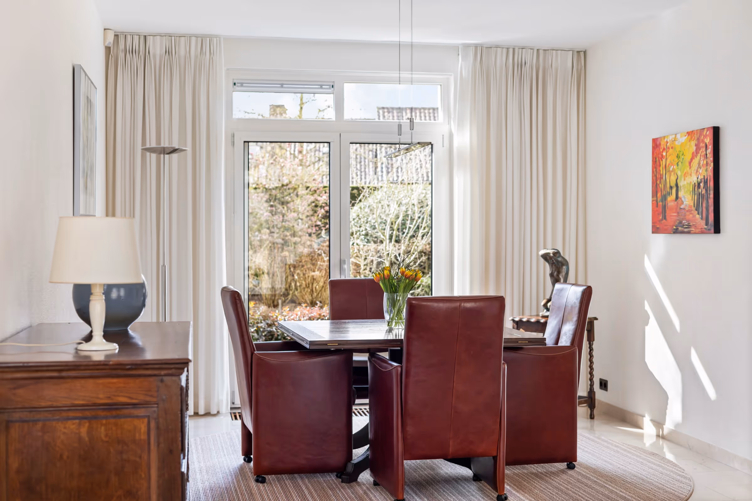 Vanuit de centrale hal zijn ook het gastentoilet, de beide slaapkamers en de badkamer bereikbaar en de trapopgang tot de eerste verdieping. De logeerkamer ligt aan de voorzijde. De badkamer beschikt over een ligbad met douchecombinatie, een 2e toilet, een designradiator en wastafel. De hoofdslaapkamer ligt aan de achterzijde van deze semi-bungalow en heeft eveneens een mooi zicht op de tuin. Ook hier raampartijen tot vloerniveau en deze slaapkamer is voldoende ruim om plaats te bieden aan een grote kledingkast. Tenslotte heeft de woning nog een ruime