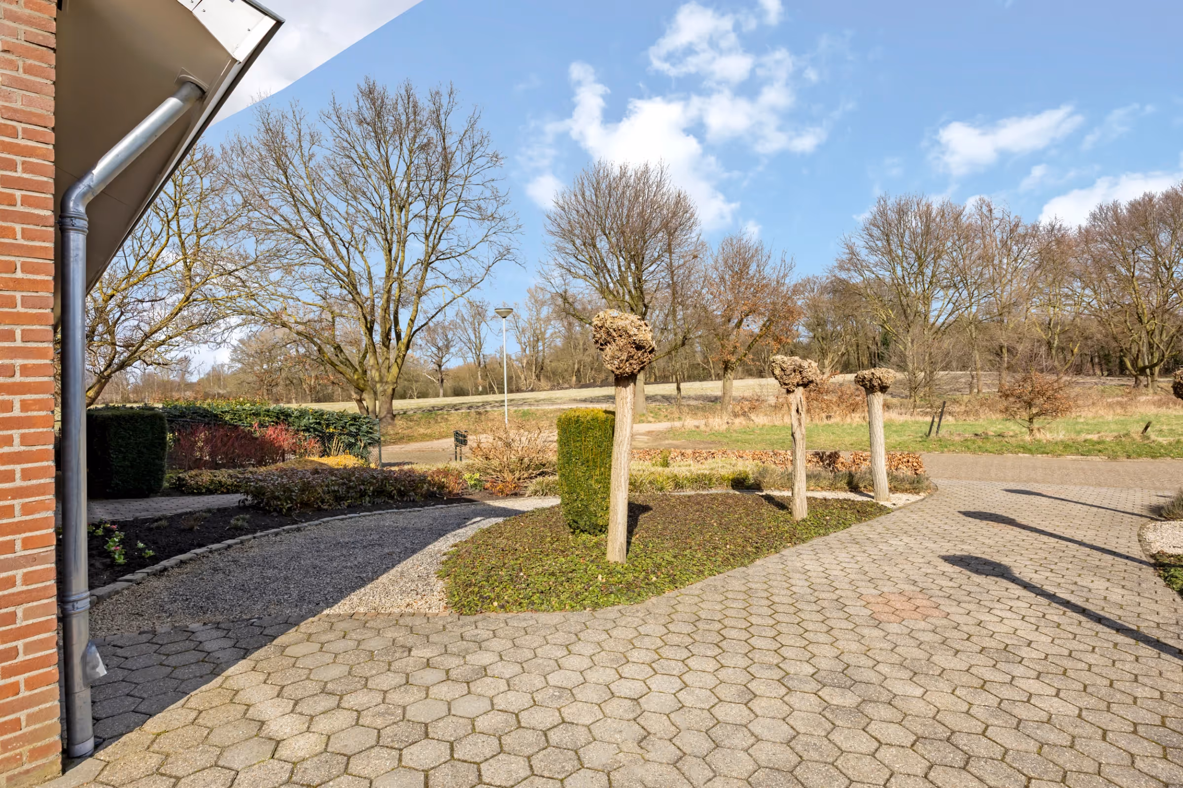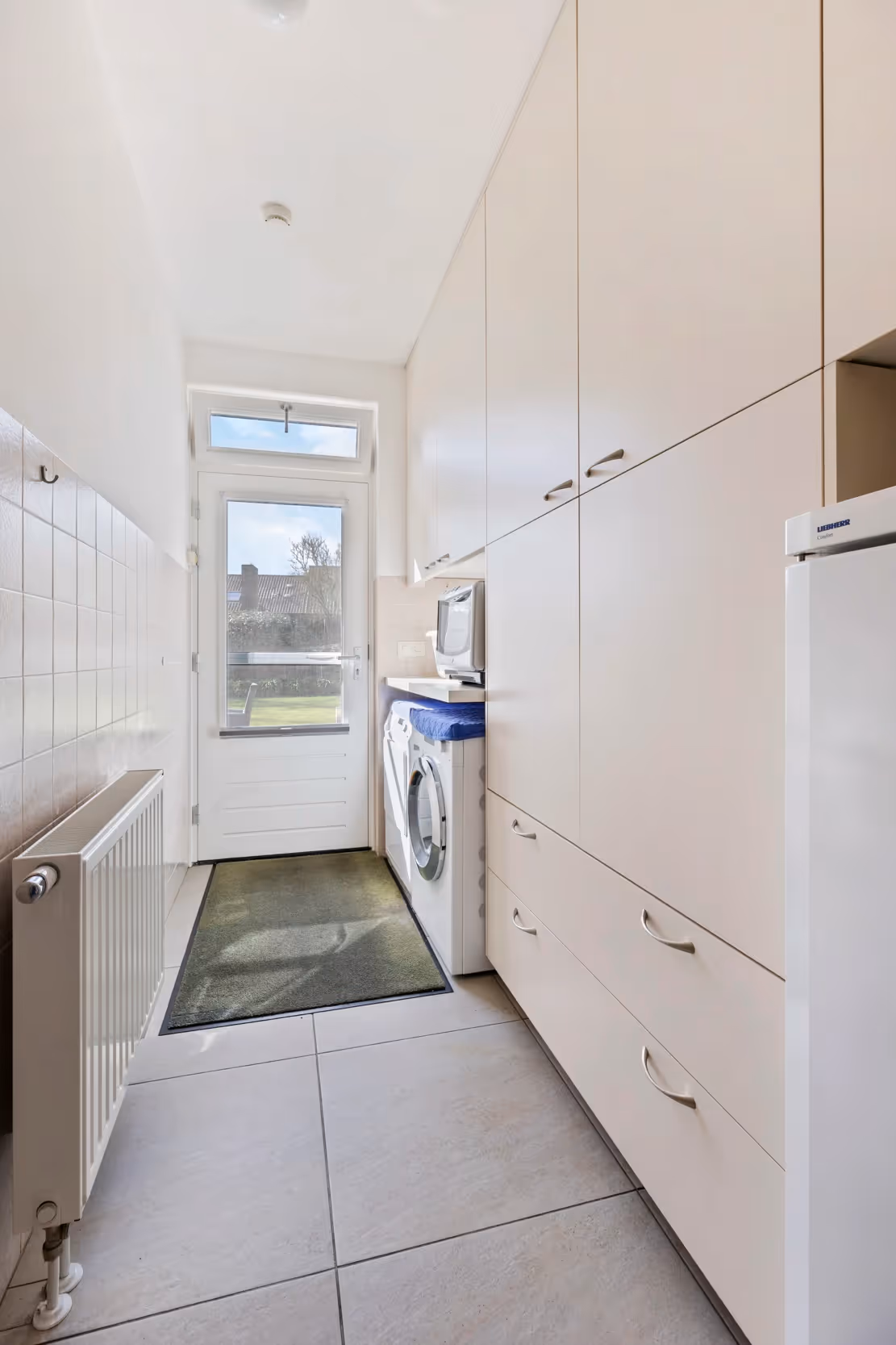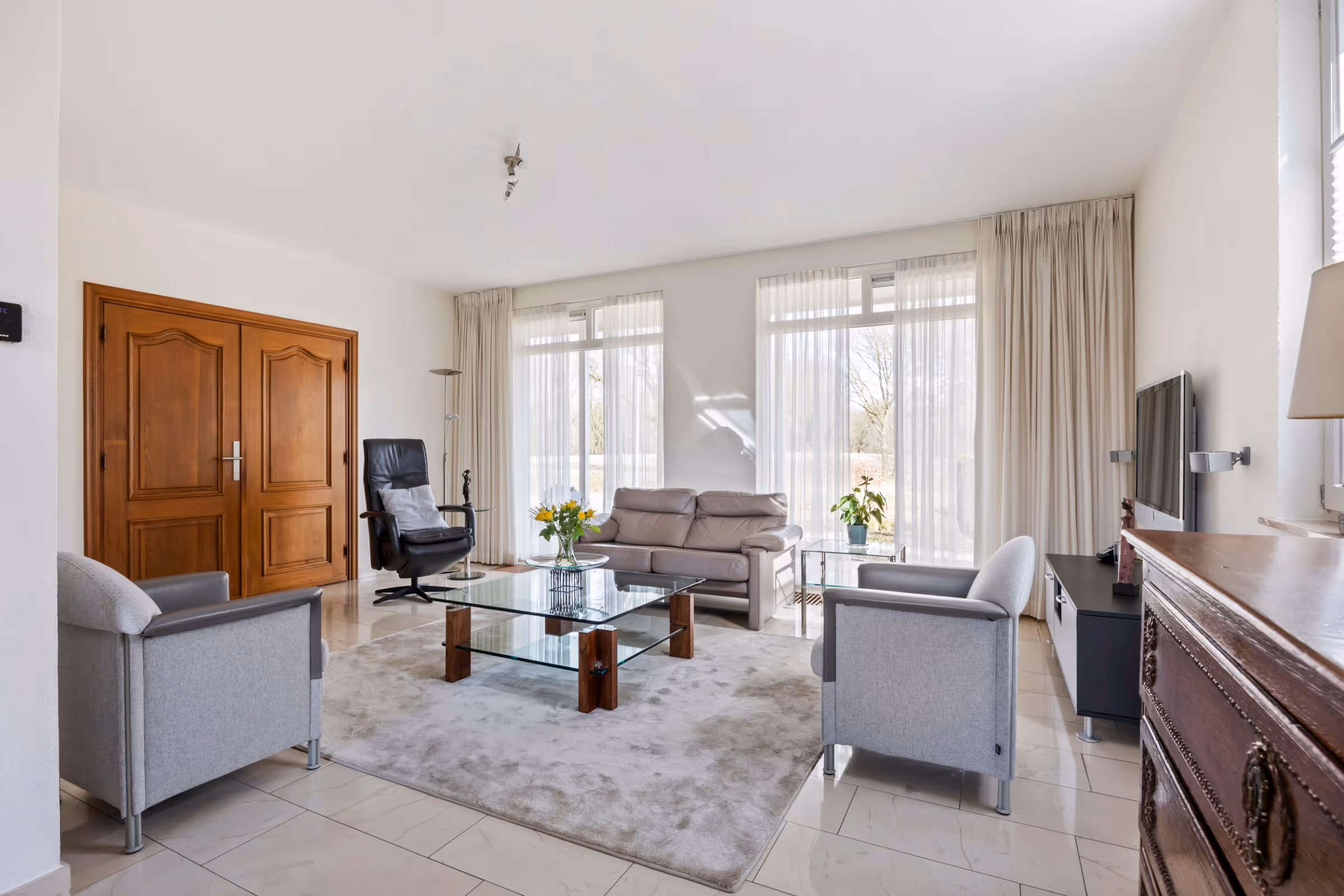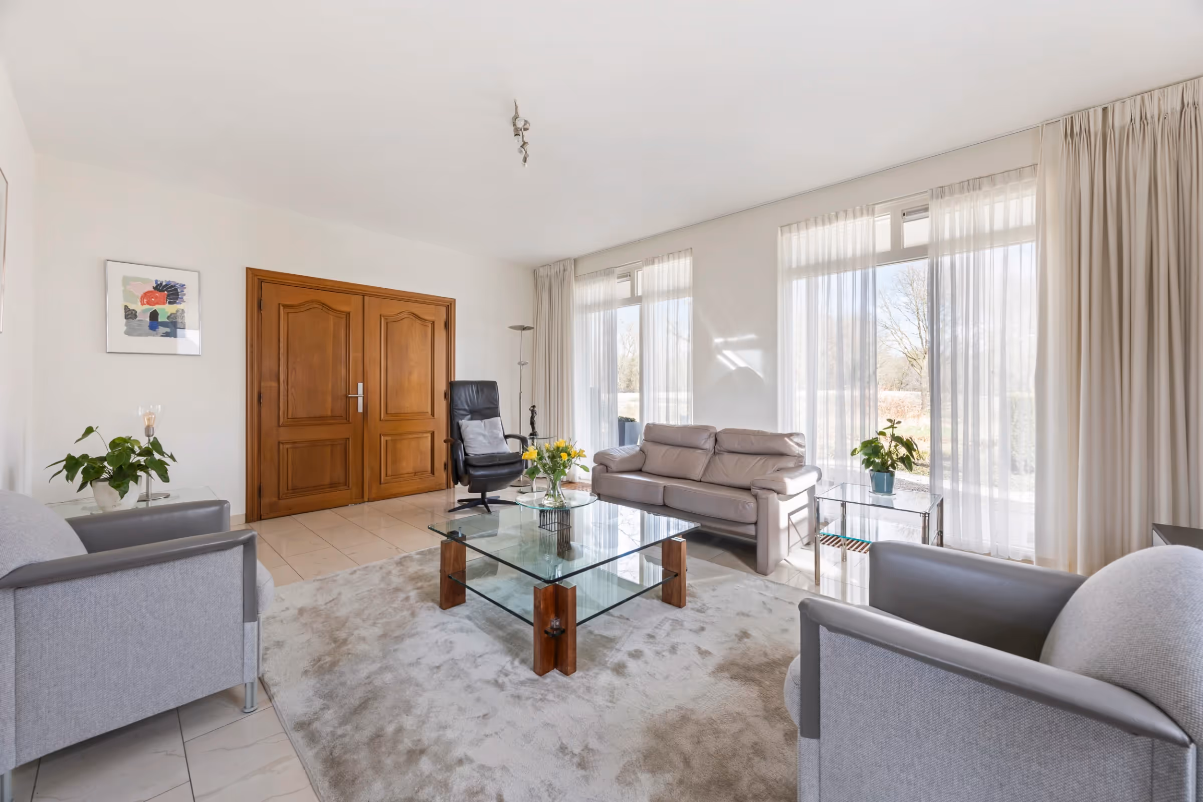 U komt binnen in de ruime entreehal met toegang tot alle kamers in de woning. De woonkamer, in L-vorm en met grote raampartijen tot vloerniveau, baadt in een zee van daglicht. Aan de voorzijde het uitzicht over de landerijen en een wandelpad, aan de achterzijde zicht op de prachtige tuin waarover deze woning beschikt. De woonkamer heeft verder een rustige, neutrale natuurstenen vloer. Vanuit de woonkamer is de keuken toegankelijk. Deze beschikt over een keukenopstelling met de volgende inbouwapparatuur: 4-pits inductie kookplaat, combi-oven en een 2e oven, een koelkast en een vaatwasser. Vanuit de keuken is vervolgens de bijkeuken bereikbaar, waar behalve veel bergruimte in maatwerkkasten, ook de aansluitpunten voor het witgoed zijn.