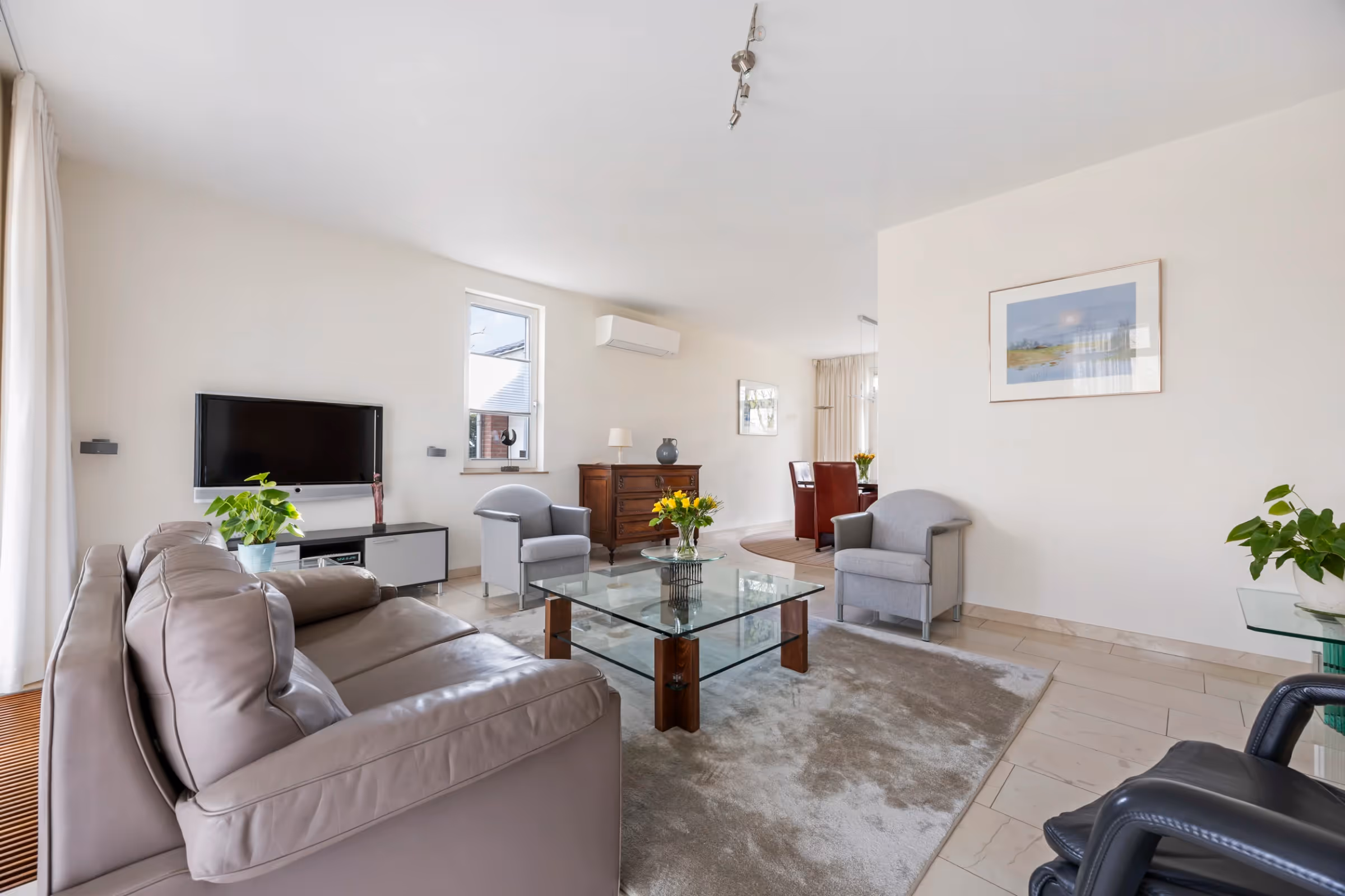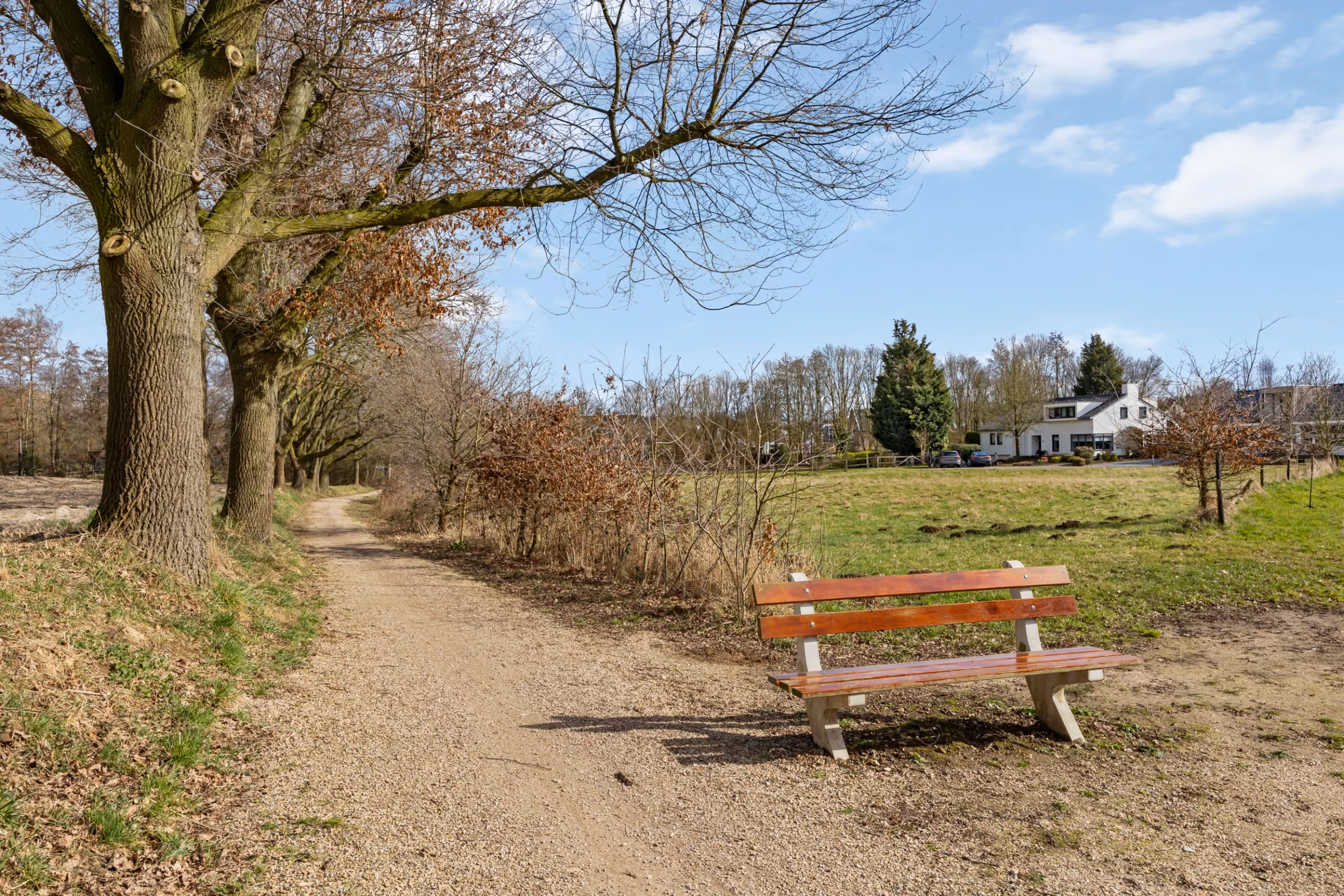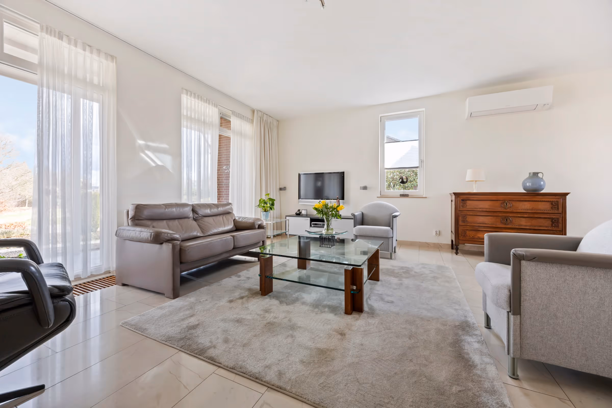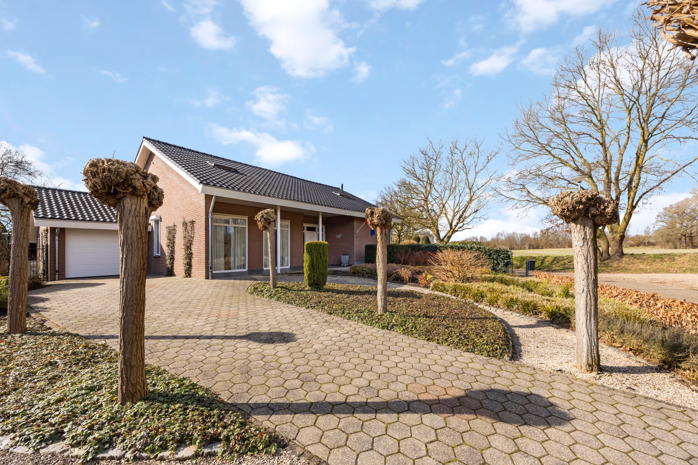 U komt binnen in de ruime entreehal met toegang tot alle kamers in de woning. De woonkamer, in L-vorm en met grote raampartijen tot vloerniveau, baadt in een zee van daglicht. Aan de voorzijde het uitzicht over de landerijen en een wandelpad, aan de achterzijde zicht op de prachtige tuin waarover deze woning beschikt. De woonkamer heeft verder een rustige, neutrale natuurstenen vloer. Vanuit de woonkamer is de keuken toegankelijk. Deze beschikt over een keukenopstelling met de volgende inbouwapparatuur: 4-pits inductie kookplaat, combi-oven en een 2e oven, een koelkast en een vaatwasser. Vanuit de keuken is vervolgens de bijkeuken bereikbaar, waar behalve veel bergruimte in maatwerkkasten, ook de aansluitpunten voor het witgoed zijn.