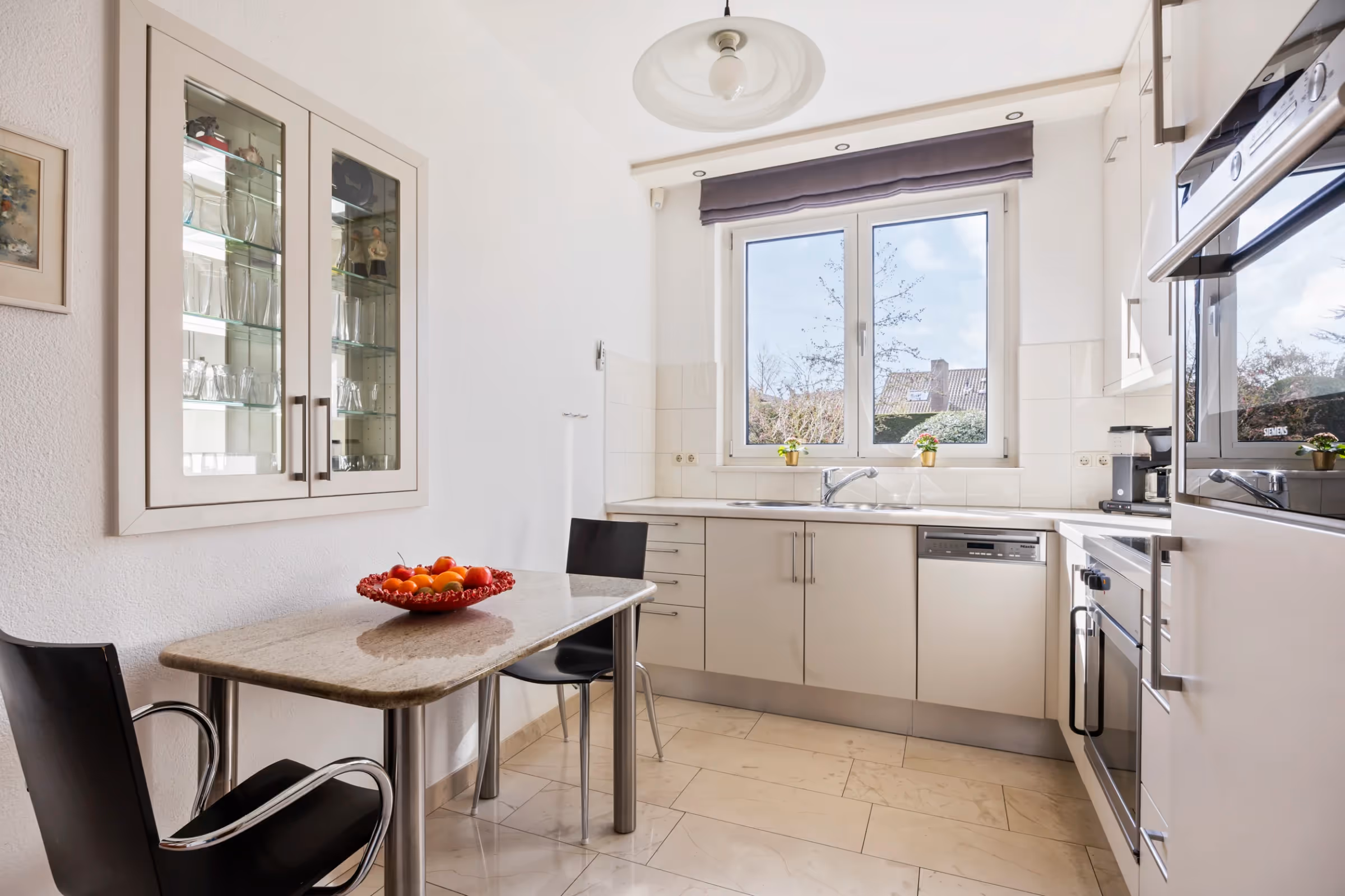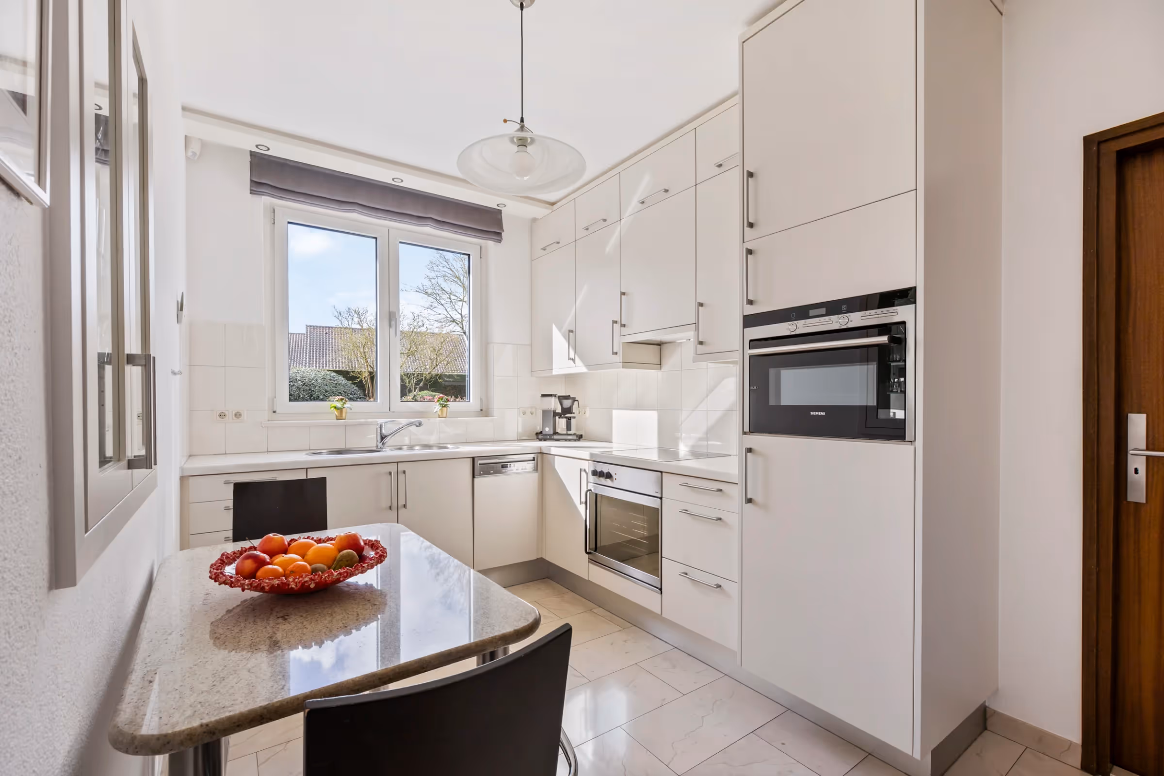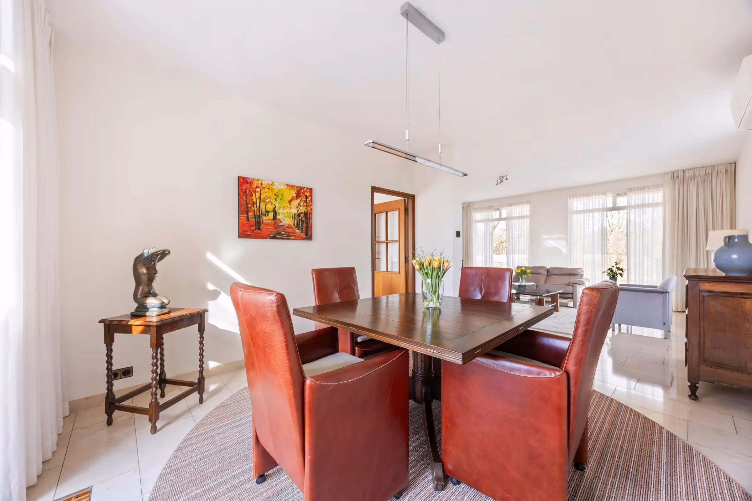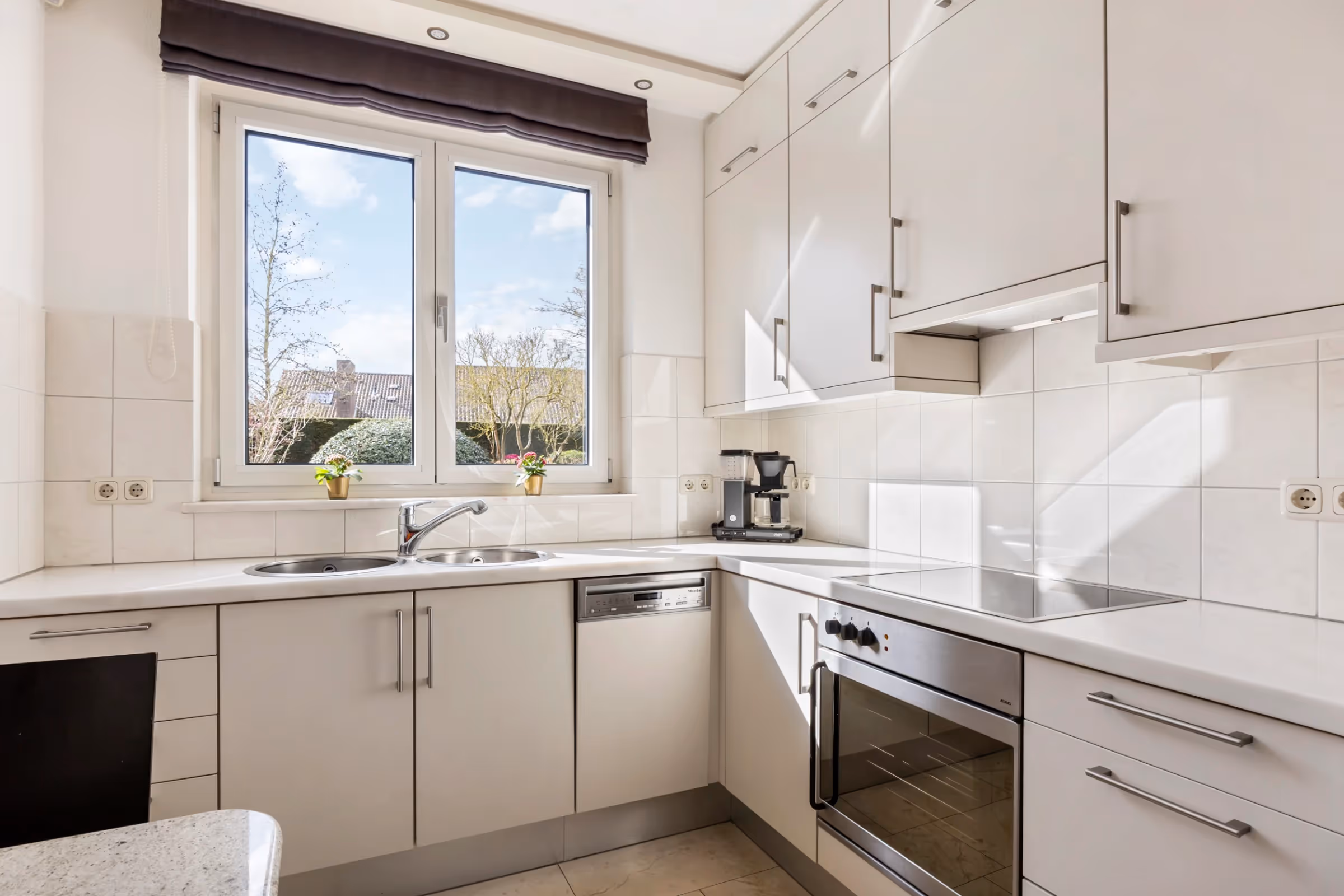 U komt binnen in de ruime entreehal met toegang tot alle kamers in de woning. De woonkamer, in L-vorm en met grote raampartijen tot vloerniveau, baadt in een zee van daglicht. Aan de voorzijde het uitzicht over de landerijen en een wandelpad, aan de achterzijde zicht op de prachtige tuin waarover deze woning beschikt. De woonkamer heeft verder een rustige, neutrale natuurstenen vloer. Vanuit de woonkamer is de keuken toegankelijk. Deze beschikt over een keukenopstelling met de volgende inbouwapparatuur: 4-pits inductie kookplaat, combi-oven en een 2e oven, een koelkast en een vaatwasser. Vanuit de keuken is vervolgens de bijkeuken bereikbaar, waar behalve veel bergruimte in maatwerkkasten, ook de aansluitpunten voor het witgoed zijn.