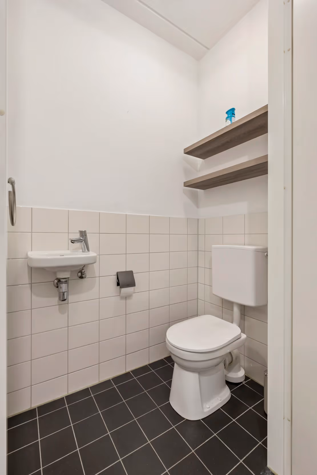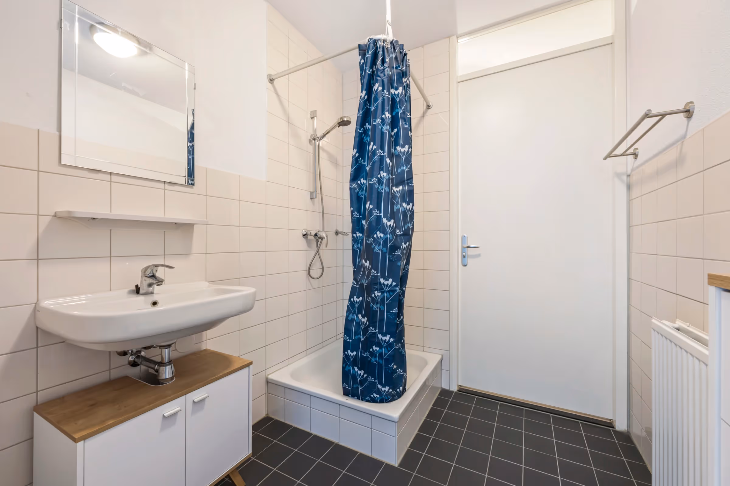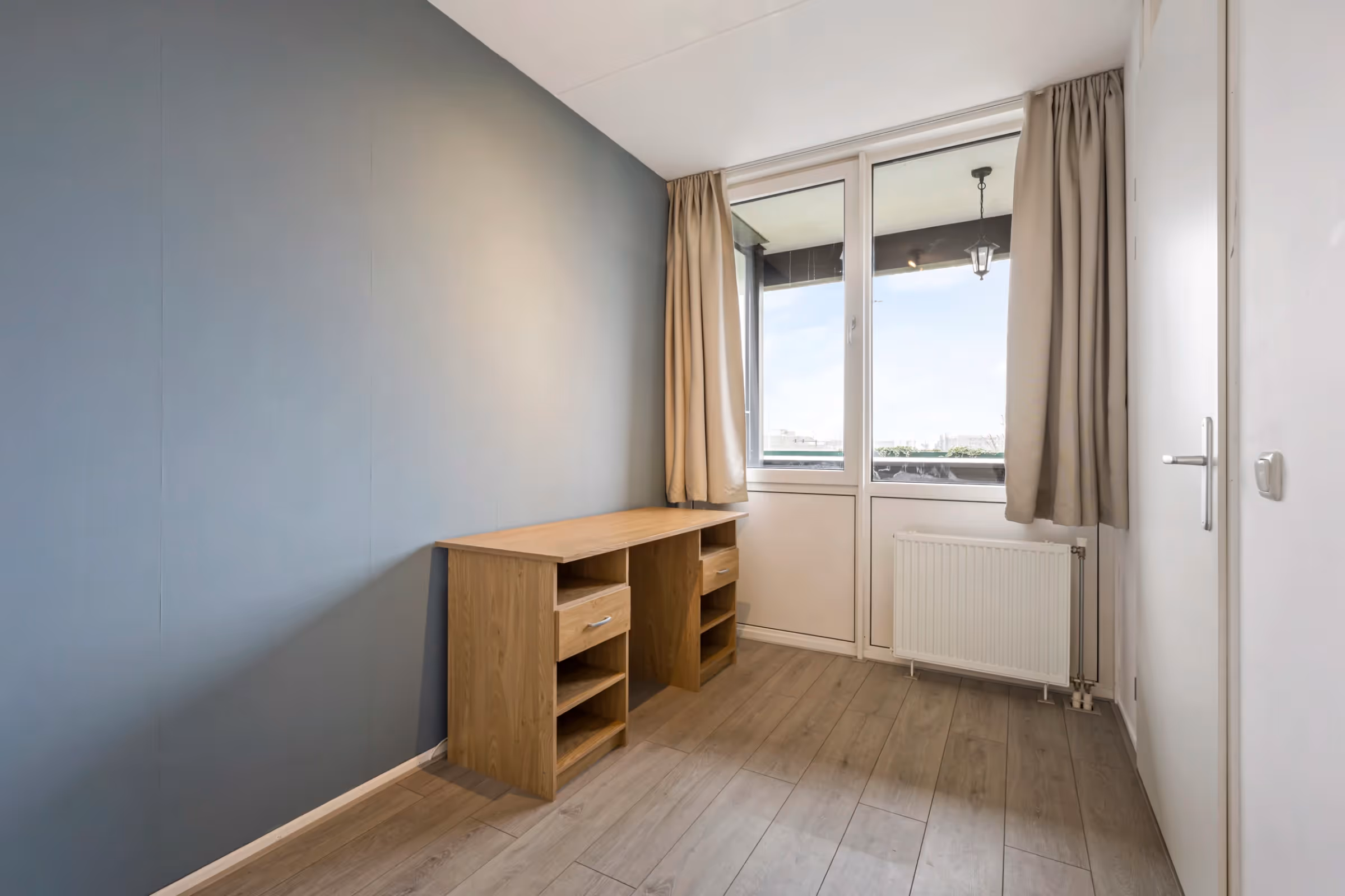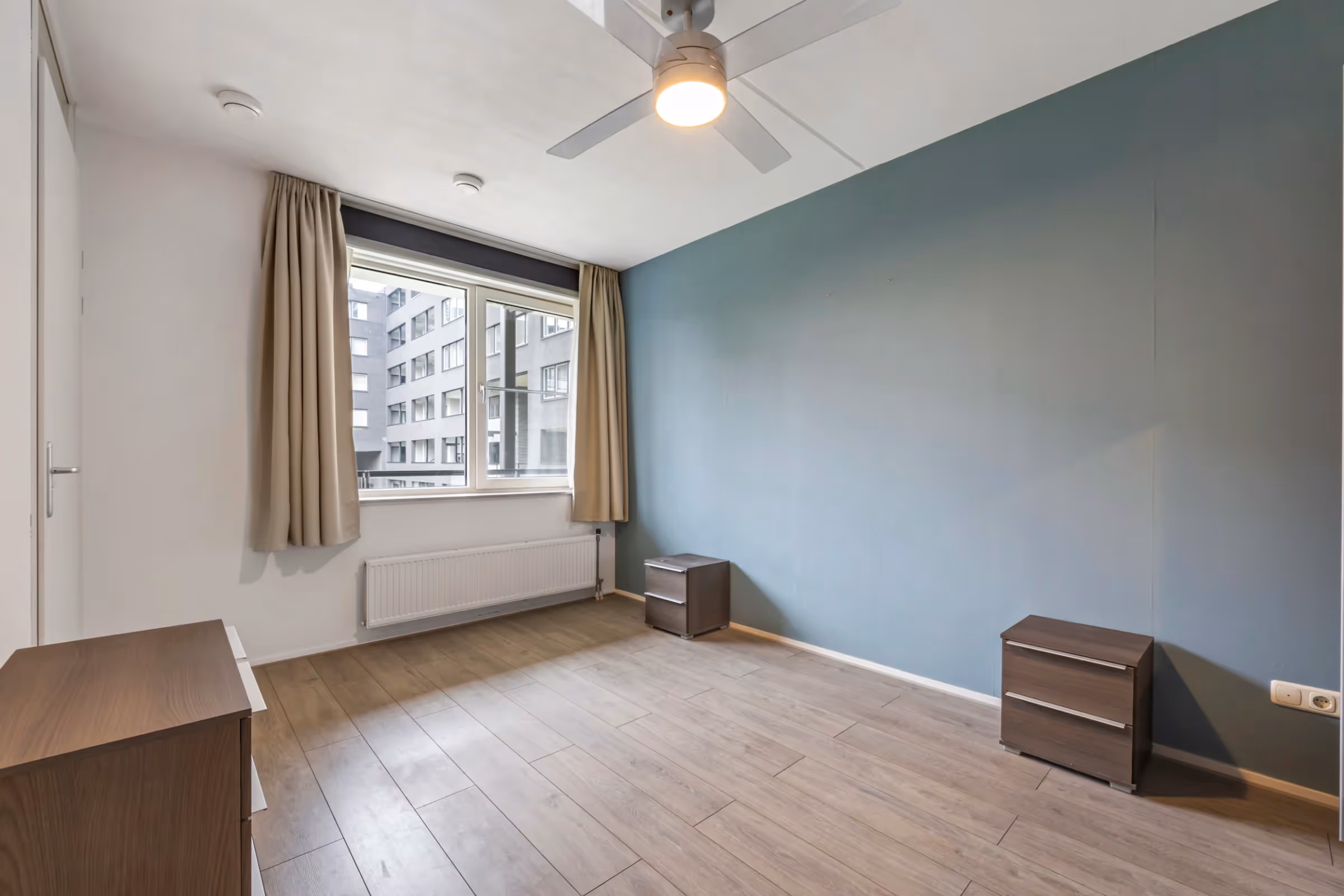 Tenslotte is vanuit de woonkamer de 2e slaapkamer te bereiken. Deze heeft eveneens een laminaatvloer en keurig niveau van afwerking. Het raam kijkt uit op de loggia. Vanuit de hal van dit appartement zijn de hoofdslaapkamer en de badkamer toegankelijk. Deze slaapkamer heeft hetzelfde niveau van afwerking als het gehele appartement, met wederom een nette wandafwerking en laminaatvloer. De badkamer tenslotte is voorzien van een wastafel en een douchecabine en is keurig onderhouden.