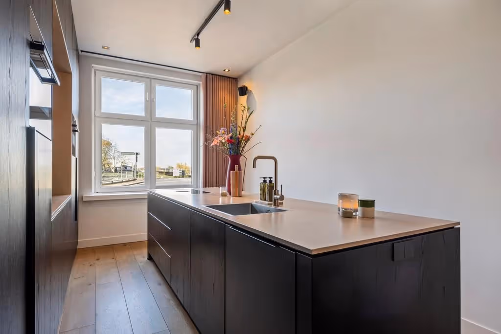 De luxe leefkeuken aan de voorzijde is een ware eyecatcher. Het kook- en spoeleiland met een hittebestendig keramisch blad, de op maat gemaakte kastenwand met koffiebar en de wijnklimaatkast met twee temperatuurzones maken het geheel compleet. De keuken is uitgerust met hoogwaardige inbouwapparatuur, waaronder een Bora inductiekookplaat met afzuiging, een royale koelkast, een grote diepvries, vaatwasser, wijnklimaatkast en twee ovens.
