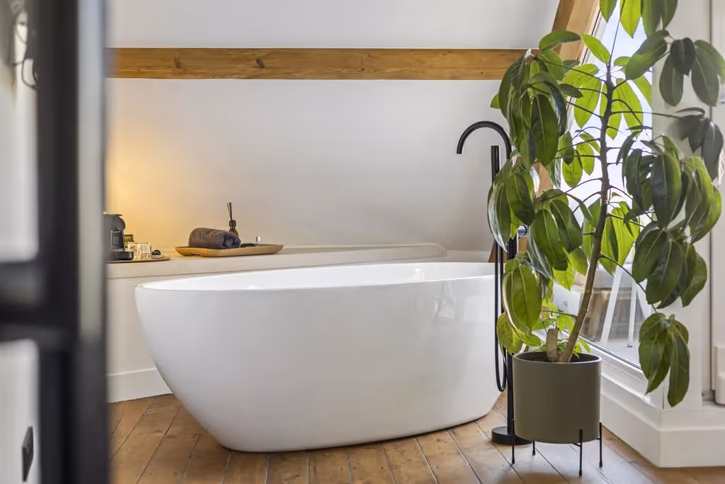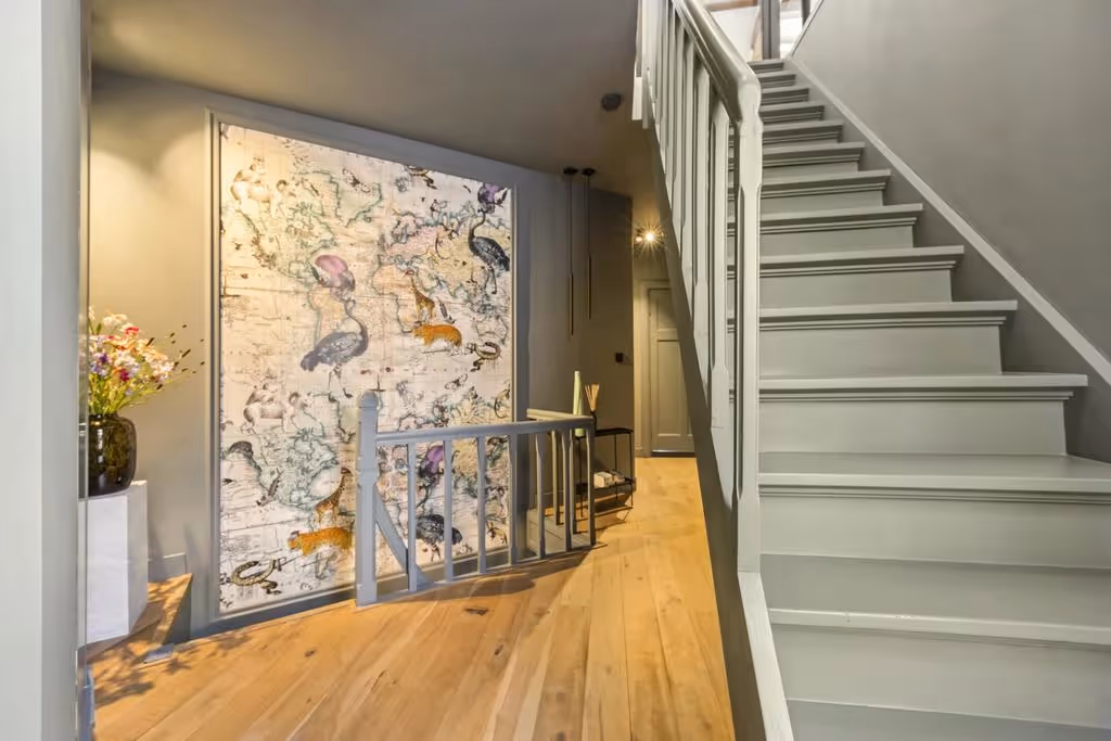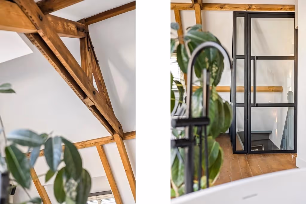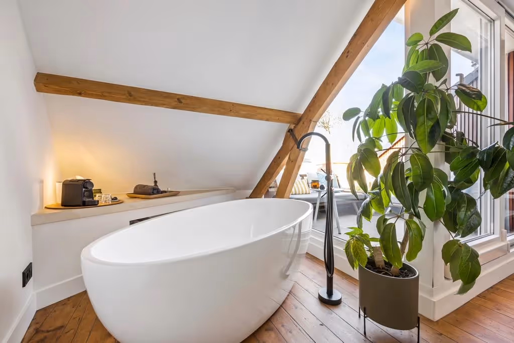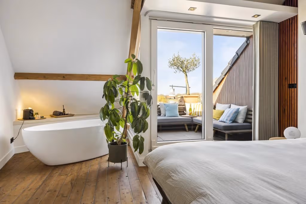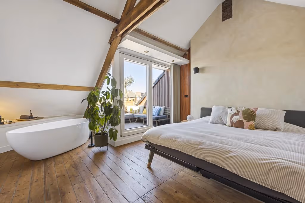 De fraaie houten trappartij loopt door tot de tweede verdieping. En net als je dacht al het moois van dit stadspand te hebben gezien, word je opnieuw verrast! Op deze verdieping ligt de master bedroom, met luxe, vrijstaand ligbad en misschien wel het meest bijzondere plekje van de woning: een prachtig dakterras met uitzicht over de Roerkade, tot aan de Maasplassen. Wat een plaatje!