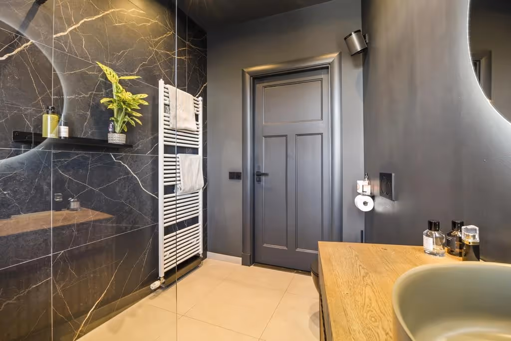 De badkamer, eveneens aan de voorzijde gelegen, heeft een grote inloopdouche, toilet, een wastafelmeubel en een radiator voor de handdoeken. Ook hier is gekozen voor een stijlvolle combinatie van kleuren en hoogwaardige materialen.