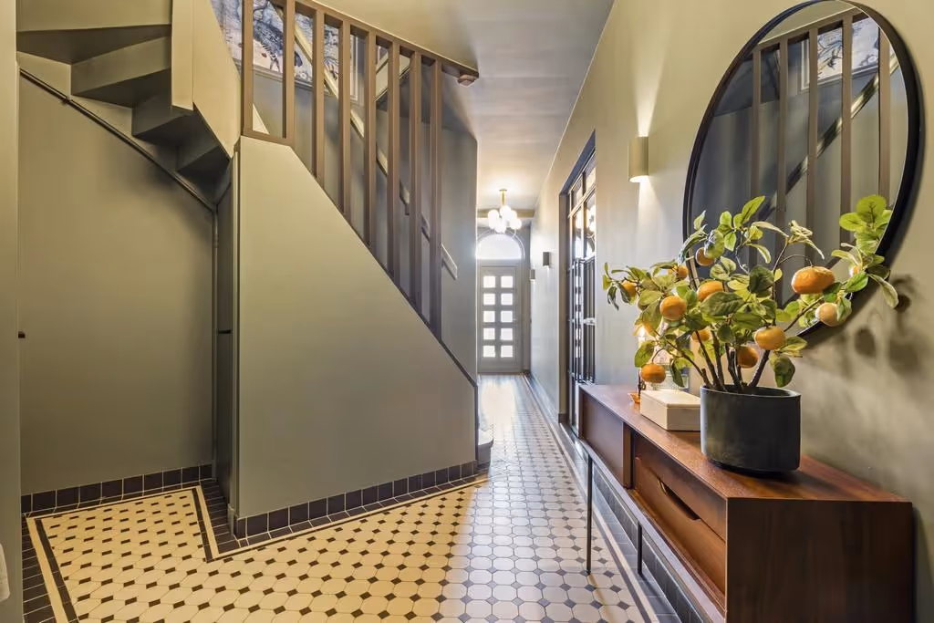 Bij binnenkomst valt direct de warme sfeer op. De combinatie van een fraaie tegelvloer, stijlvolle kleurstellingen en een elegante trappartij zet de toon. Vanuit de hal bereik je de woonkamer, de leefkeuken, het toilet (2023) met fonteintje, een bergkast met wasmachineaansluiting en het souterrain.