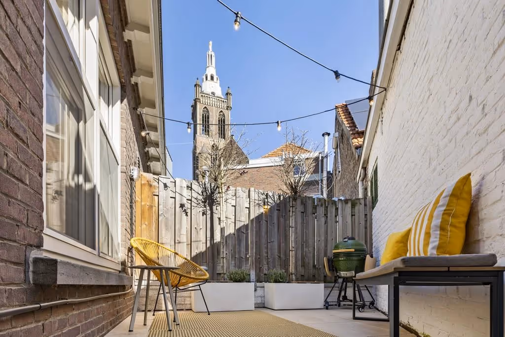 Het dakterras aan de achterzijde is mooi afgewerkt en sluit aan bij de rest van het woonhuis. Deze fijne plek biedt rust en privacy, ideaal om even te ontsnappen aan de stadse drukte. Met een prachtig uitzicht op de Sint-Christoffelkathedraal is dit een heerlijke plek om te ontspannen.