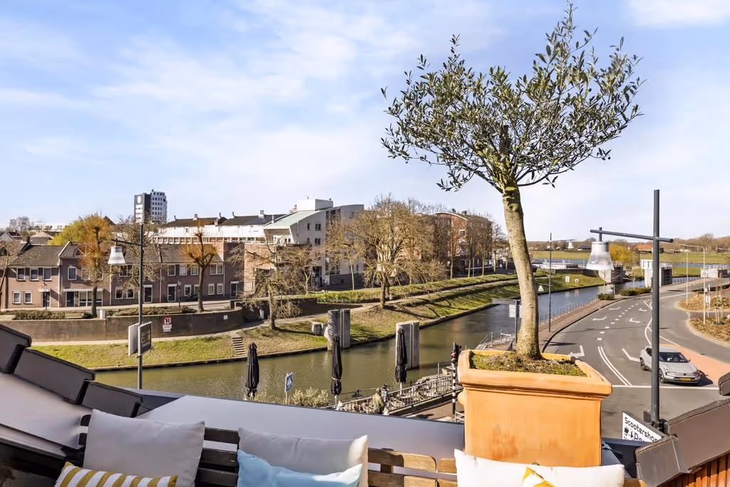 En last but not least: het dakterras aan de voorzijde. Deze biedt genoeg plaats voor jou en je vrienden om te genieten van heerlijke zomeravonden en schitterende zonsondergangen. Het uitzicht over de sfeervolle Roerkade, de charmante huizen aan de overkant en de vele bootjes op het water maakt dit een unieke plek. Dankzij de gunstige ligging van dit huis kijk je tot aan De Weerd en zie je ’s avonds de zon achter de Maas verdwijnen en met wakker worden de koeien in het veld aan de Maas.