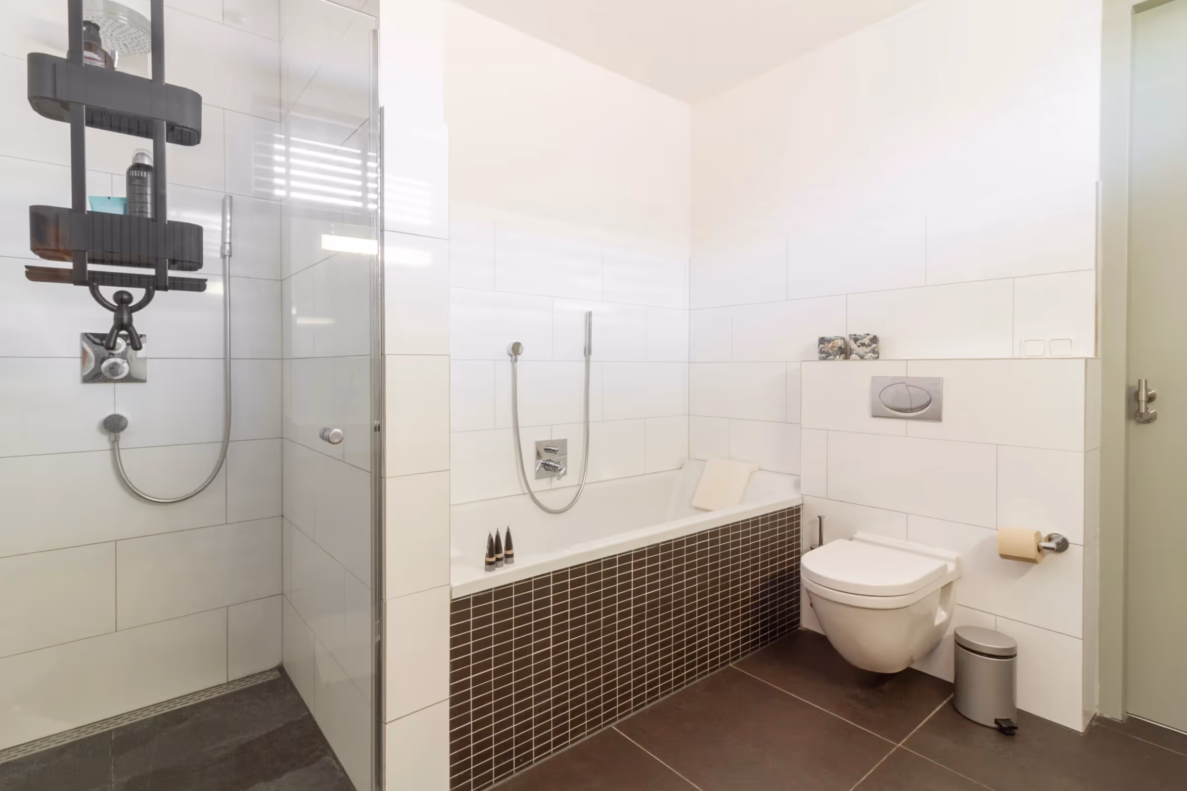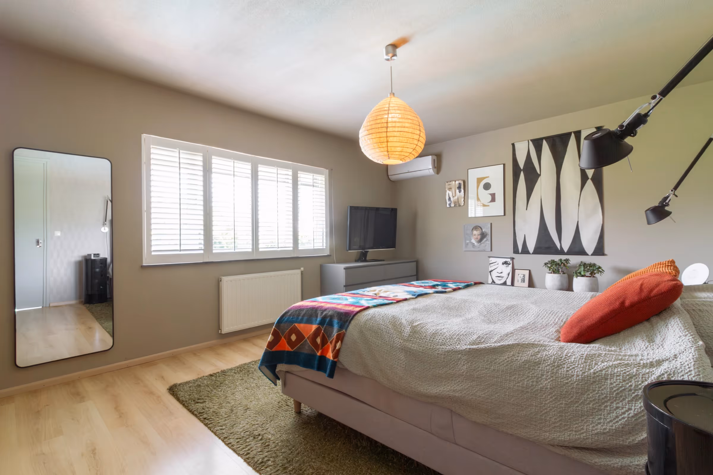 Zo zijn overal een nette wandafwerking, laminaatvloeren en splinternieuwe raamdecoratie aanwezig. De hoofdslaapkamer, gelegen aan de achterzijde van de woning, heeft een airconditioning en zijn eigen badkamer en suite. Deze royale badkamer is voorzien van een ligbad, inloopdouche, toilet en wastafelmeubel met dubbele wastafel. Ook herbergt deze badkamer een inbouwkast met schuifwanden. De 2e badkamer, toegankelijk vanaf de overloop, bestaat uit een wastafelmeubel, 3e toilet, douchecabine en comfortabele infrarood sauna. Tenslotte is op de overloop een royale kastenwand gelegen, waar de techniek is geplaatst. Hier bevinden zich de warmte-terug-win unit en CV combiketel (Nefit, eigendom, bouwjaar 2005).