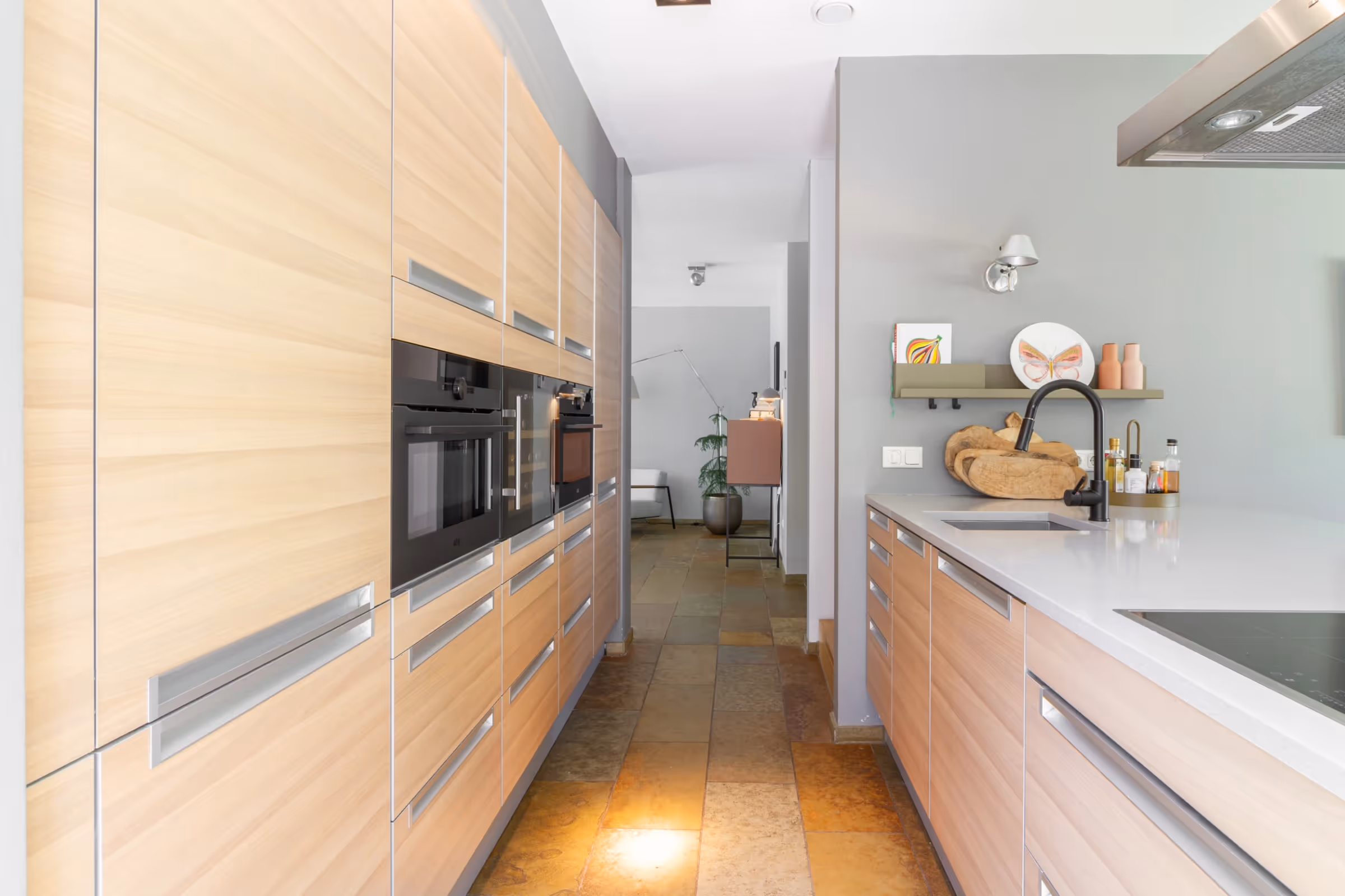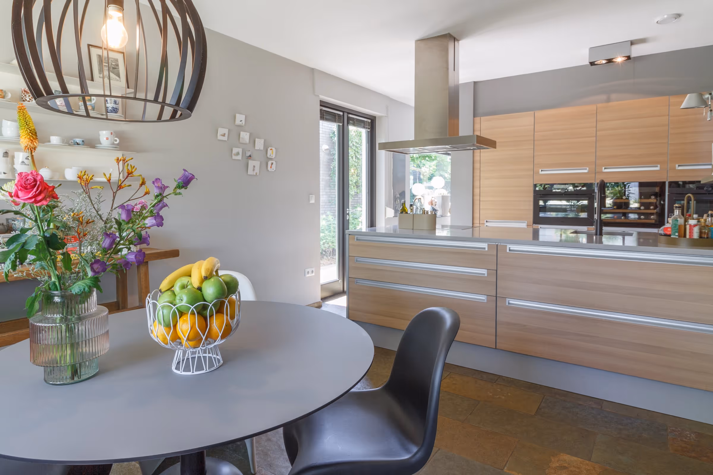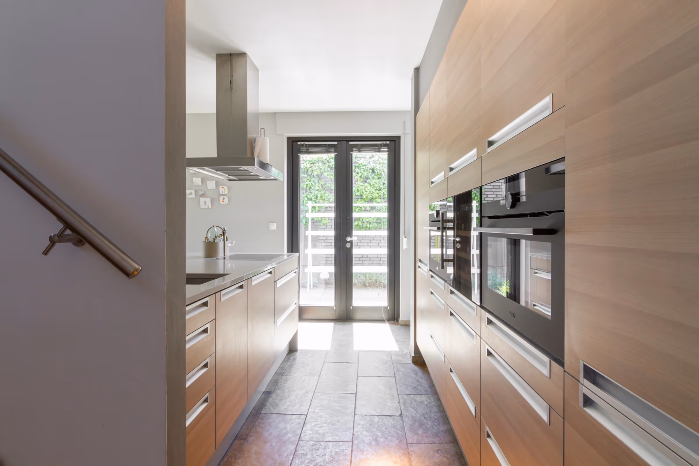 Vanuit de entreehal van dit luxe woonhuis zijn de diverse vertrekken te bereiken. De mooie woonkamer, gelegen aan de achterzijde, heeft een prachtig tuincontact, door maar liefst 4 openslaande tuindeuren. Aan de voorzijde is de leefkeuken gelegen, uiteraard van alle gemakken voorzien en met een kook- en spoeleiland. Voorts zit de volgende inbouwapparatuur in de keuken: een inductiekookplaat met afzuigkap, 2 combi magnetrons, welke mooi symmetrisch links en rechts naast de wijnklimaatkast zijn geplaatst, een koelvries combinatie, en een vaatwasser. De gehele begane grond beschikt over een tijdloze, natuurstenen vloer. Tenslotte is in de hal nog het gastentoilet gelegen en is vanuit deze hal ook de inpandige berging bereikbaar. In de berging zijn aansluitpunten voor het witgoed aanwezig.