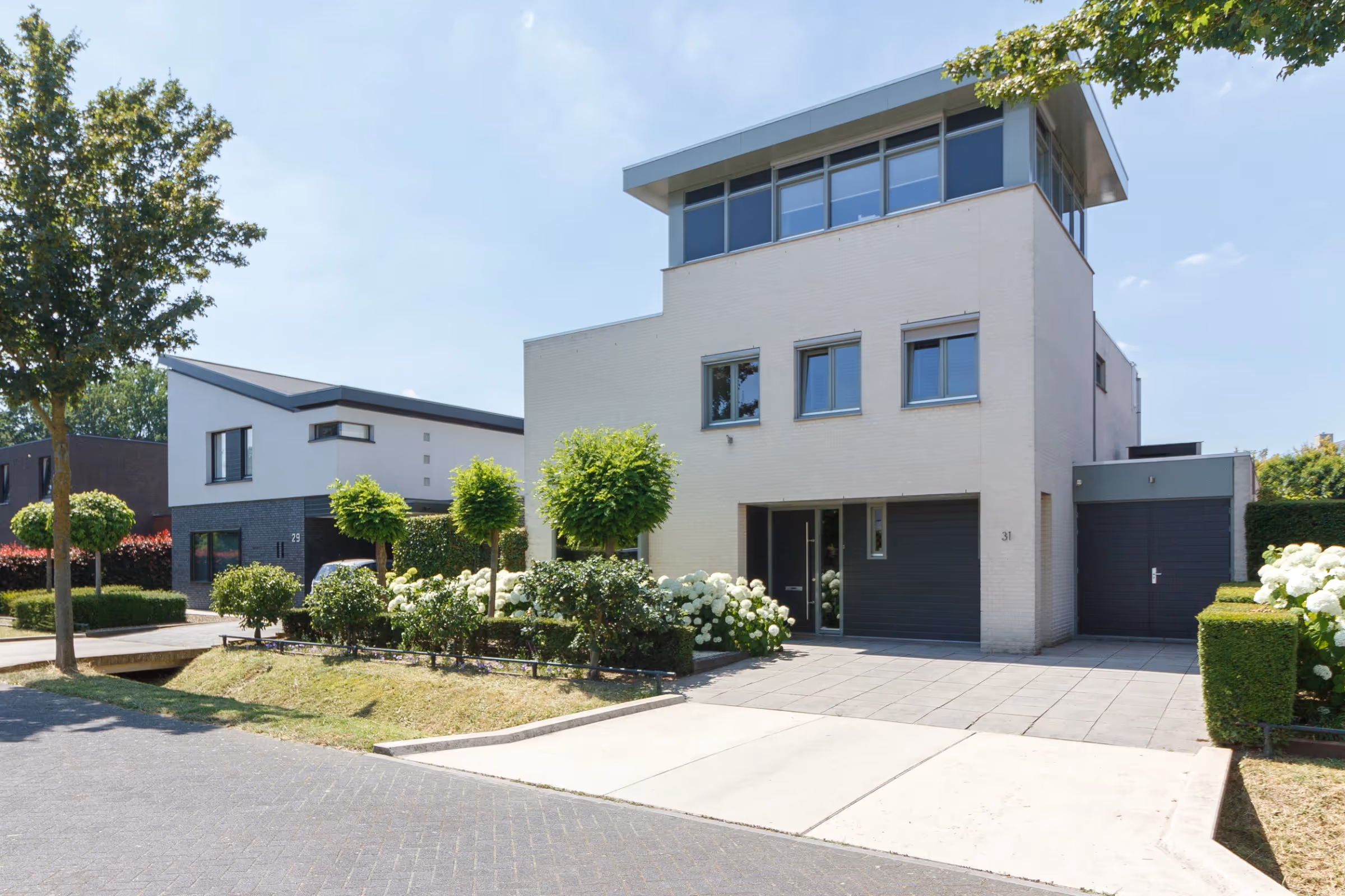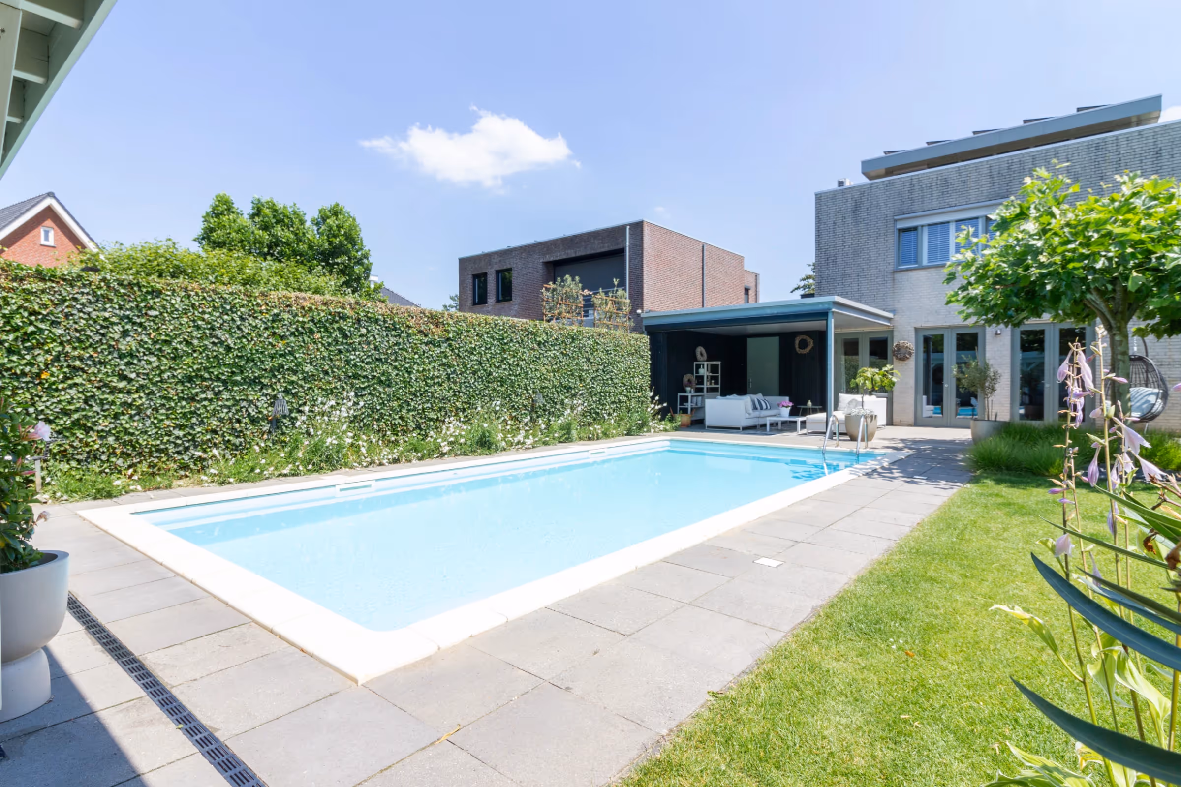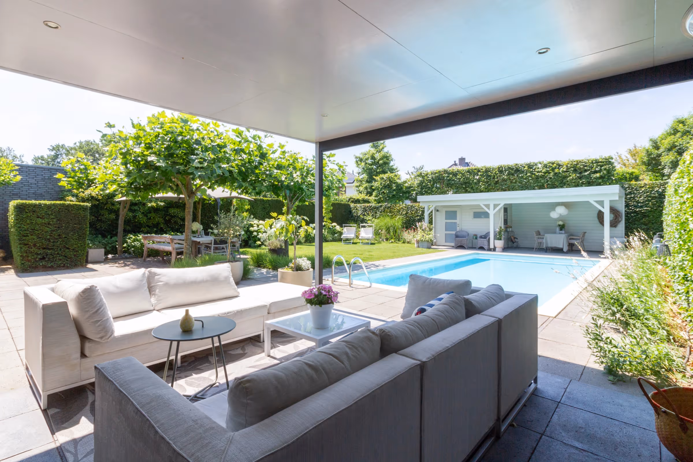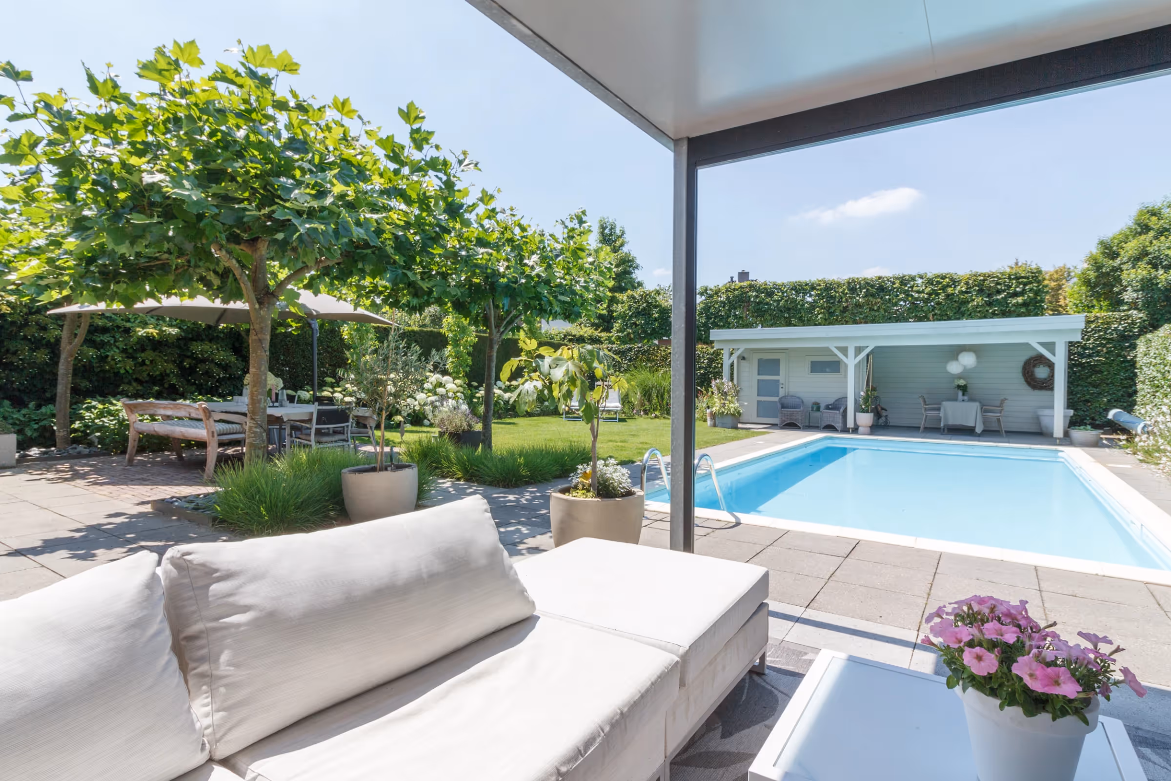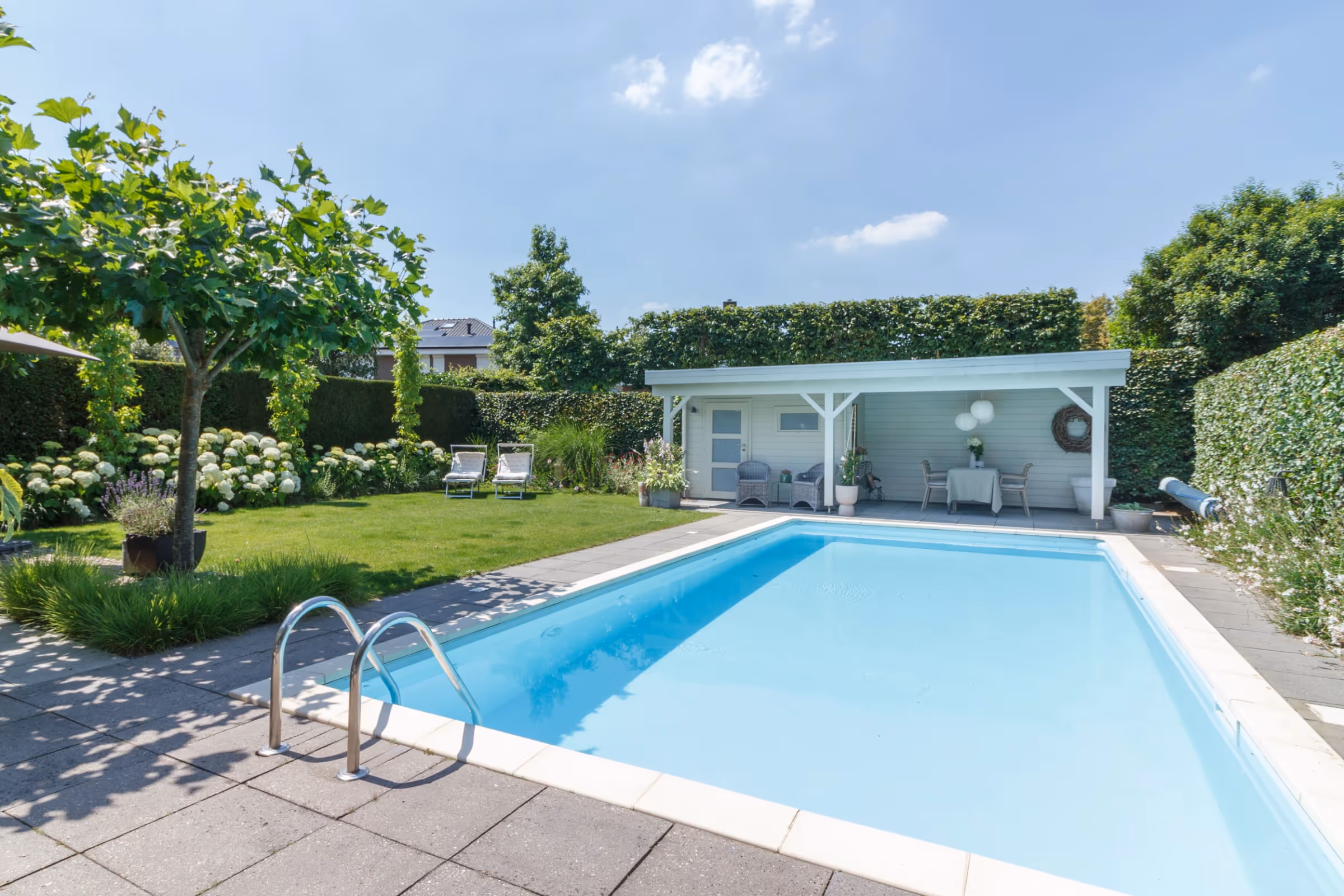 De volwassen tuin is een oase van rust en privacy, met een mooie balans tussen beplanting, terras en gazon en als de kers op de taart, het prachtige zwembad. Op zonnige dagen is het hier heerlijk vertoeven. De tuin is gesitueerd op het Westen en heeft een eigen achterom. In de tuin bevindt zich een houten poolhouse met terrasoverkapping en ook aan het woonhuis zit een riant, overdekt terras. Aan de voorzijde heeft deze stijlvolle villa tenslotte een ruime oprit, geschikt voor meerdere voertuigen.