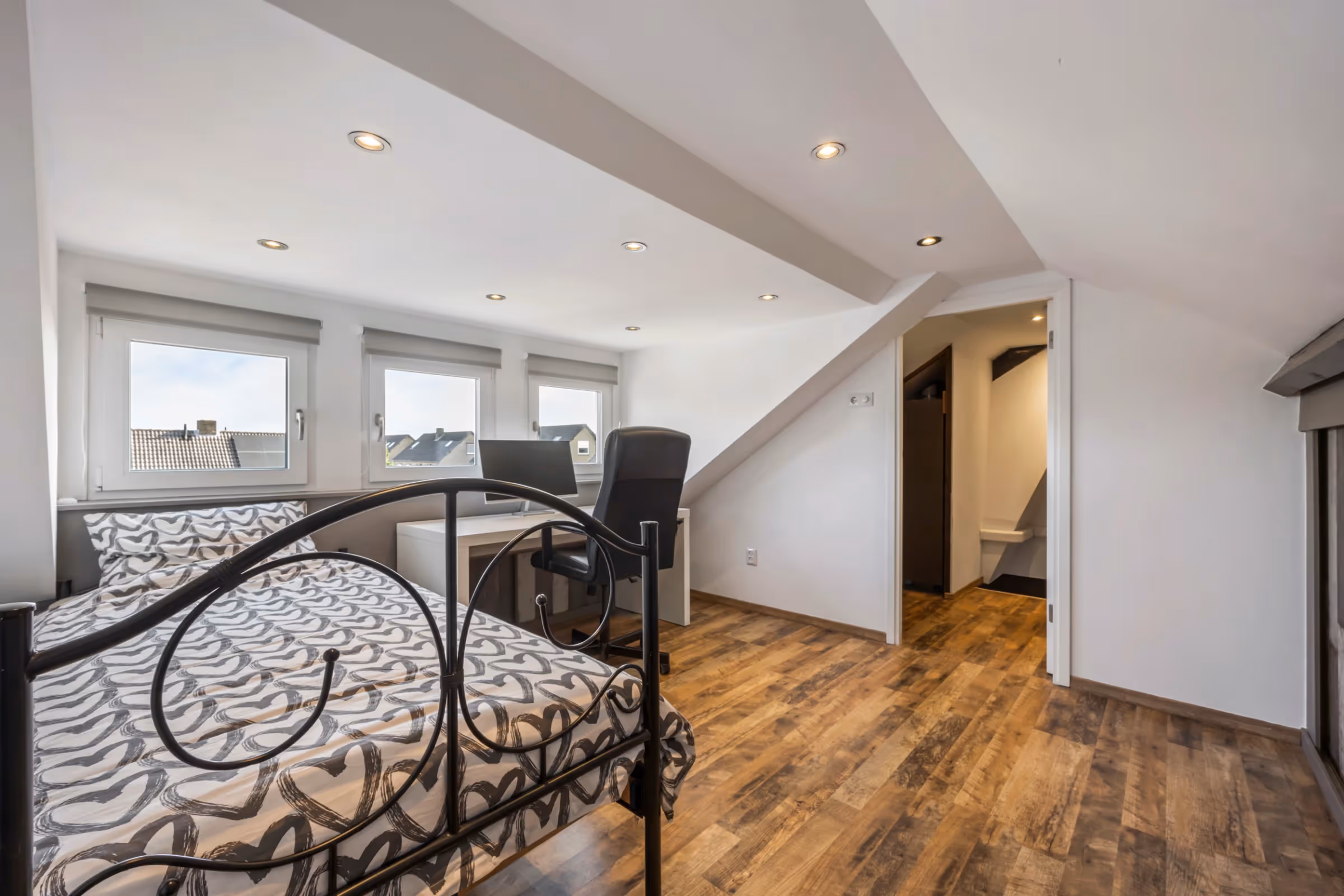Via een vaste trap is de zolderverdieping bereikbaar. Deze verdieping heeft een overloop en een extra slaapkamer. De slaapkamer heeft een grote dakkapel aan de achterzijde en net zo’n keurig niveau van afwerking als de andere slaapkamers. Verder is op deze zolderverdieping een bergruimte, waar de CV combiketel is geplaatst (Nefit, eigendom, 2015) en hangt hier een jonge airco (2023) die zowel de eerste verdieping als de zolderverdieping kan koelen en verwarmen.