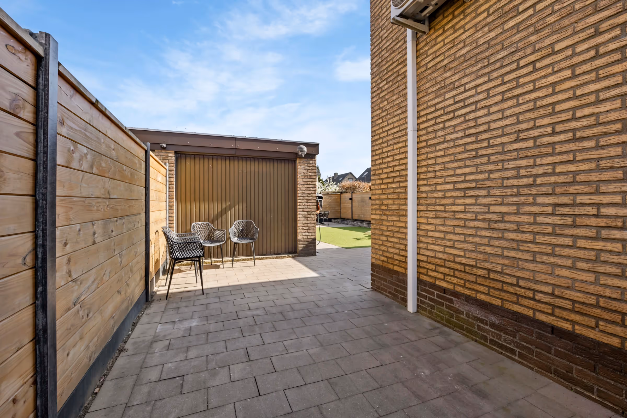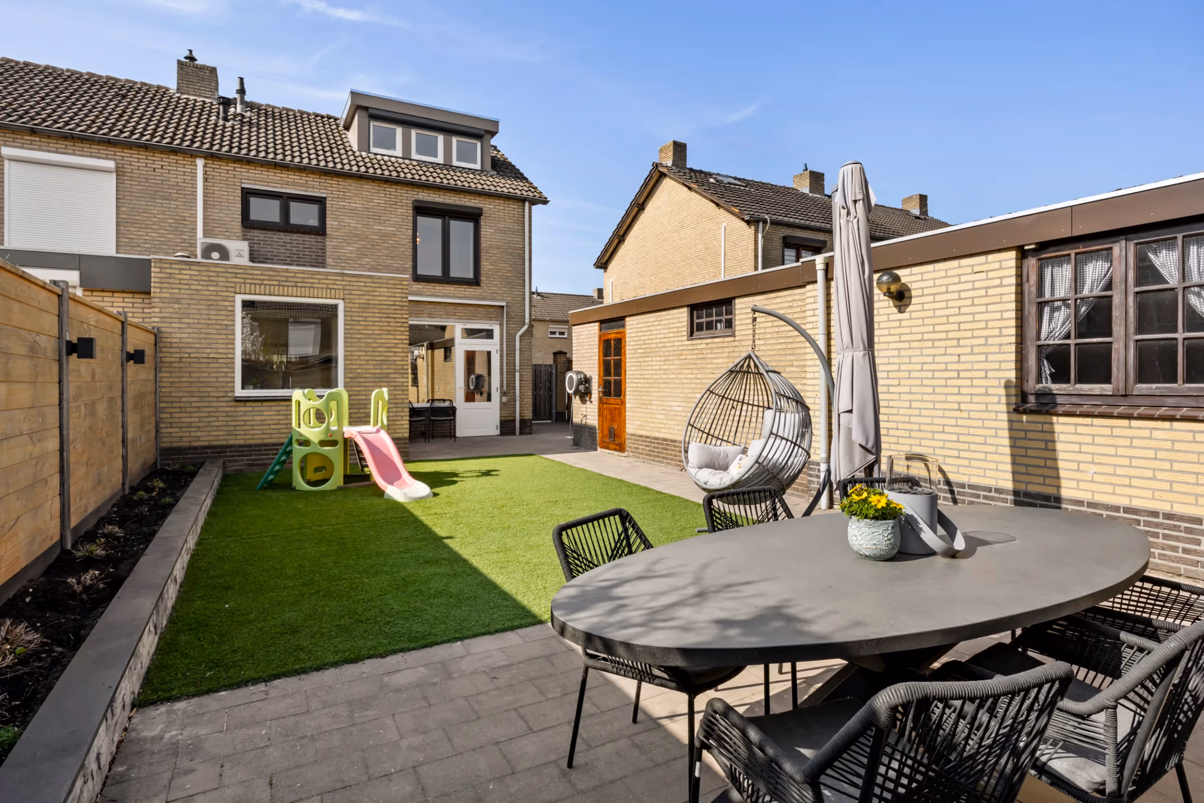 Deze fijne woning heeft ook nog eens een hele mooie achtertuin, welke bestaat uit twee terrassen en een groot kunstgras gazon. De tuin is geheel omheind en hier ligt ook nog eens een riante, vrijstaande garage, welke is uitgebreid aan de achterzijde. Deze garage is maar liefst 32 m² groot en hier is momenteel het witgoed geplaatst. Tenslotte ligt aan de voorzijde een oprit, waar meerdere auto’s kunnen worden geplaatst.
