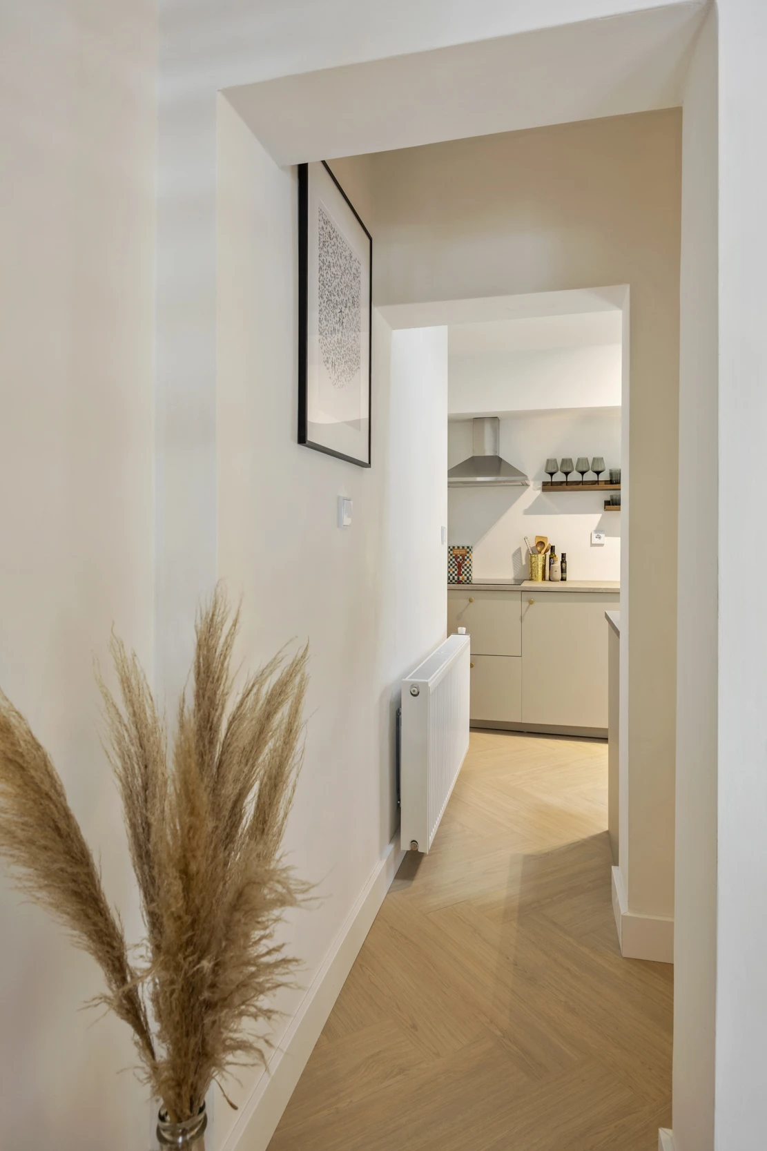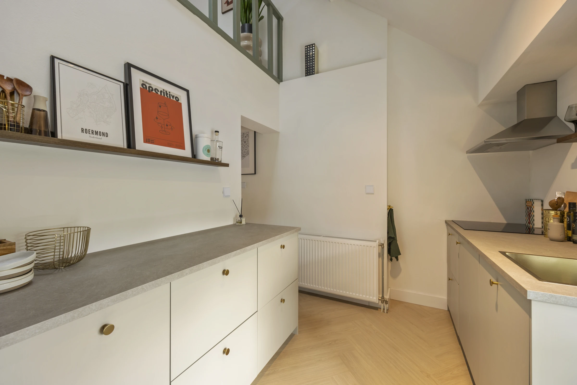 Het appartement zelf ligt op de 1e met daarboven nog een entresol. Je komt binnen in de woonkamer, welke aan de voorzijde is gelegen. Door de hoge plafonds en de vide voelt het appartement ruim en licht aan. De splinternieuwe keuken is nog helemaal ongebruikt en ligt aan de achterzijde. Verder heeft deze keuken veel werkruimte en de volgende inbouwapparatuur: een 4-pits inductiekookplaat, RVS afzuigkap, koelkast en 1 persoonsvaatwasser. Ook is in de keuken een bergkast gelegen, waarin de CV combiketel is geplaatst (Nefit, eigendom, 2017). Tenslotte ligt op deze verdieping nog de badkamer, welke bestaat uit een toilet, wastafelmeubel en inloopdouche. Het gehele appartement is fris geschilderd en de mooie vloer is net zo nieuw als de keuken.